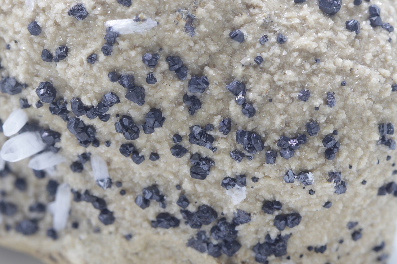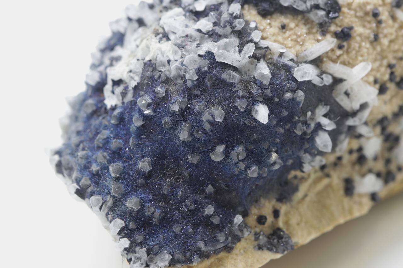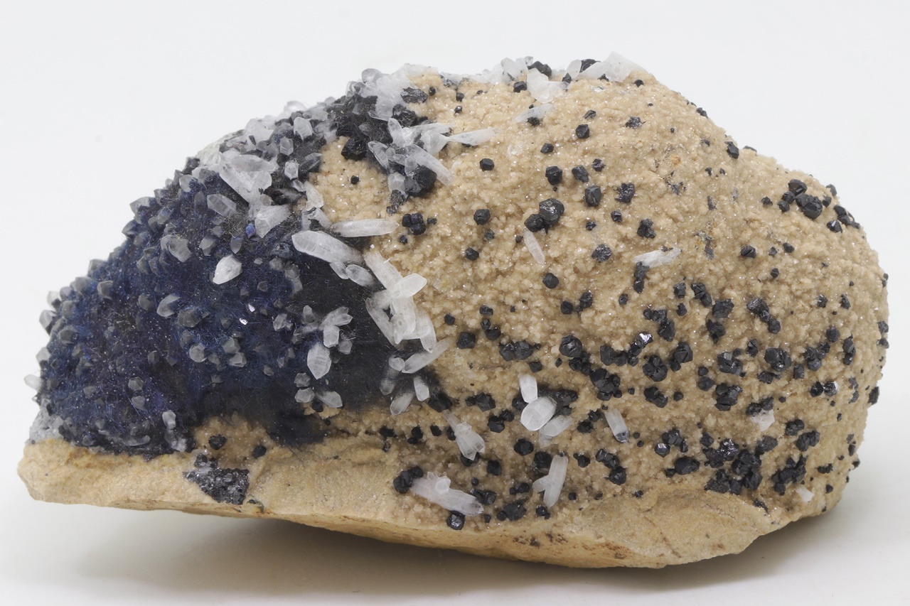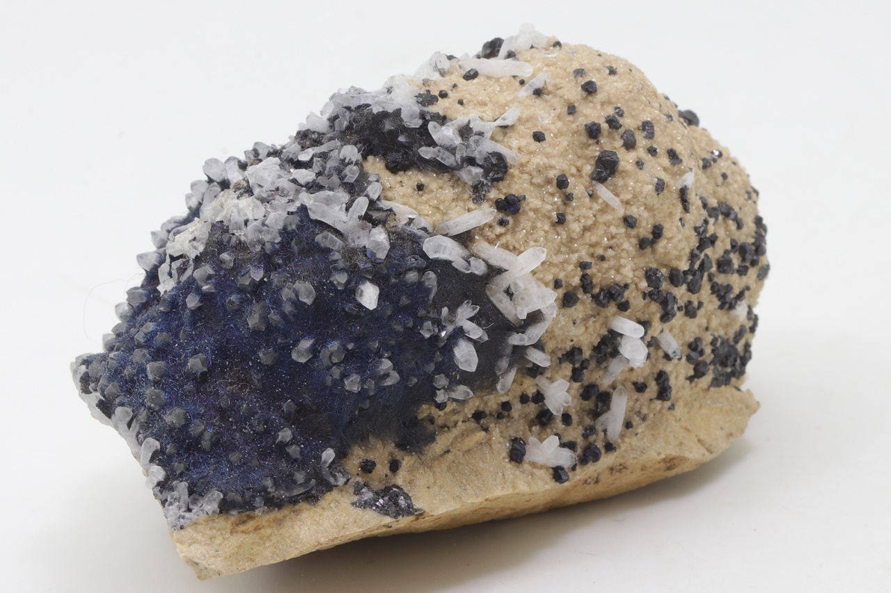 Boulangerite aggregates with black sphalerite crystals and quartz grown on beige dolomite.