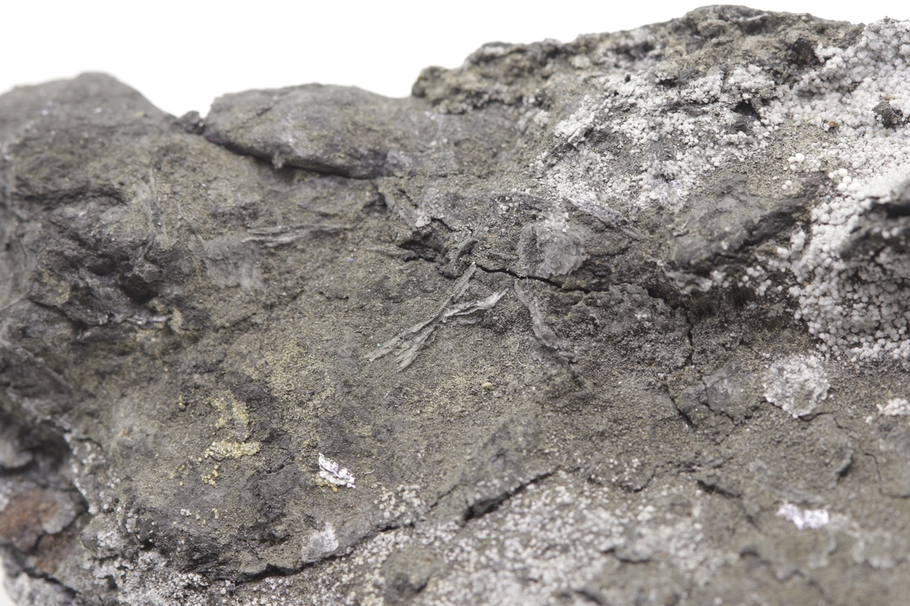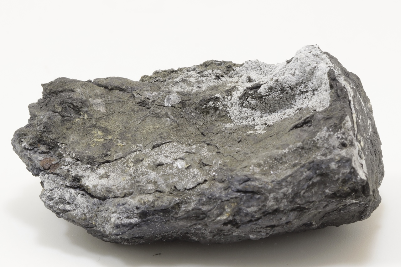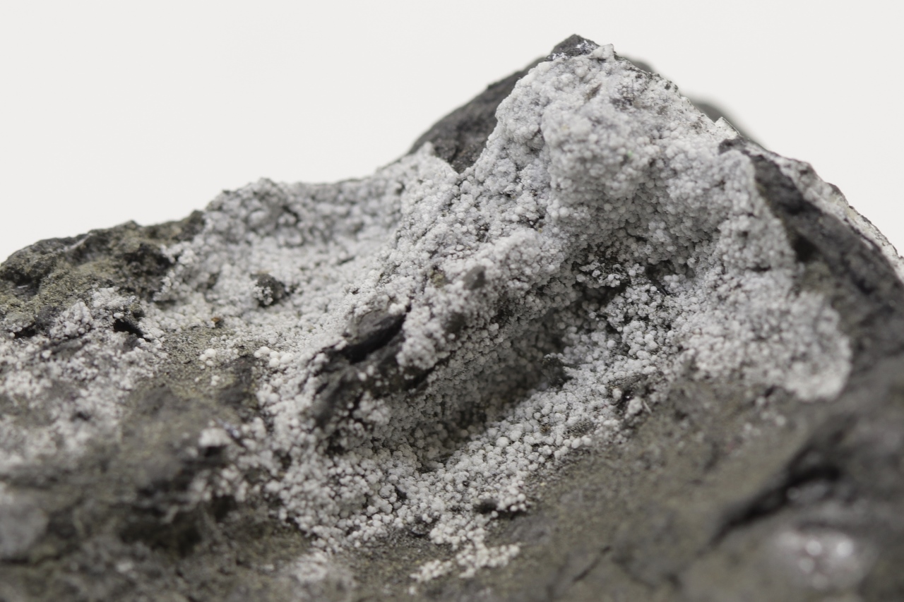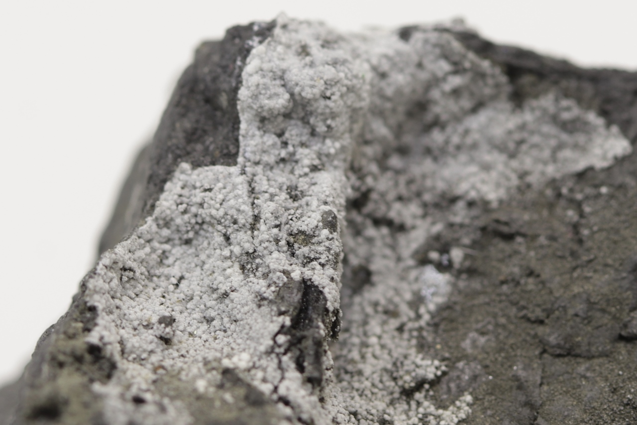 Brandholzite forms colorless, elongated tabular to foliated aggregates, which sit on a dark gray substrate rock. Many of these aggregates also grow together and strikingly resemble open scissors. This is a fine example of this mineral from the locality Pezinok, Slovakia.