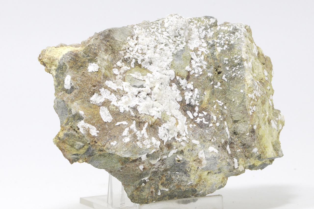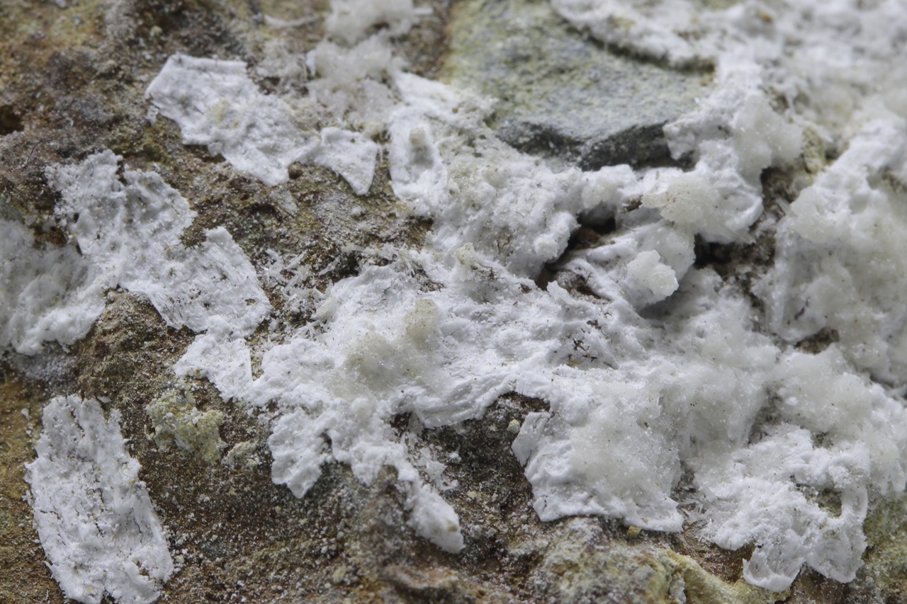 White flat crystals of brassite up to 8 mm large with acicular aggregates of pharmacolite.