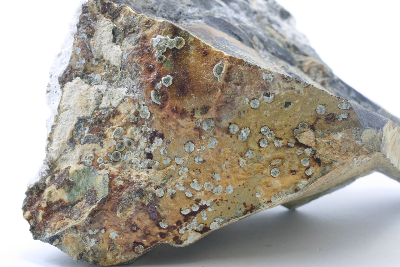 Exceptionally large crystals of magnesium arsenate – brassite from the type locality (the largest is 1.5 cm). On the other side, there are several “suns” of iron arsenate – brasite attached (the largest is 2 mm). The specimen comes from the Geschieber vein, Daniel level .