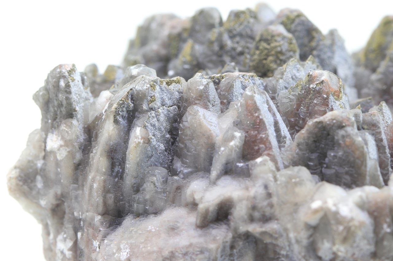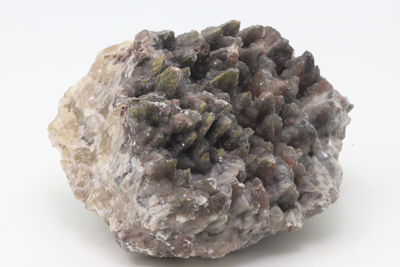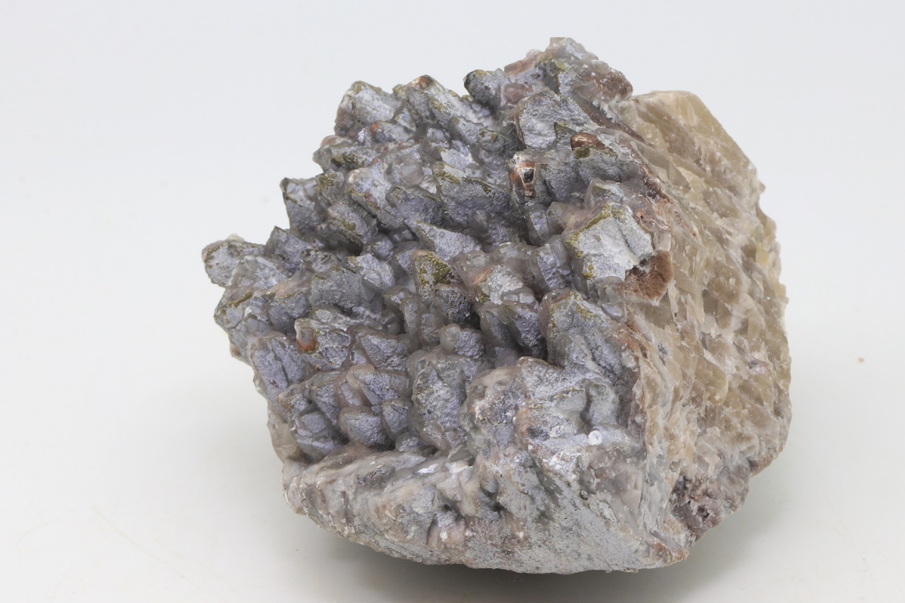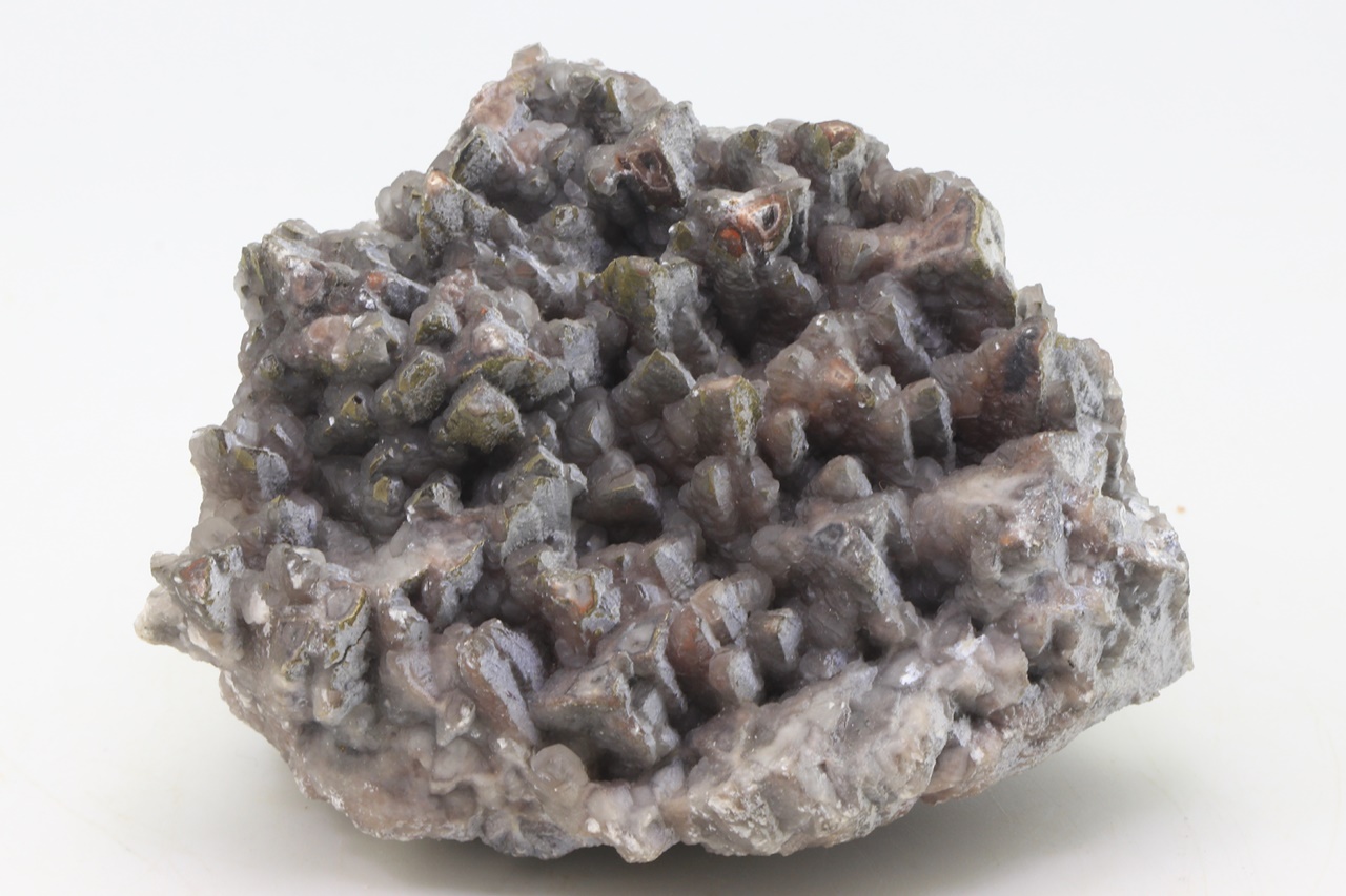 Druse of scalenohedral calcite crystals partially covered with tiny pyrite crystals.
