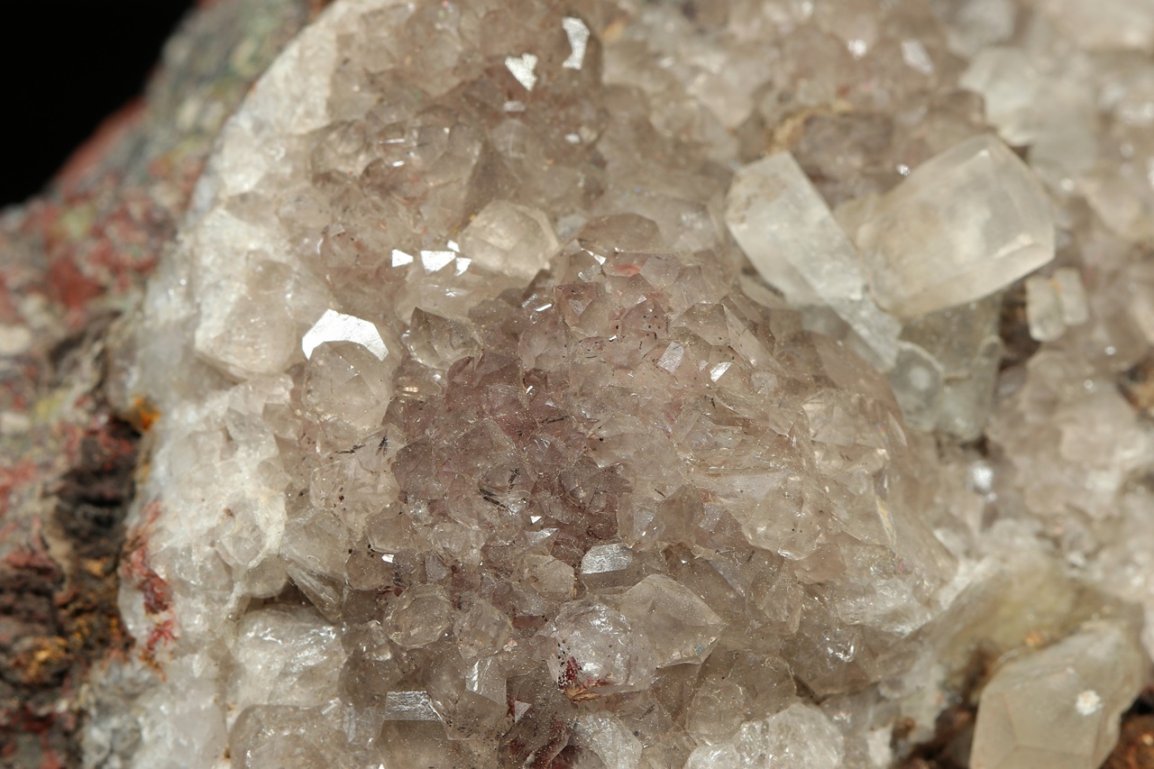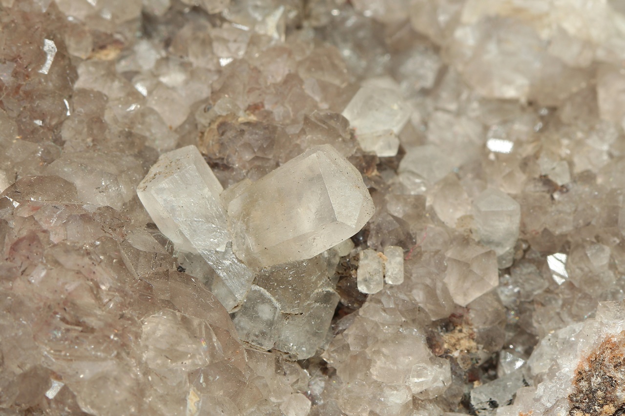 Calcite crystals with unusual prismatic development grown on a druse of light brown. The largest crystal is 1 cm in size.