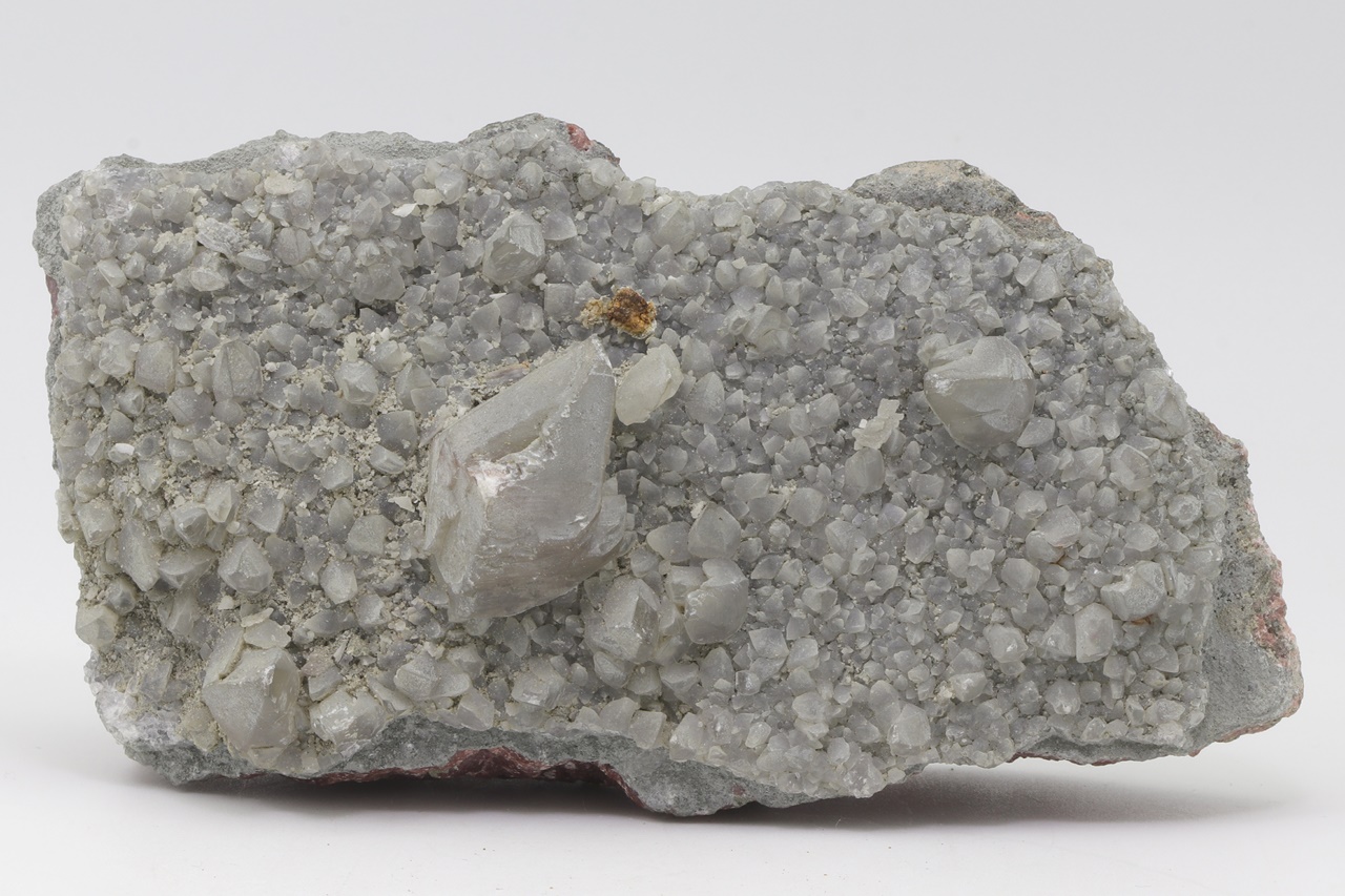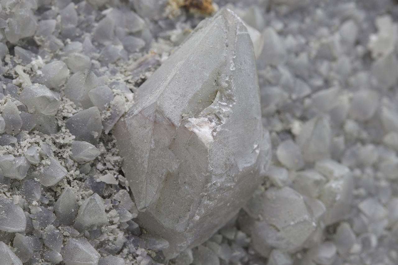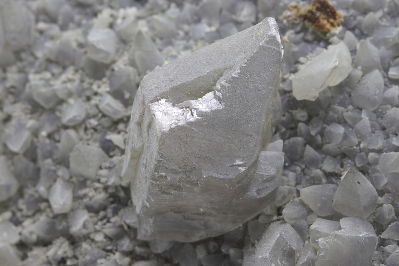 Cluster of gray scalenoedric calcite crystals with a prominent 3.5 cm specimen in the middle of the sample.