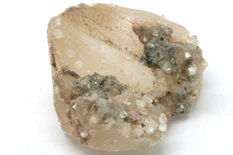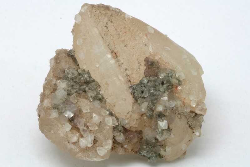 Sample of calcite and apophyllite from the Poona locality, India. Sample of clear perfectly cleavable calcite overgrown with apophyllite crystals.