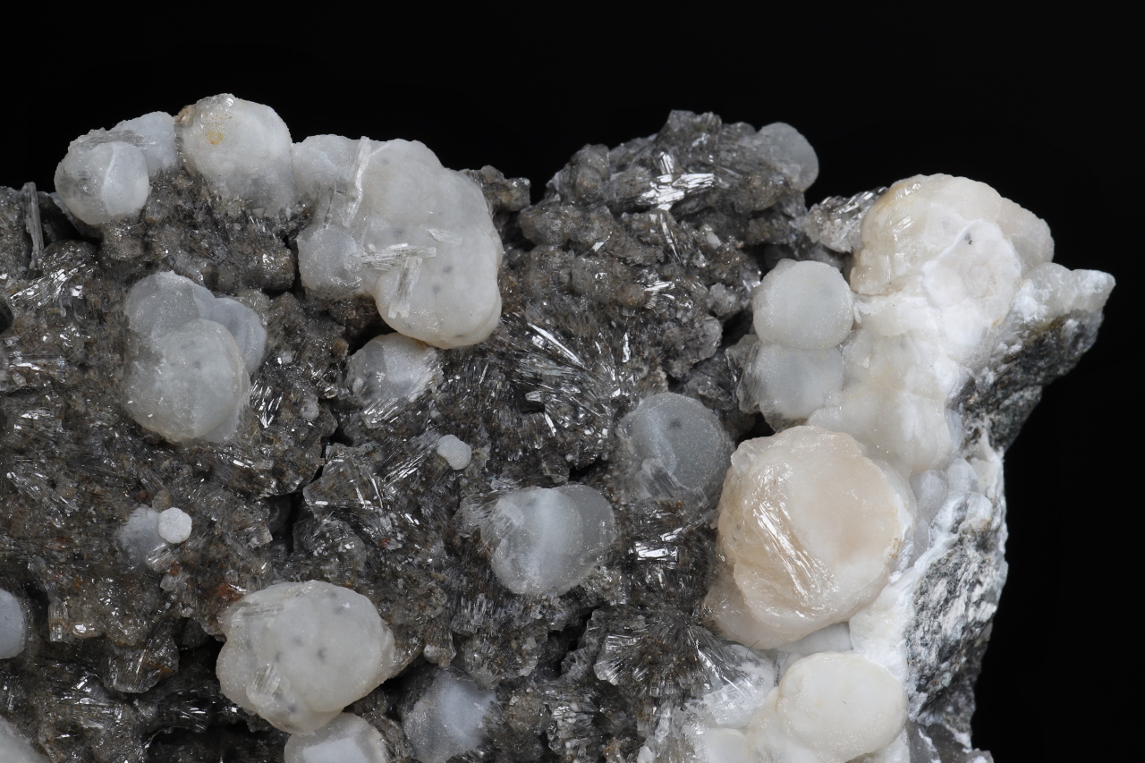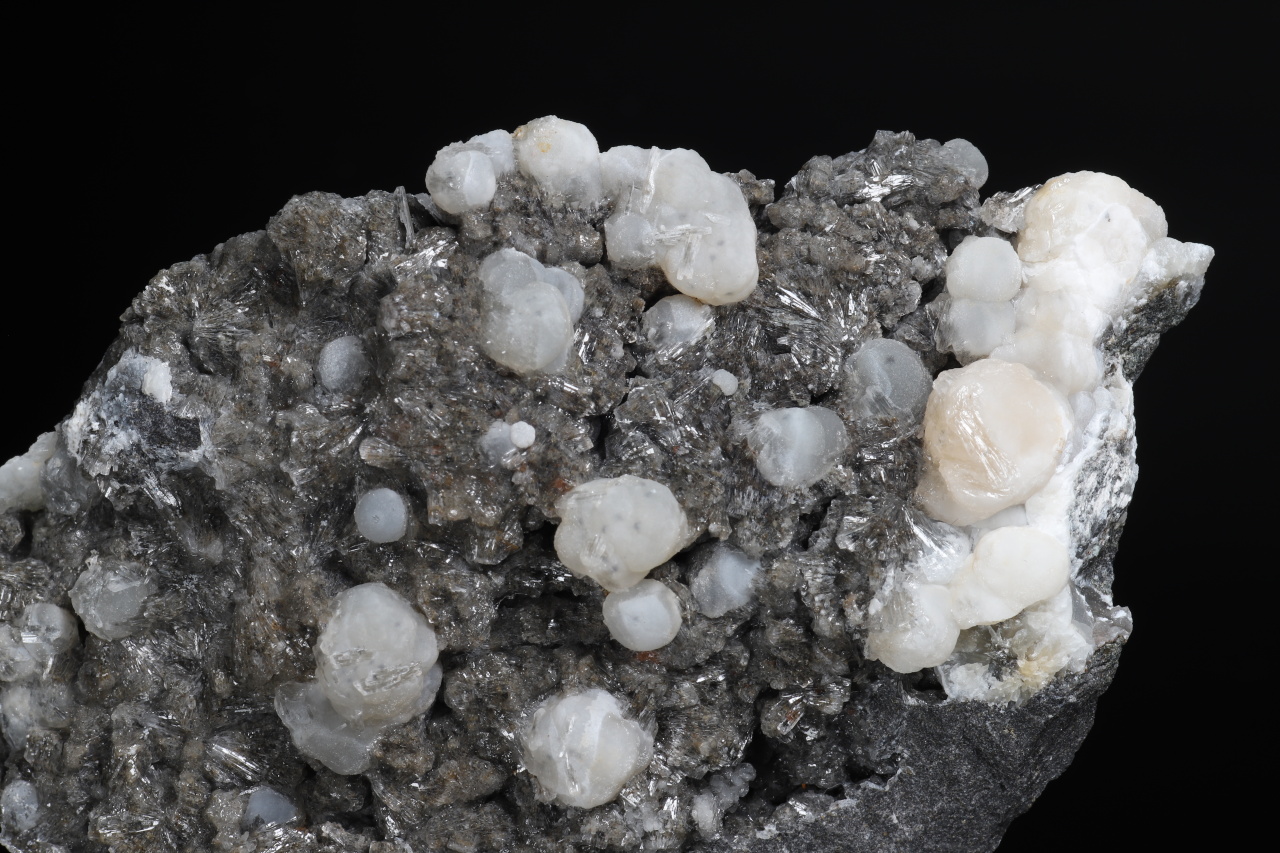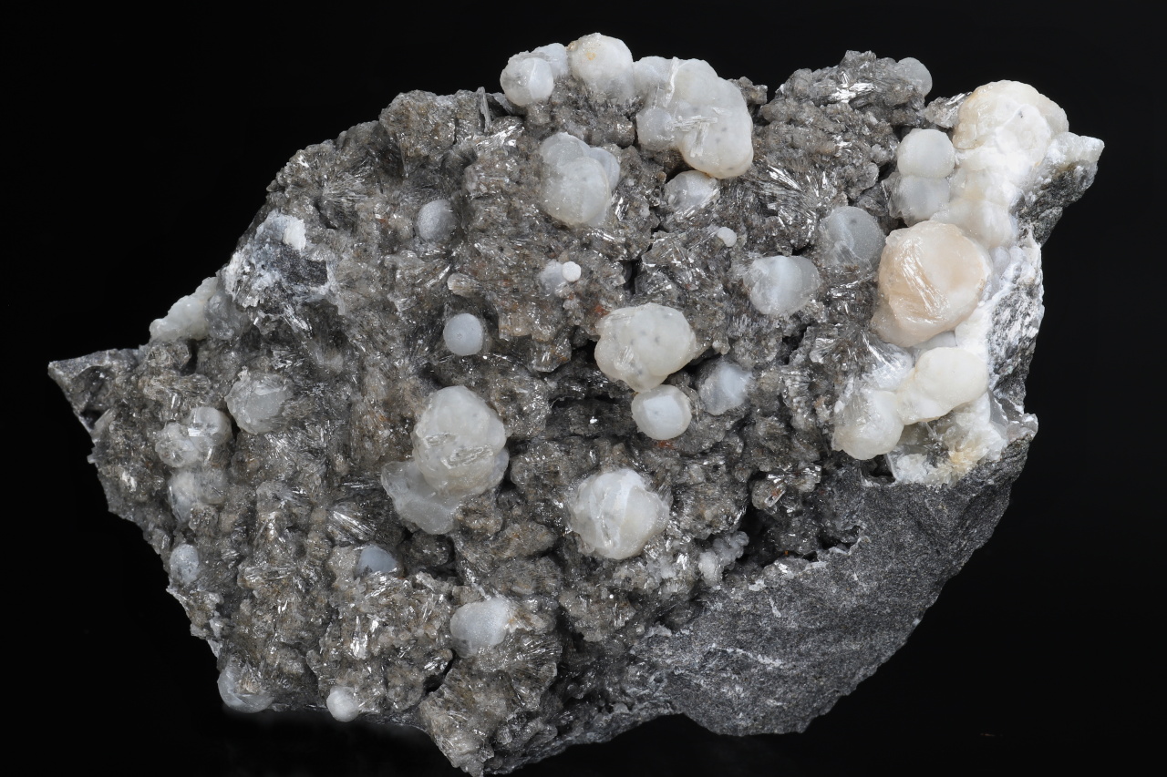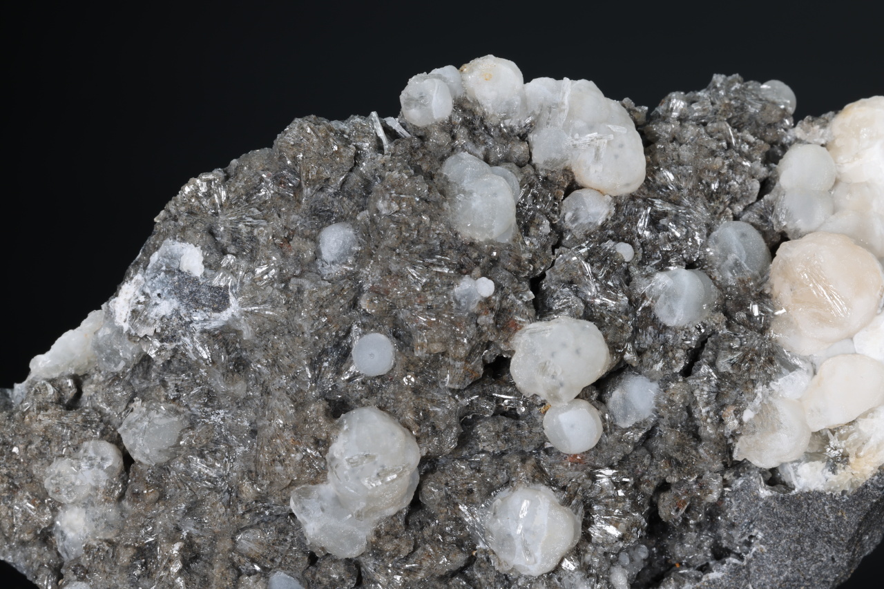 A druse of white to light orange spherical aggregates of calcite up to 11 mm in size along with clear crystals of aragonite broadly growing on the sample. An aesthetic sample of carbonates from the Velké Dravce quarry in Slovakia.