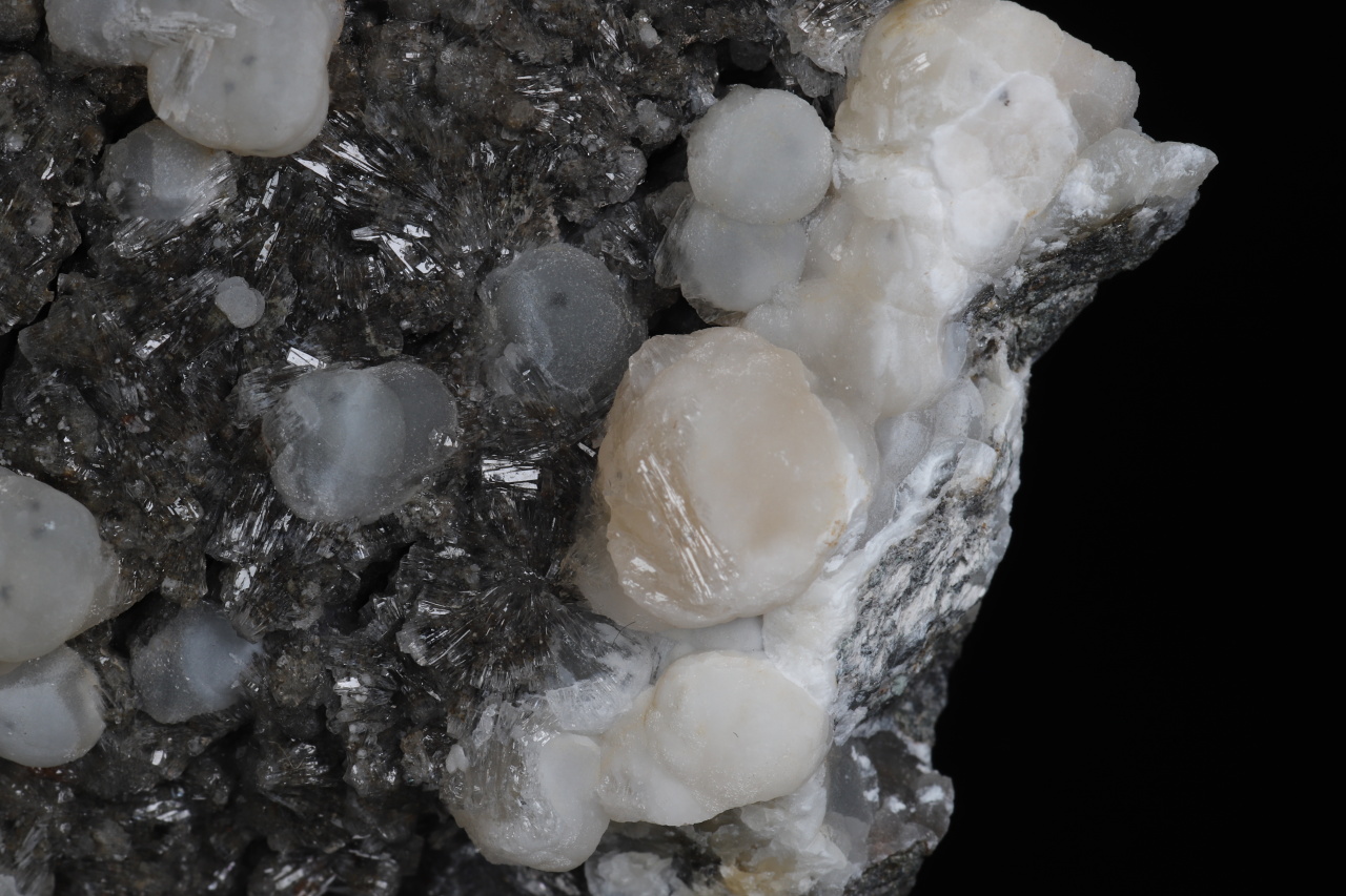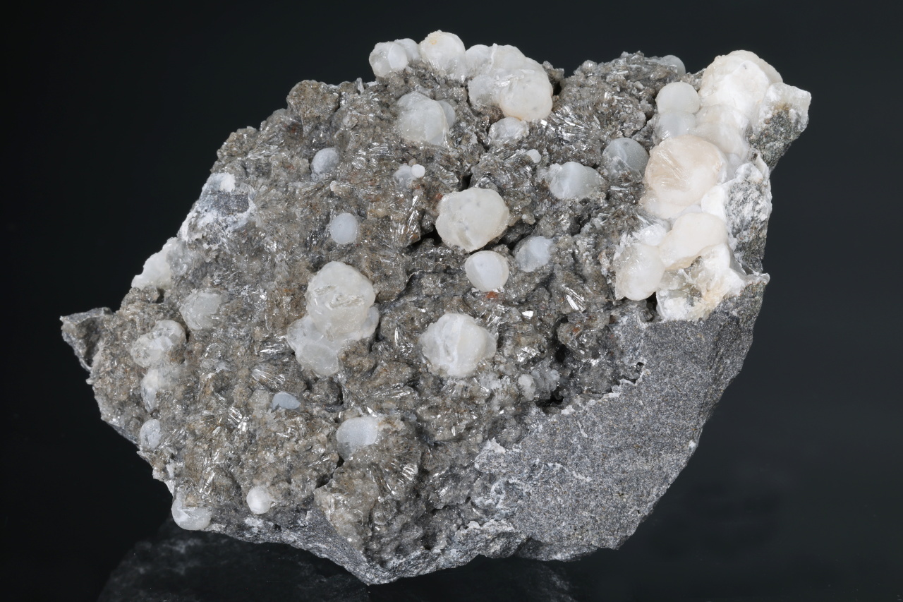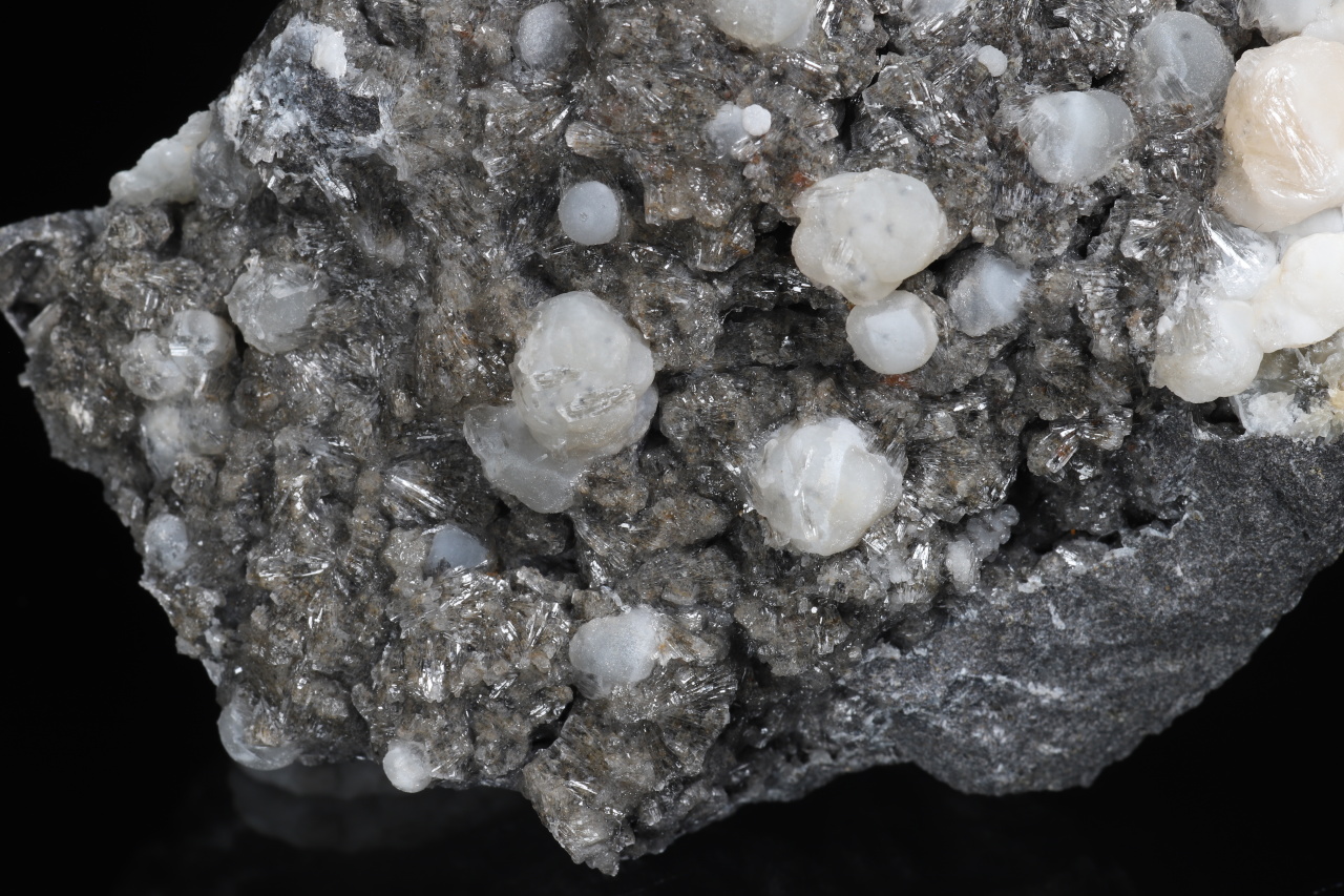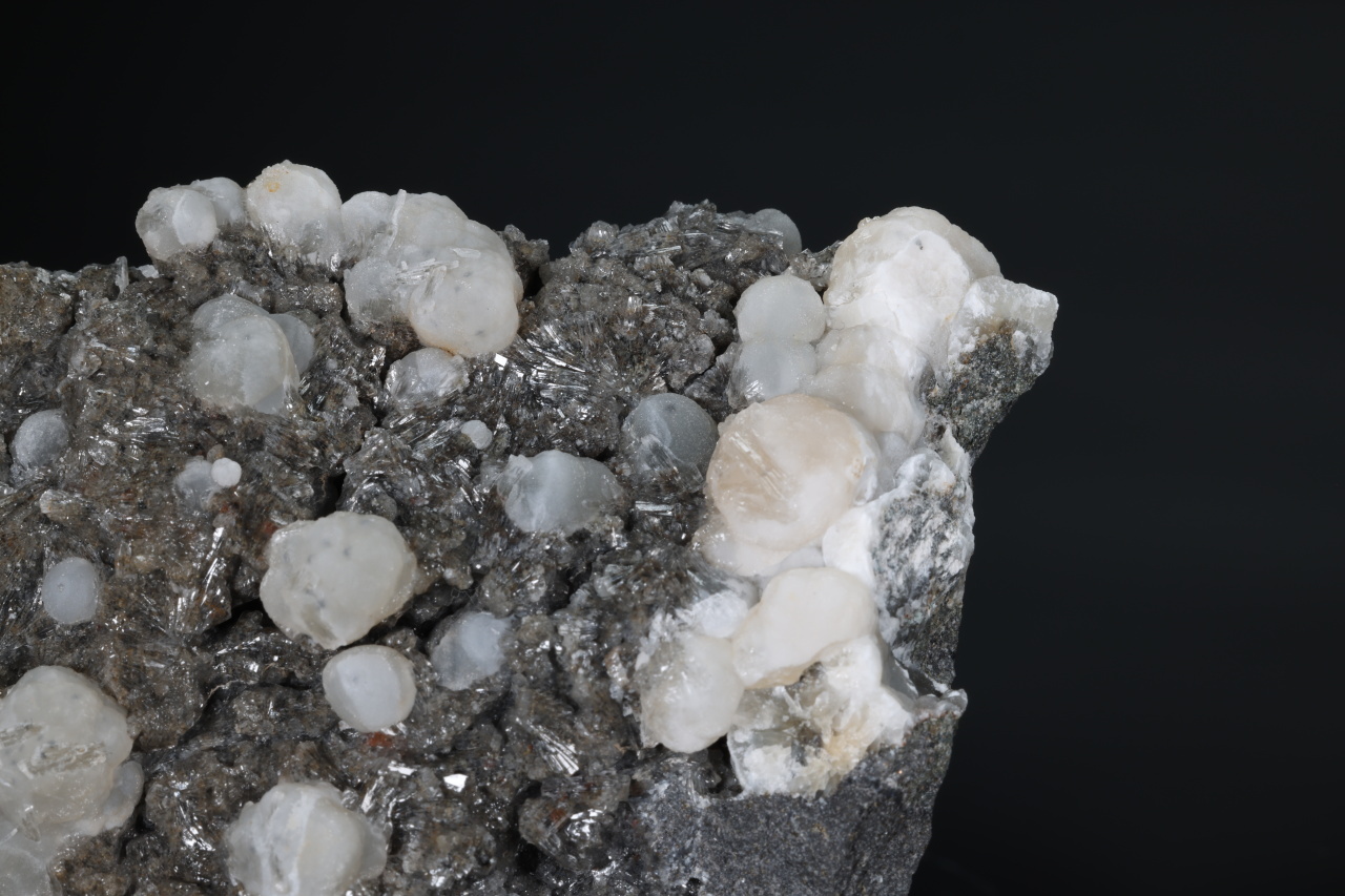 A druse of white to light orange spherical aggregates of calcite up to 11 mm in size along with clear crystals of aragonite broadly growing on the sample. An aesthetic sample of carbonates from the Velké Dravce quarry in Slovakia.