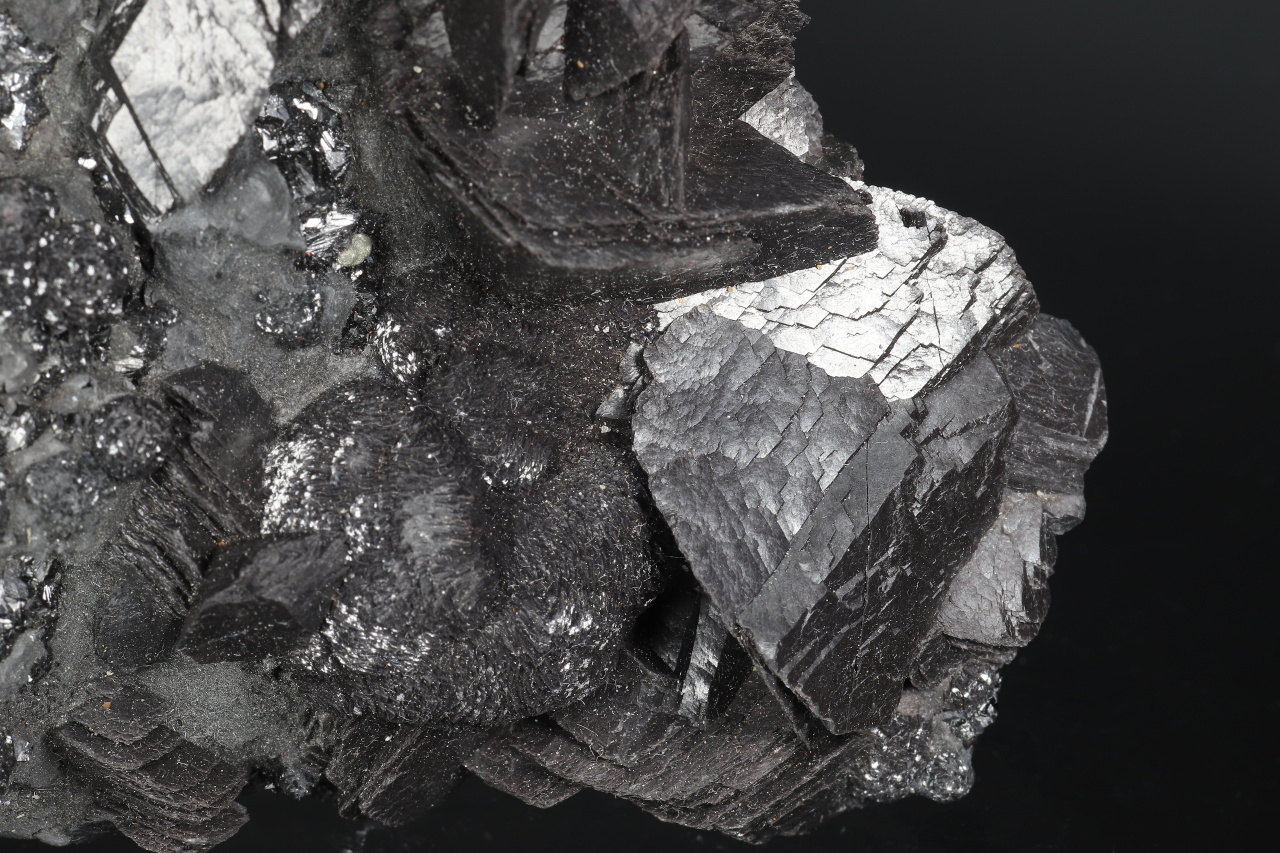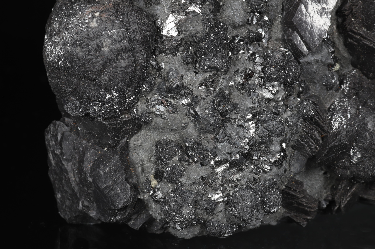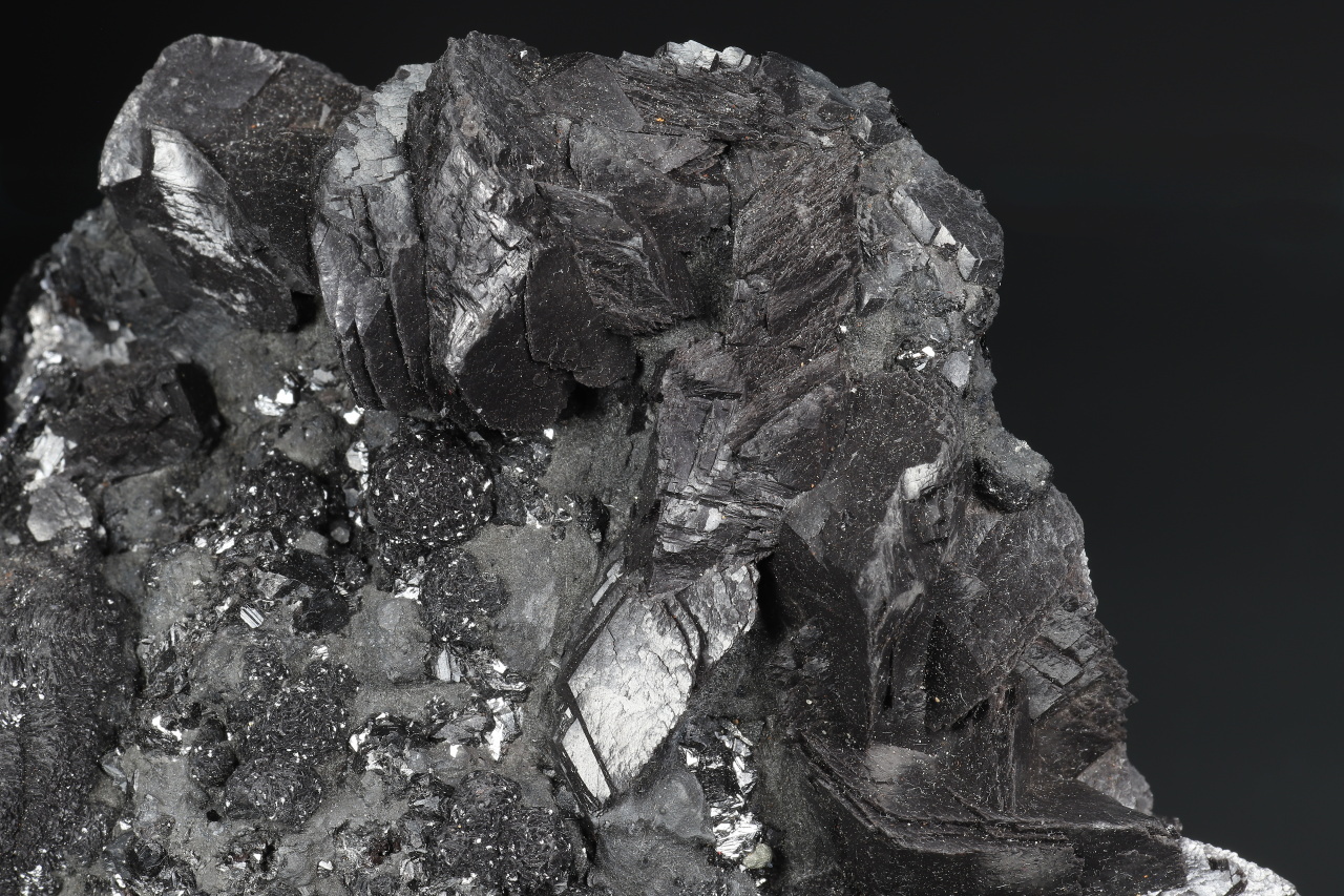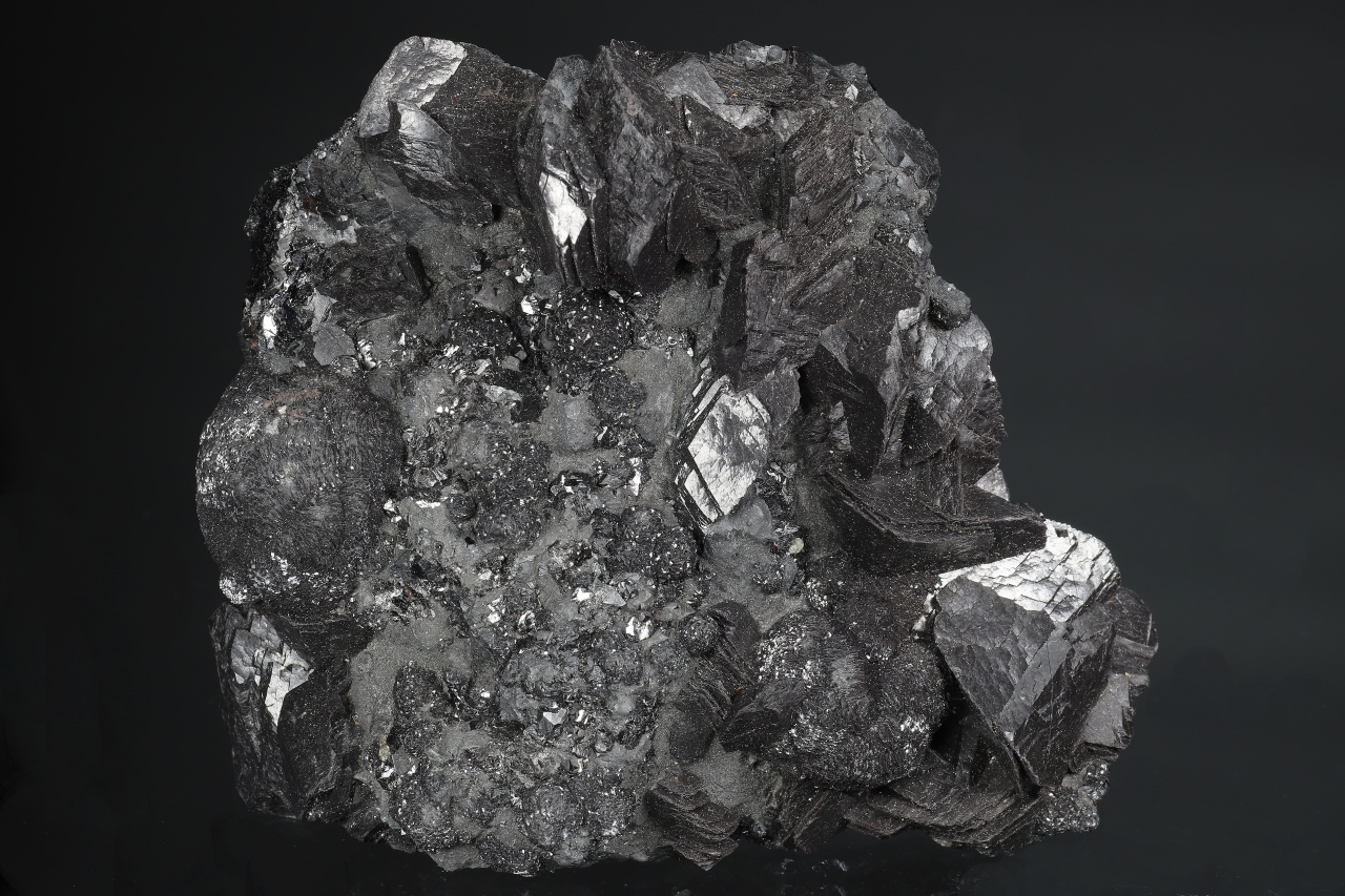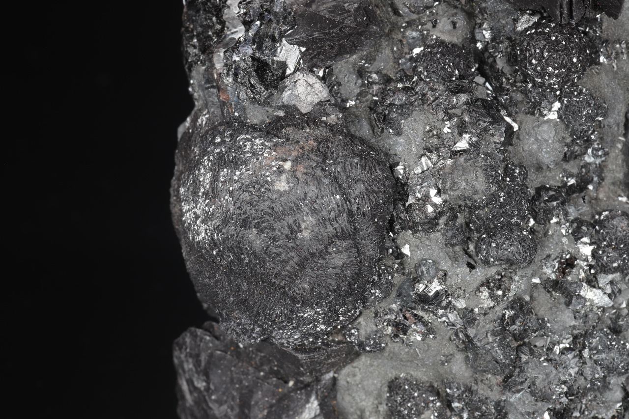 Sooty black spherical aggregates composed of curved calcite crystals and prismatic calcite crystals up to 3 cm in size on the sample, along with gray boulangerite. A very aesthetic almost undamaged druse of sought-after black calcite from the classic Herja locality in Romania.