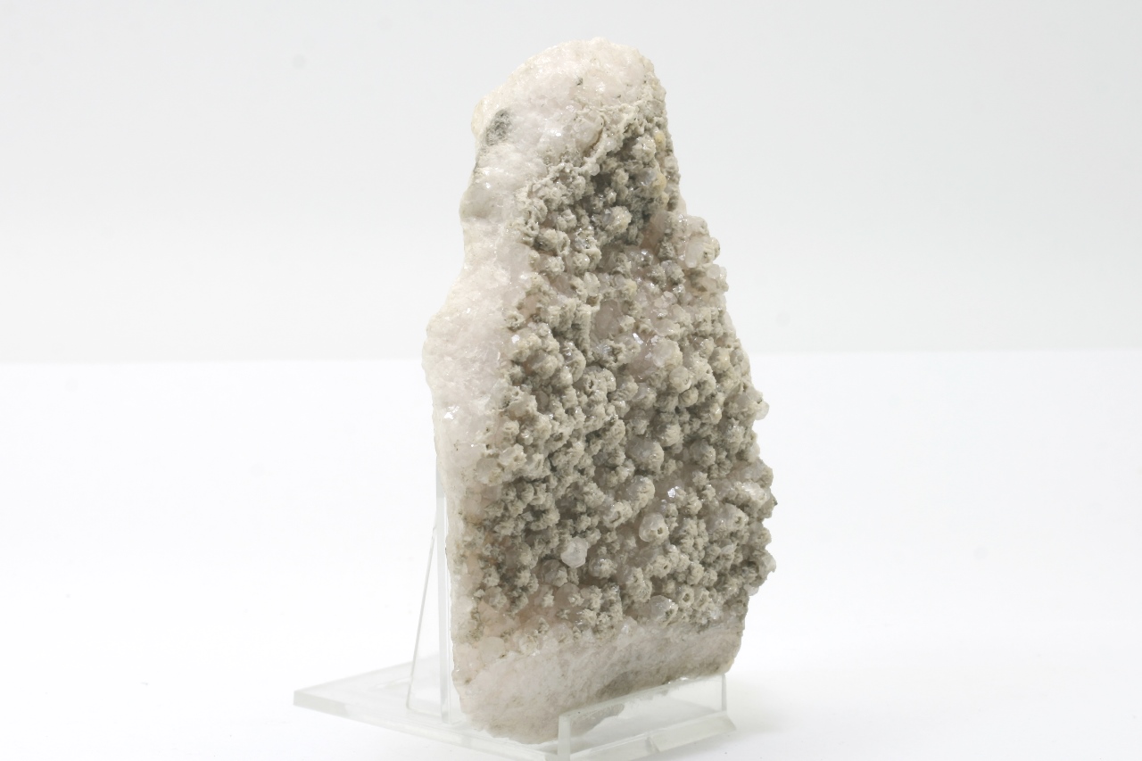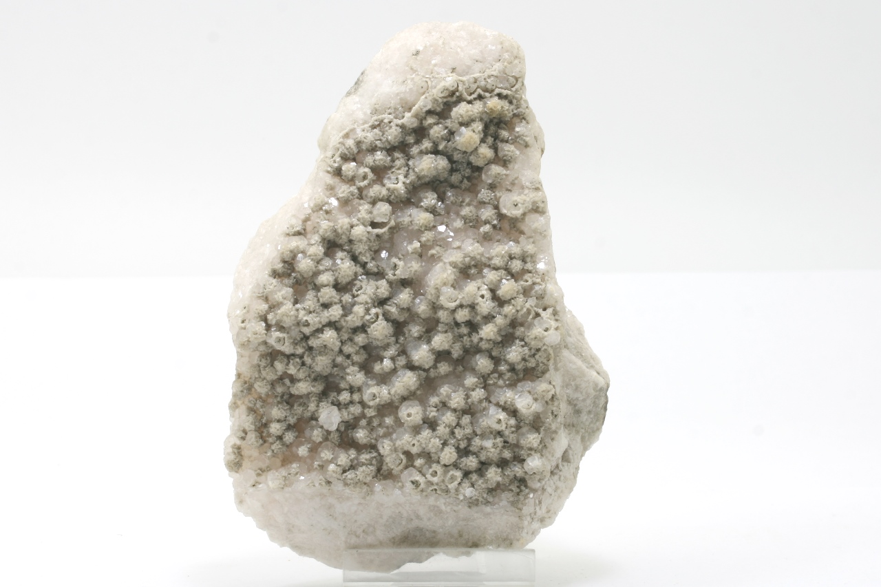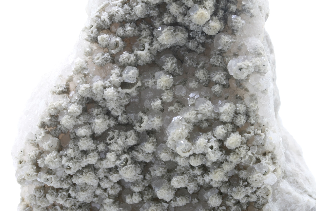 Approximately 0.5 cm large crystals of white calcite sprinkled with beige dolomite.