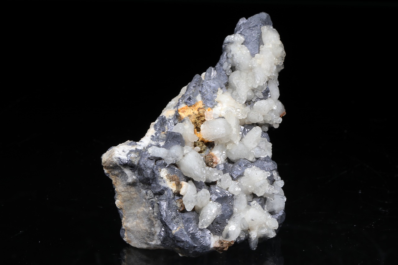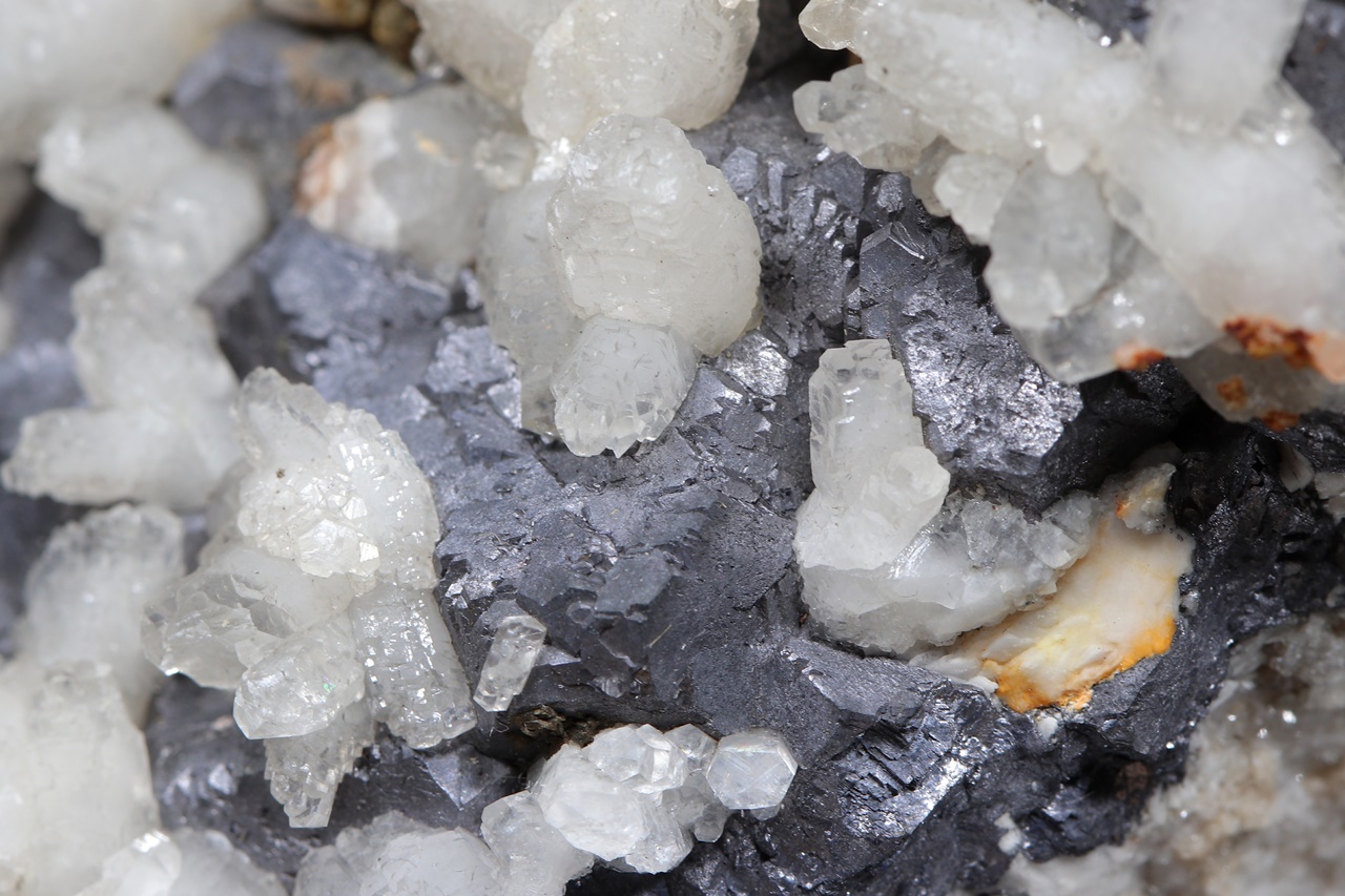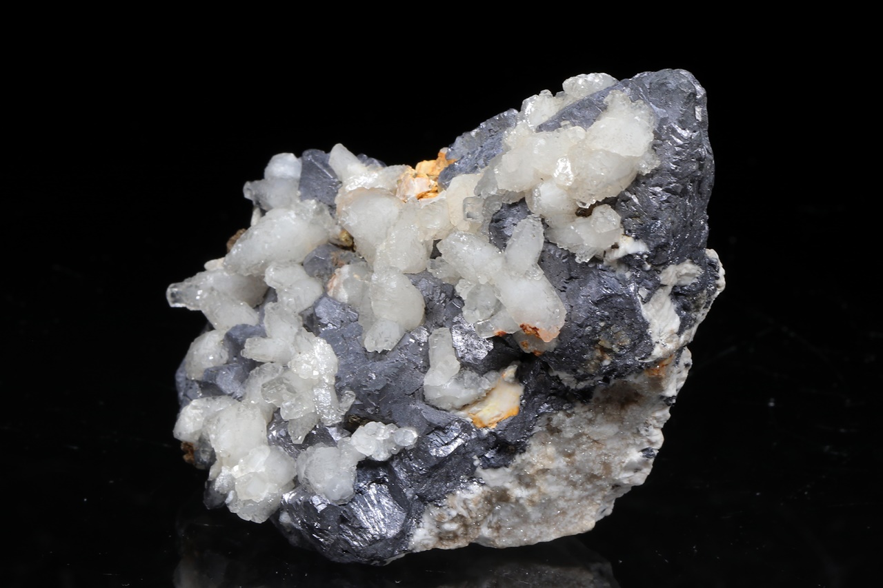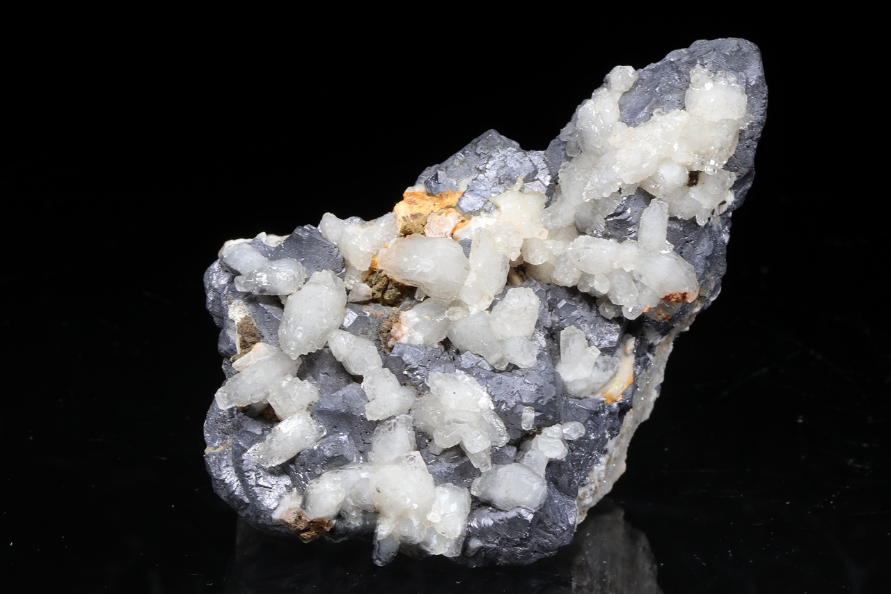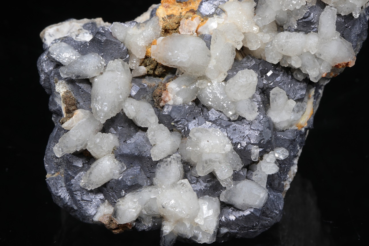 A druse of octahedral galena crystals covered with white calcite from a well-known Austrian locality.