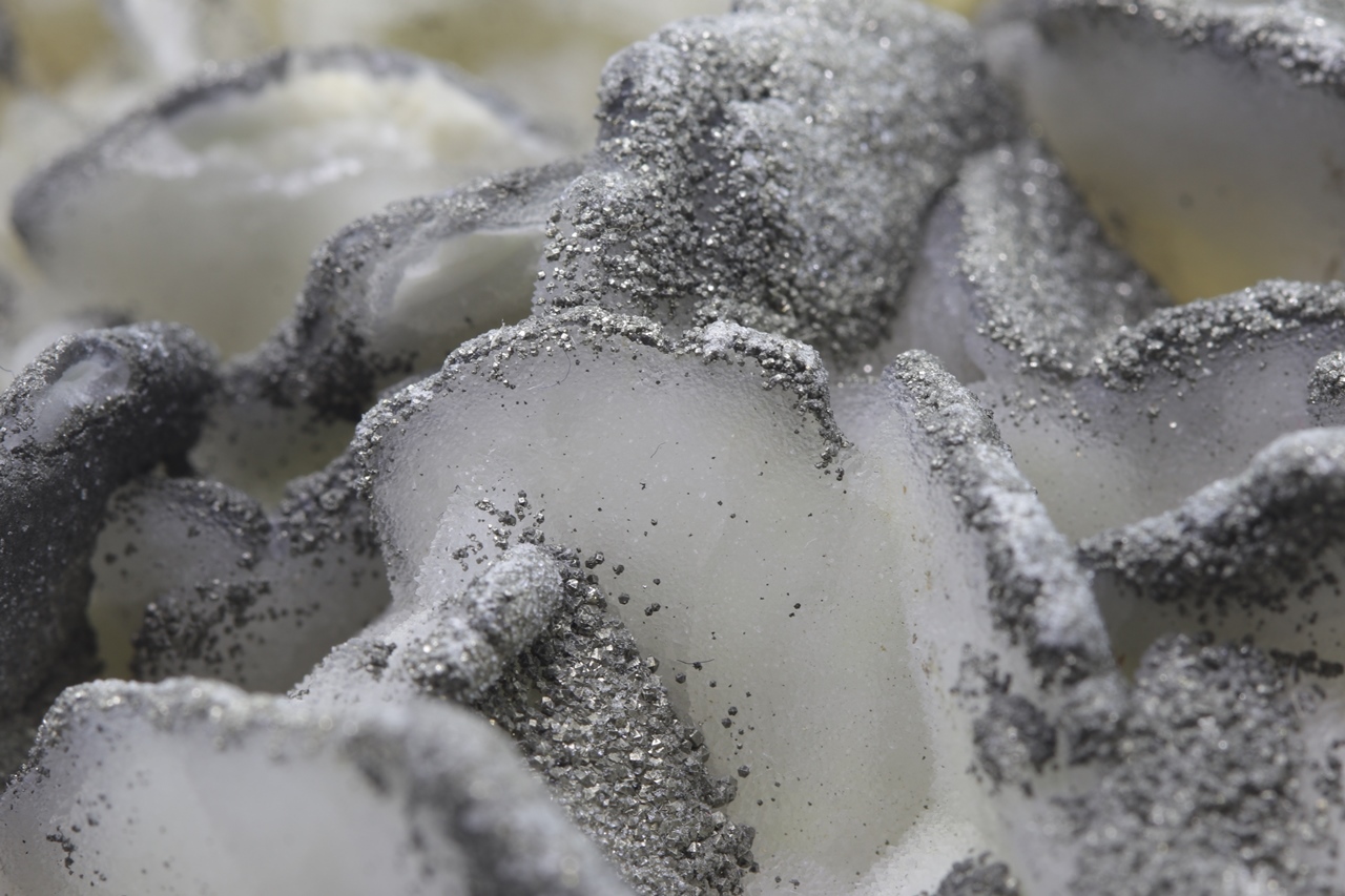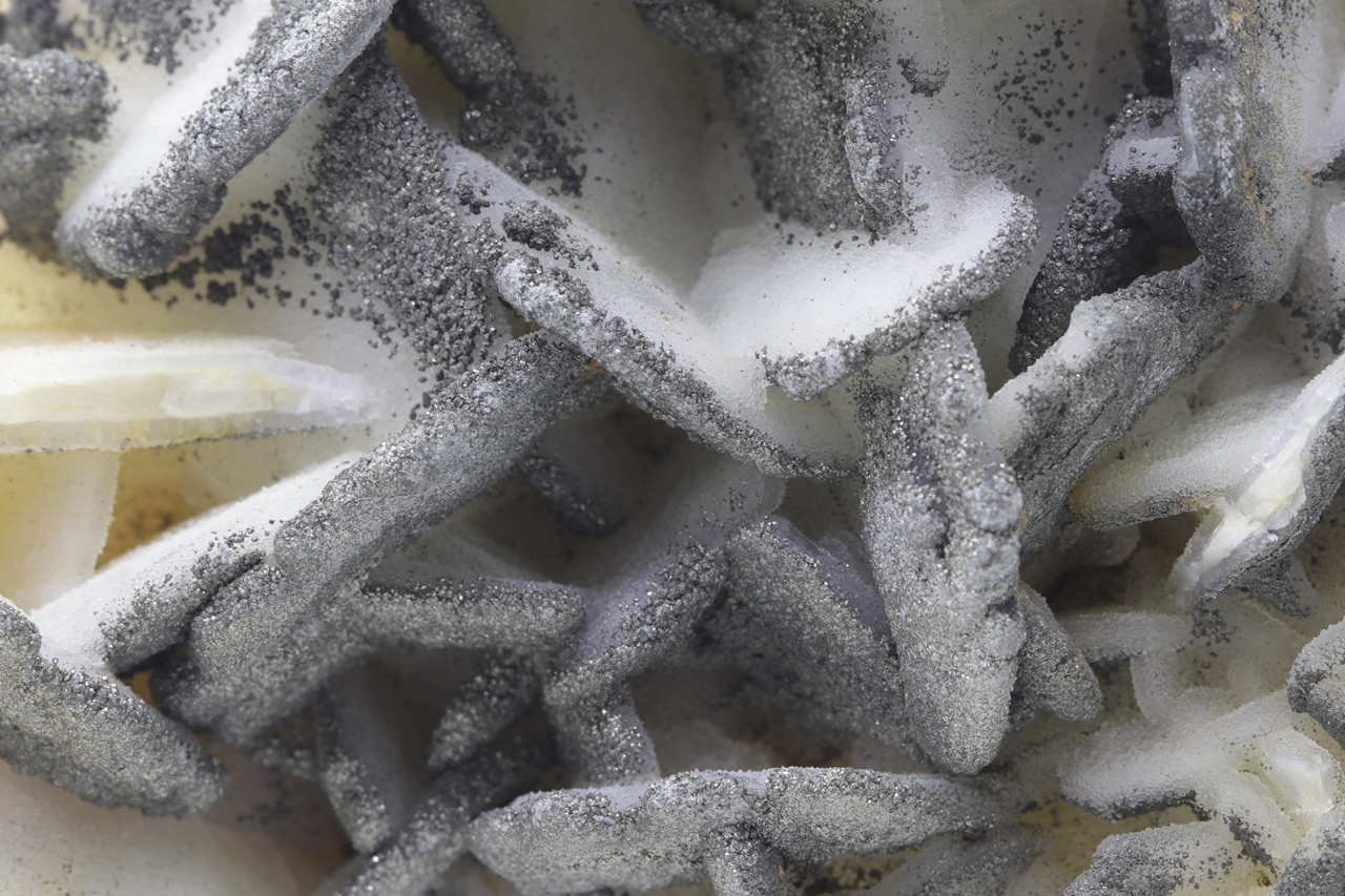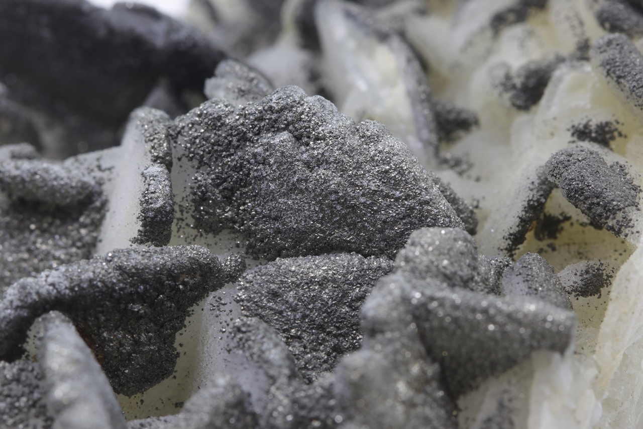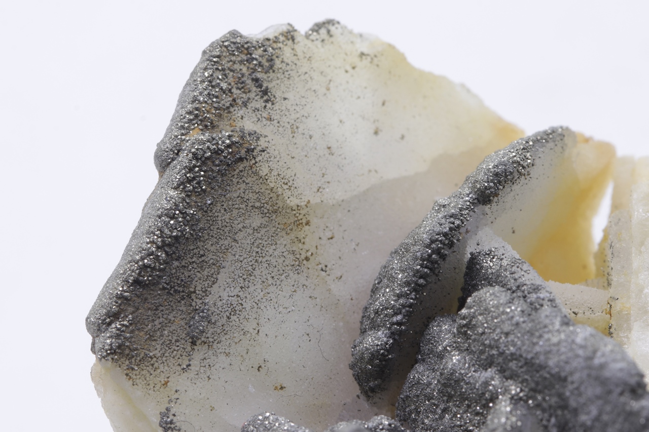 Tabular white calcite crystals up to 3 cm large “sprinkled” with small crystals of golden pyrite.
