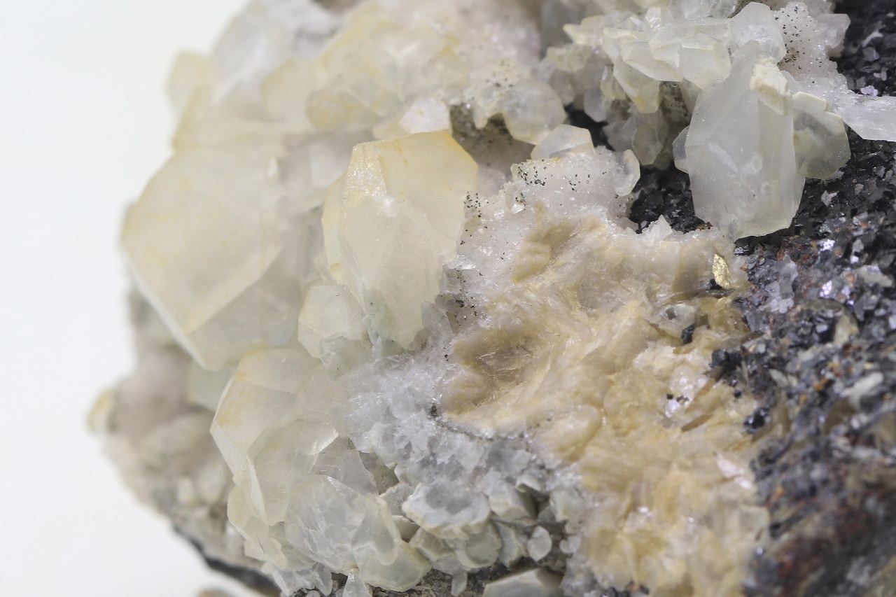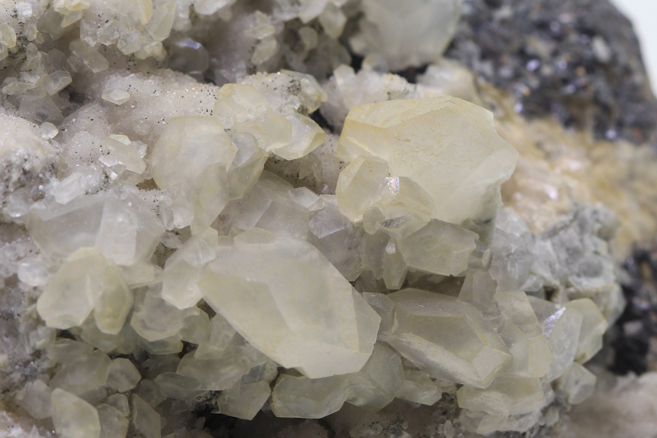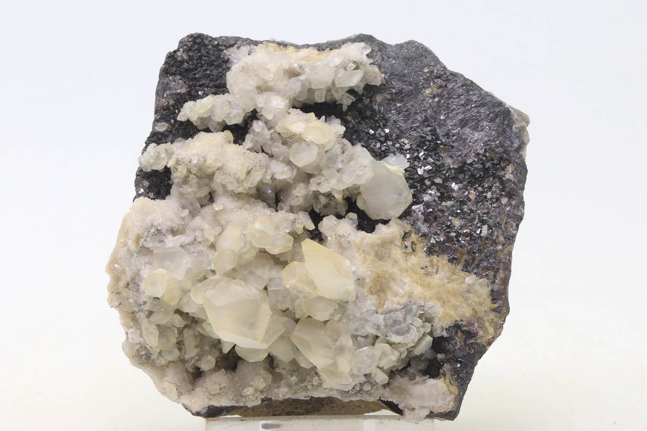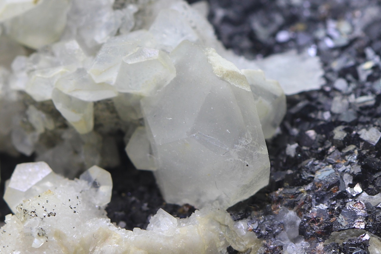 Crystals of translucent calcite with partially prismatic development grown on black sphalerite. The largest calcite crystal is 14 mm.