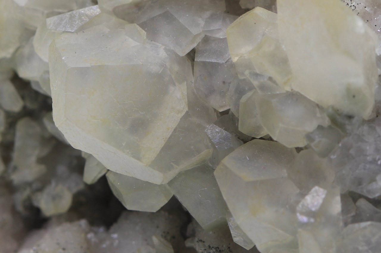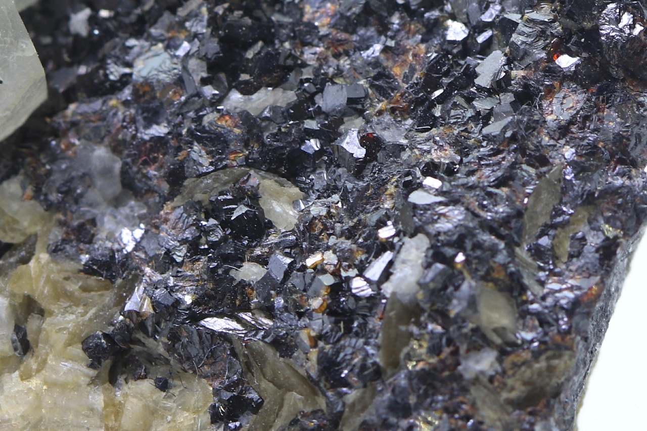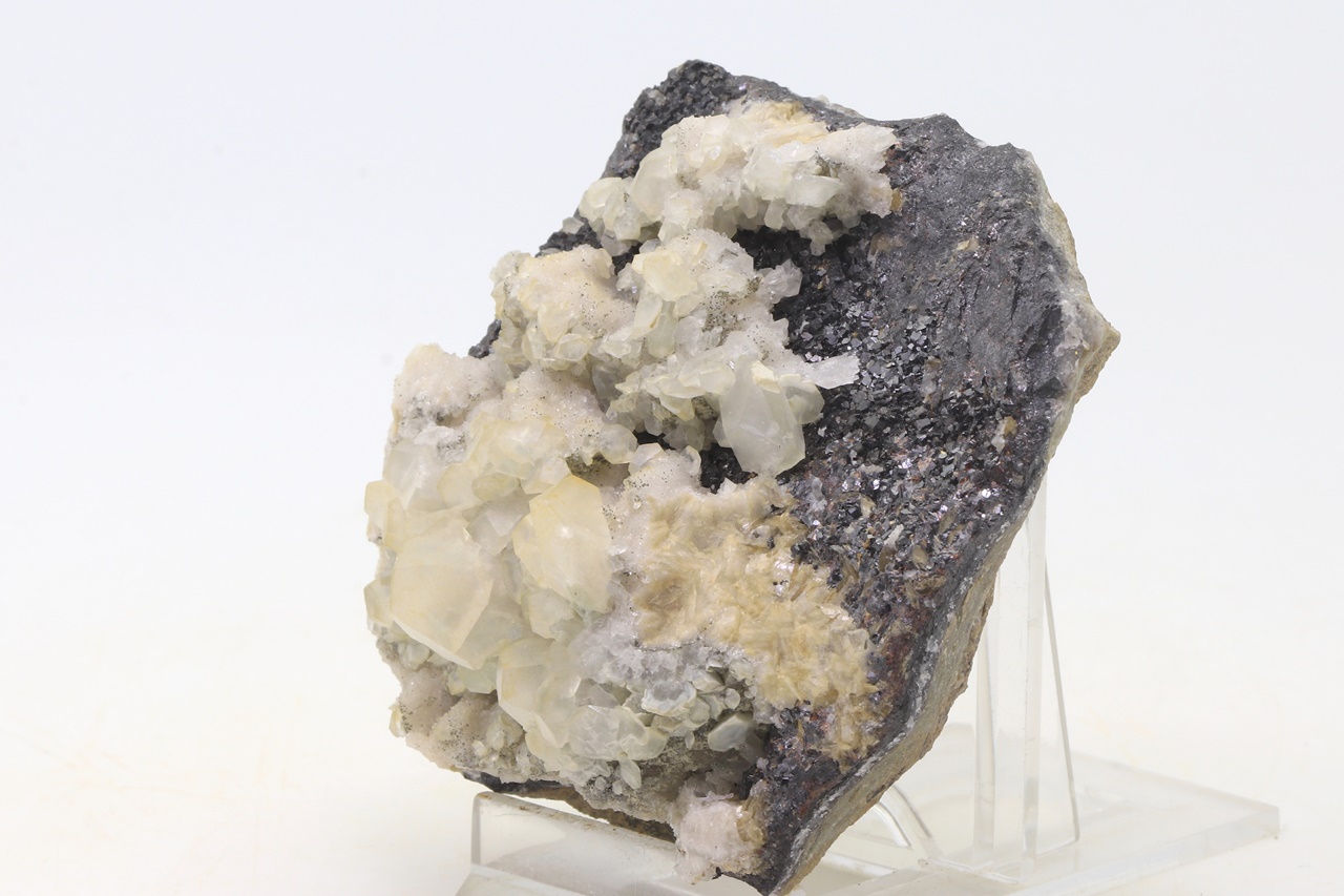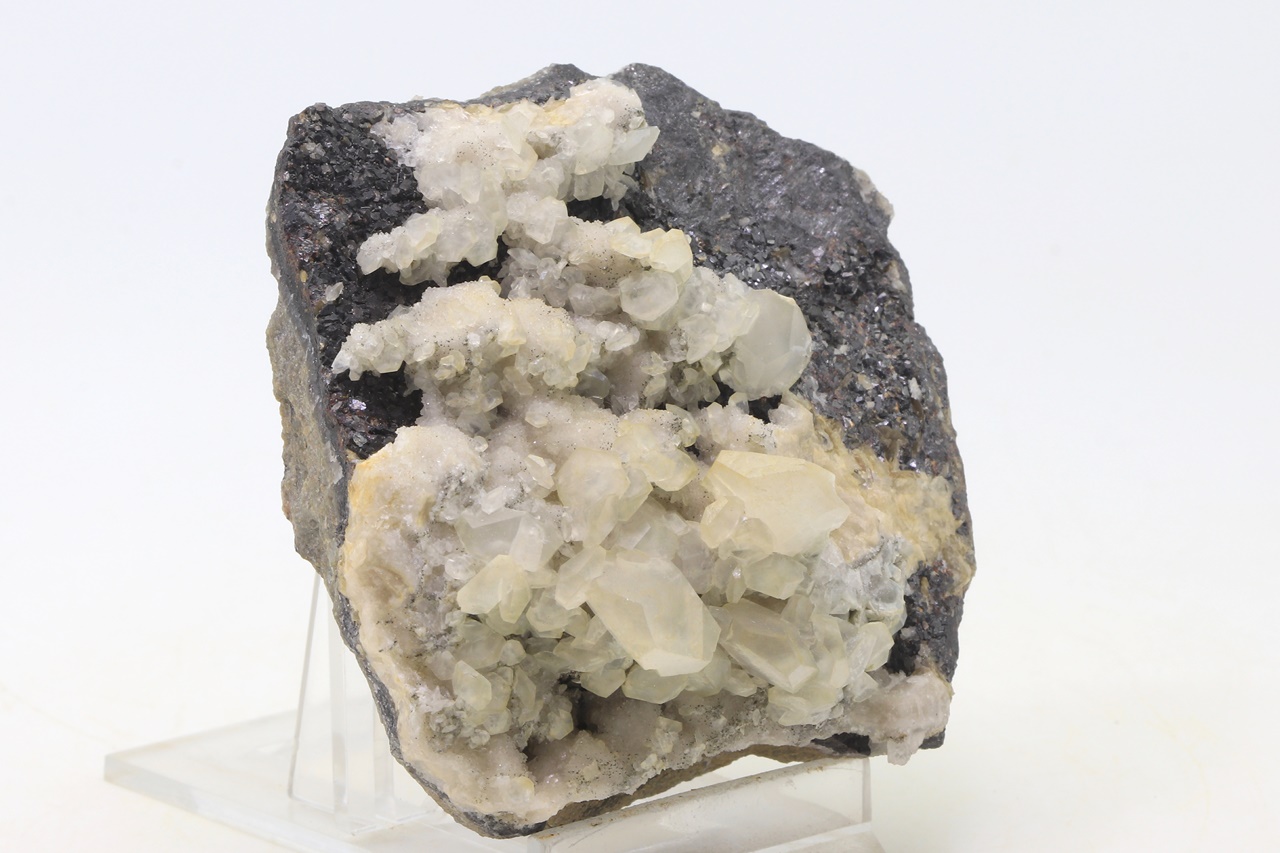 Crystals of translucent calcite with partially prismatic development grown on black sphalerite. The largest calcite crystal is 14 mm.