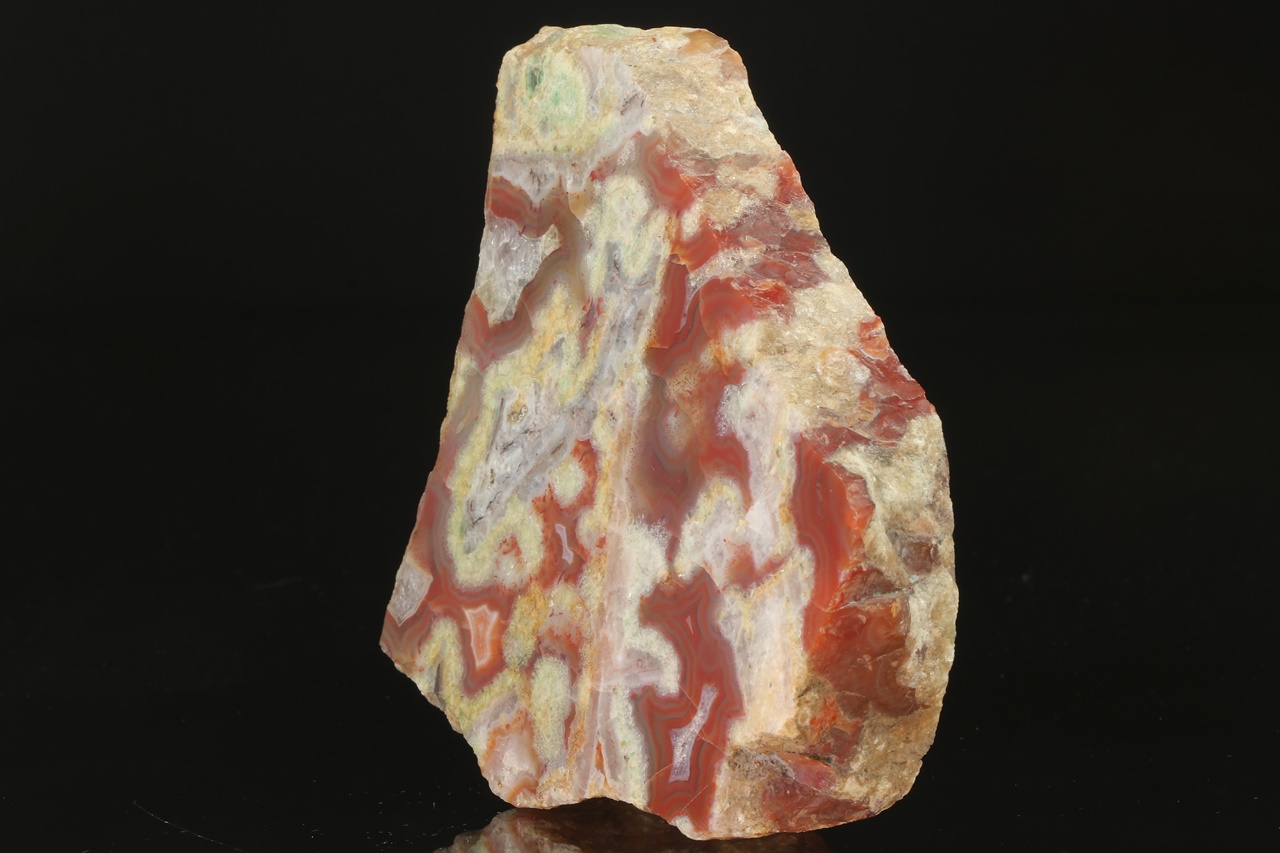 Polished specimen of splendid Fluorite with orange Carnelian. The specimen is trimmed on the back side.
