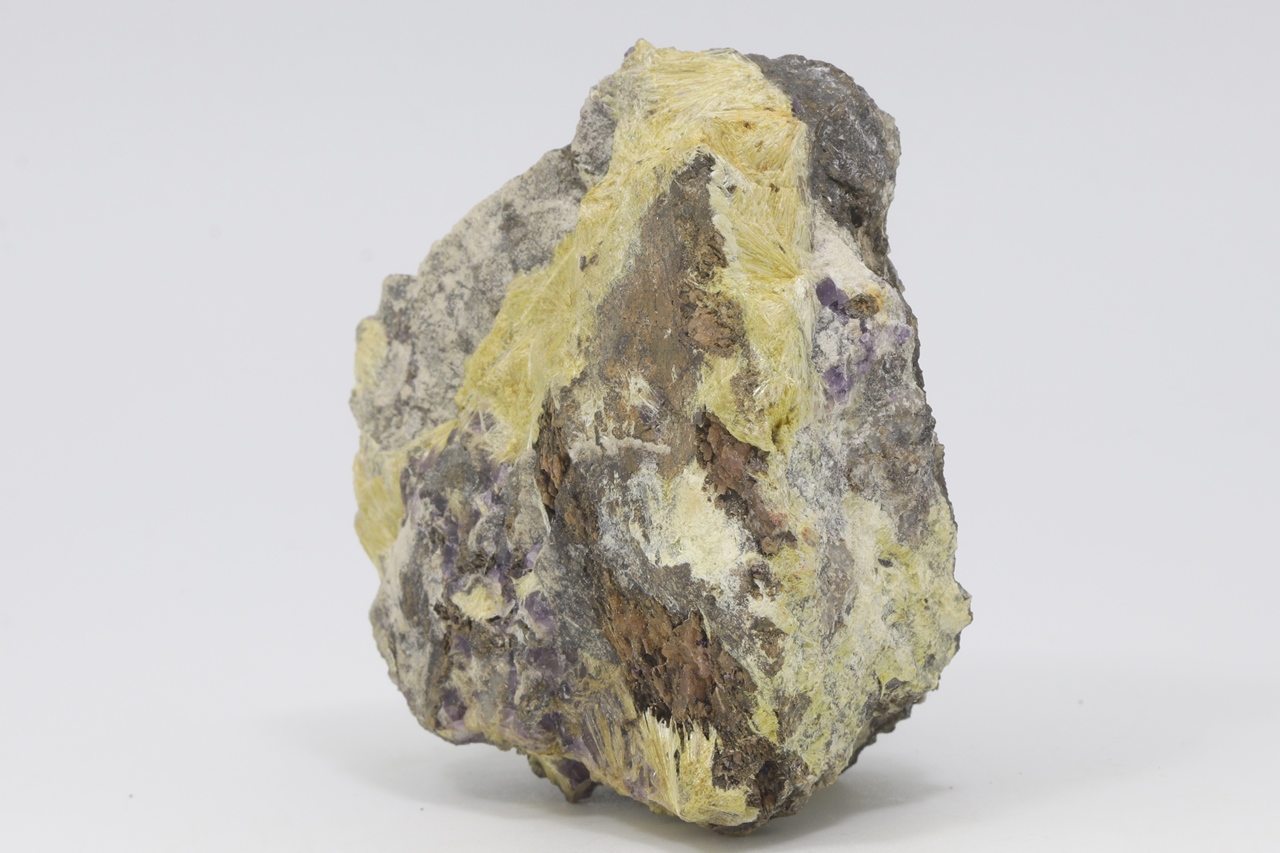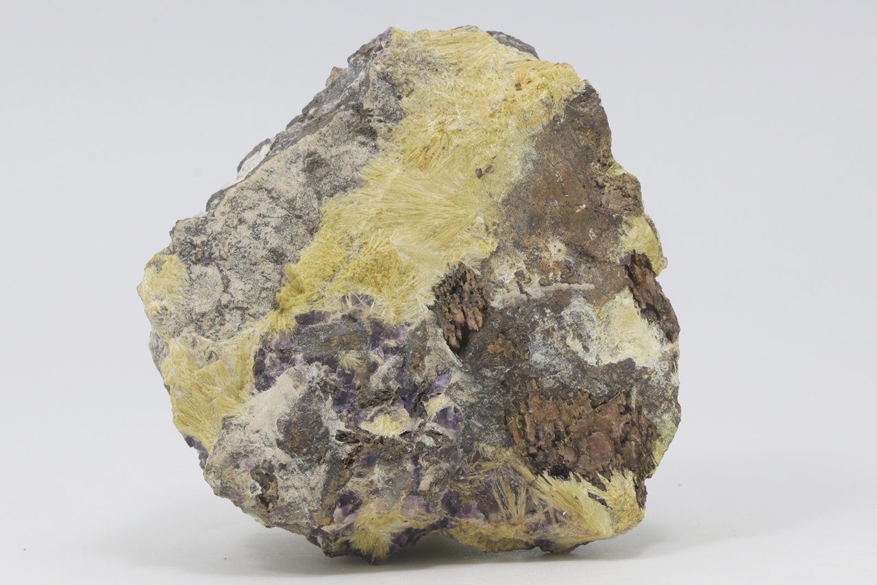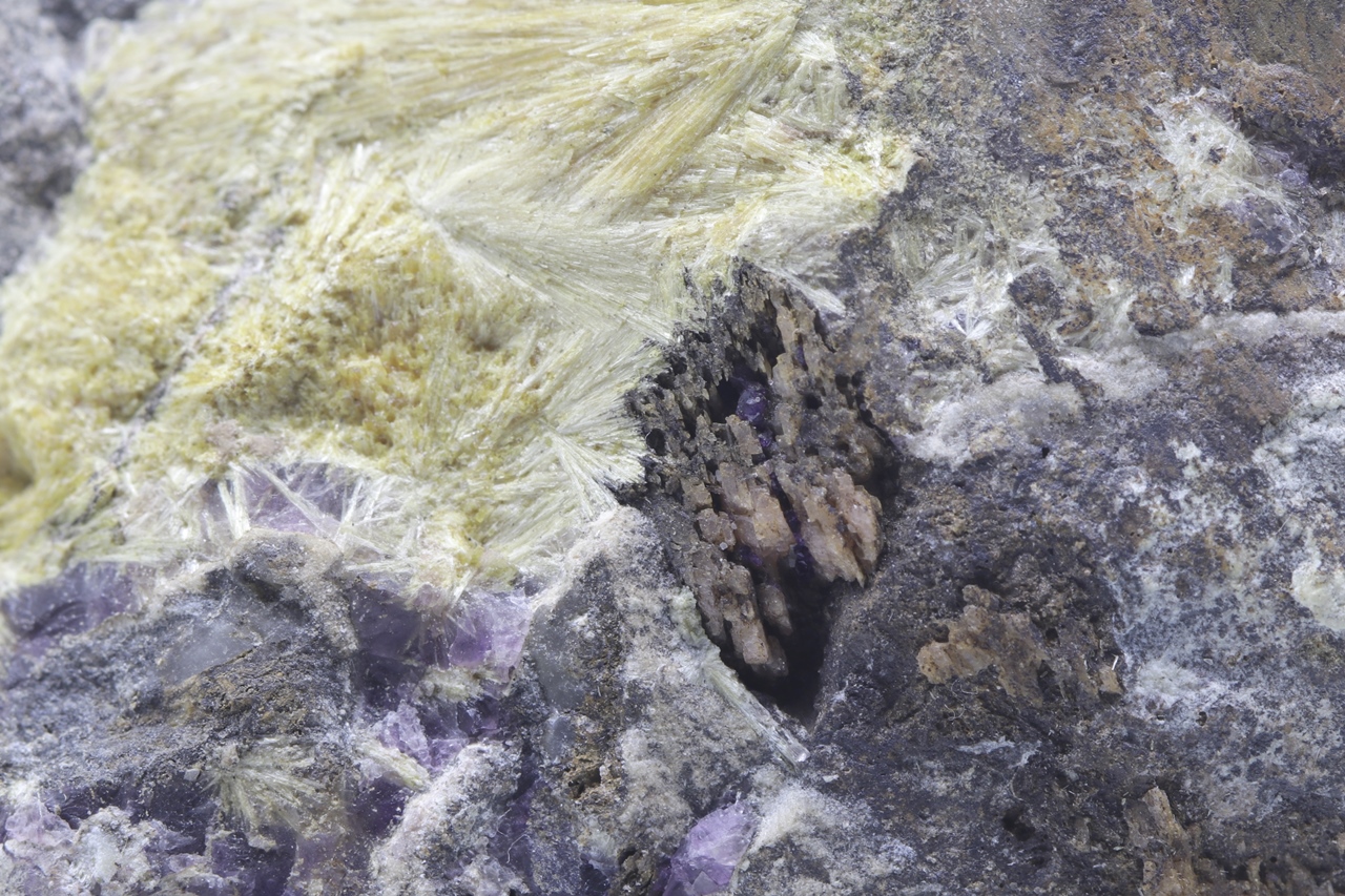 Stellate aggregates of intensely yellow Carpholite with pinkish-brown Rhodochrosite.