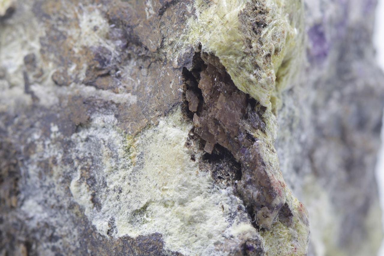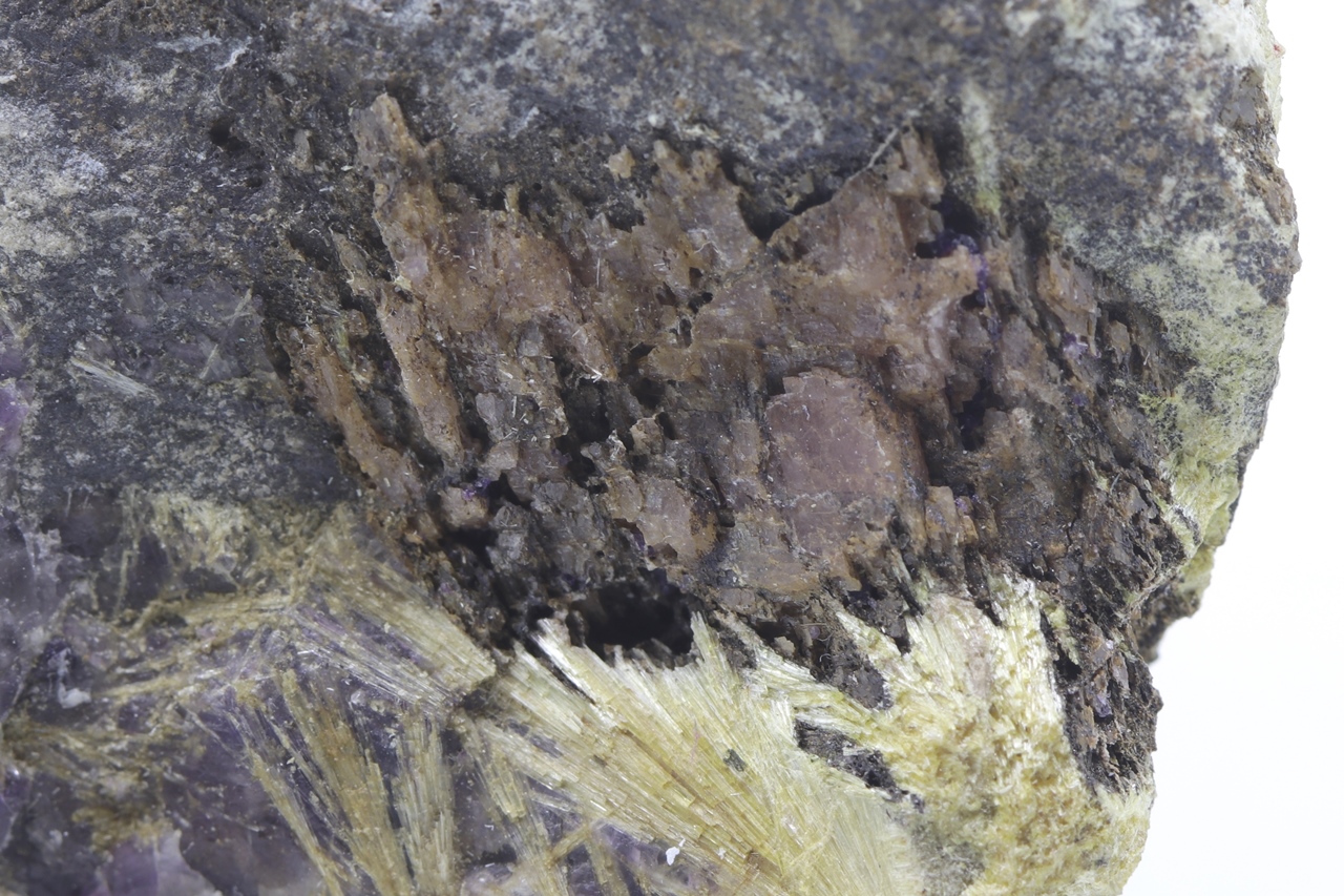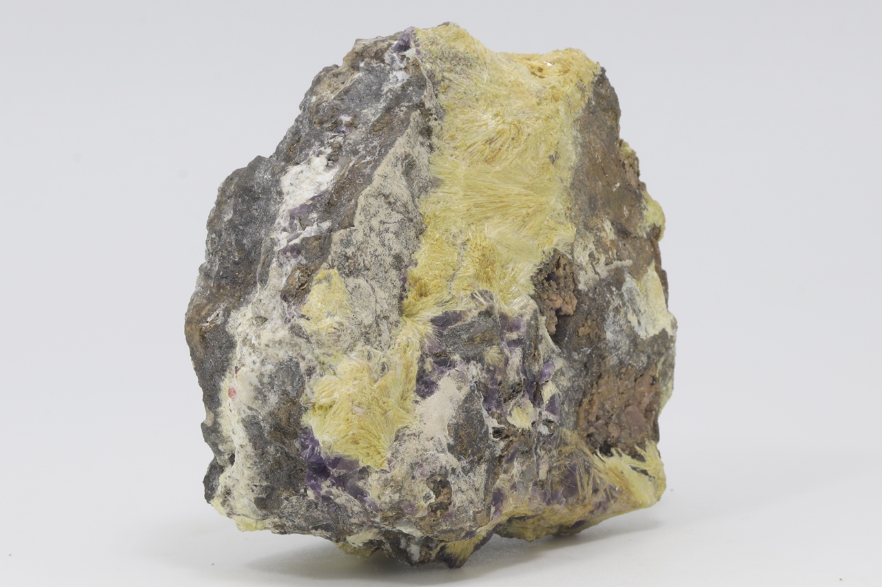Stellate aggregates of intensely yellow Carpholite with pinkish-brown Rhodochrosite.