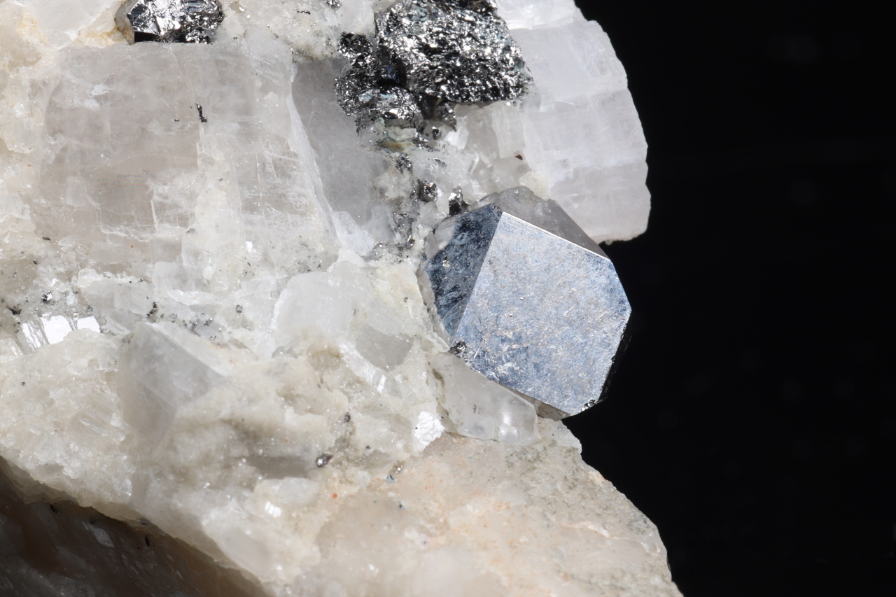 From one part perfectly bounded 8 mm large silver-white crystal of rare copper and cobalt sulfide from the African Congo. Nice specimen of crystal and granular carrollite encrusted in calcite.