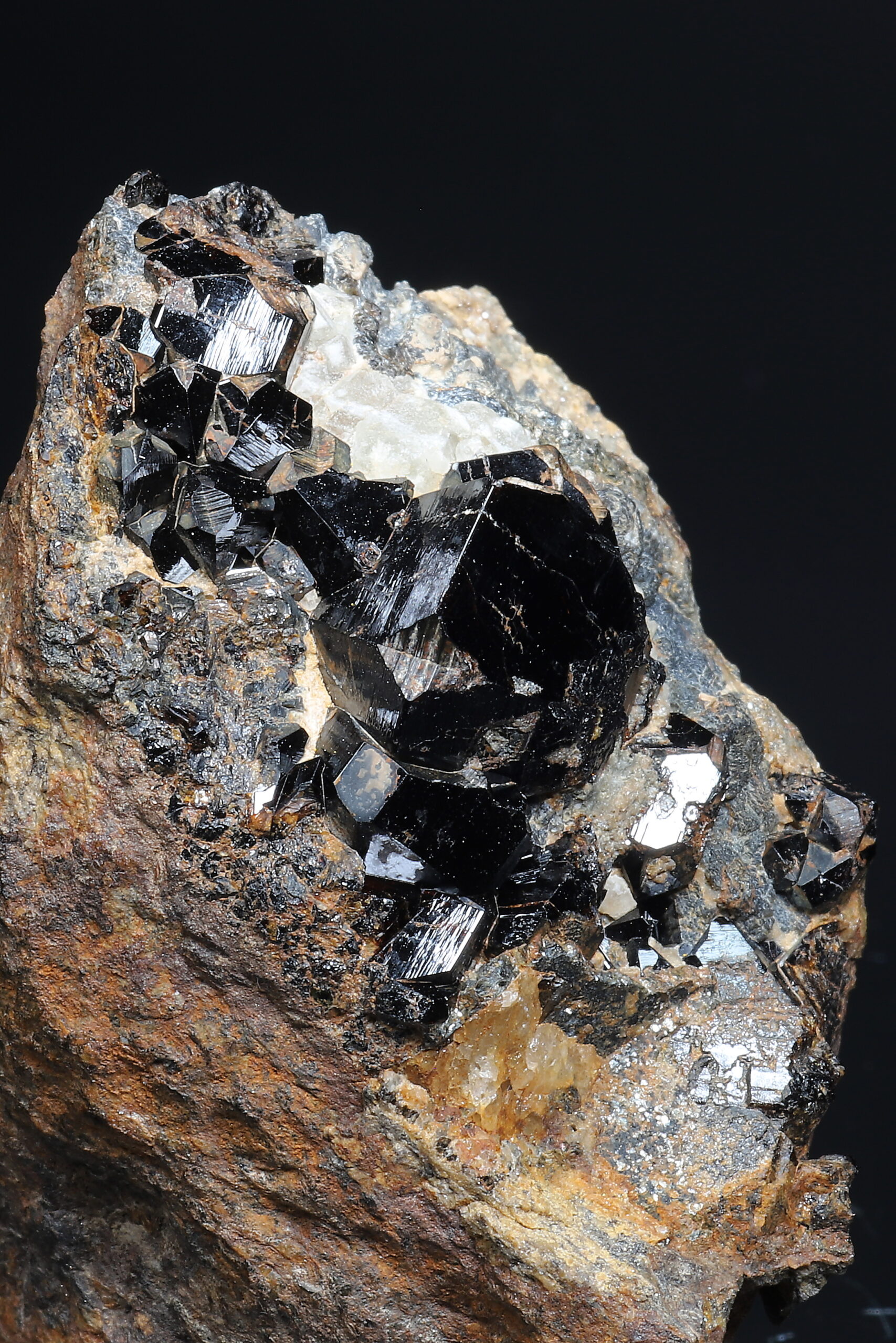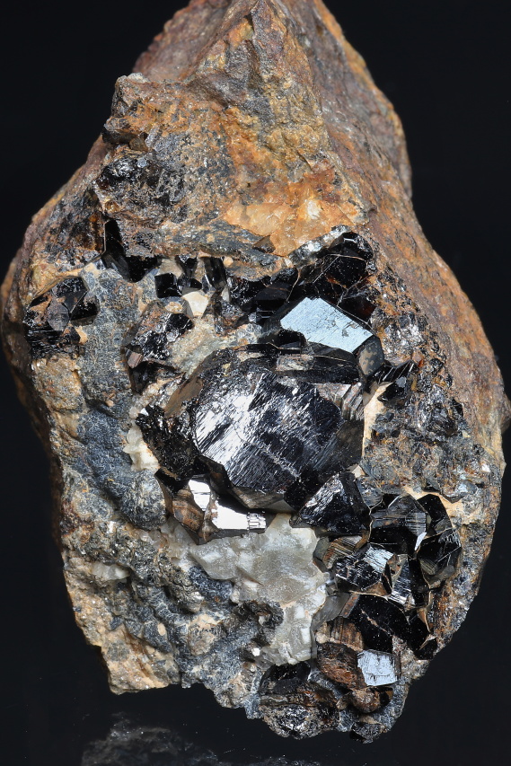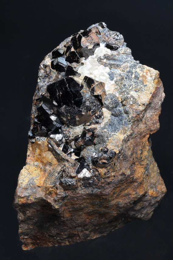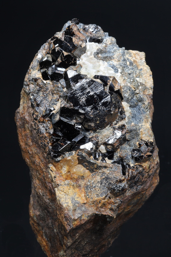 Clusters of shiny cassiterite crystals up to 15 mm in size on matrix, which is trimmed on the underside.