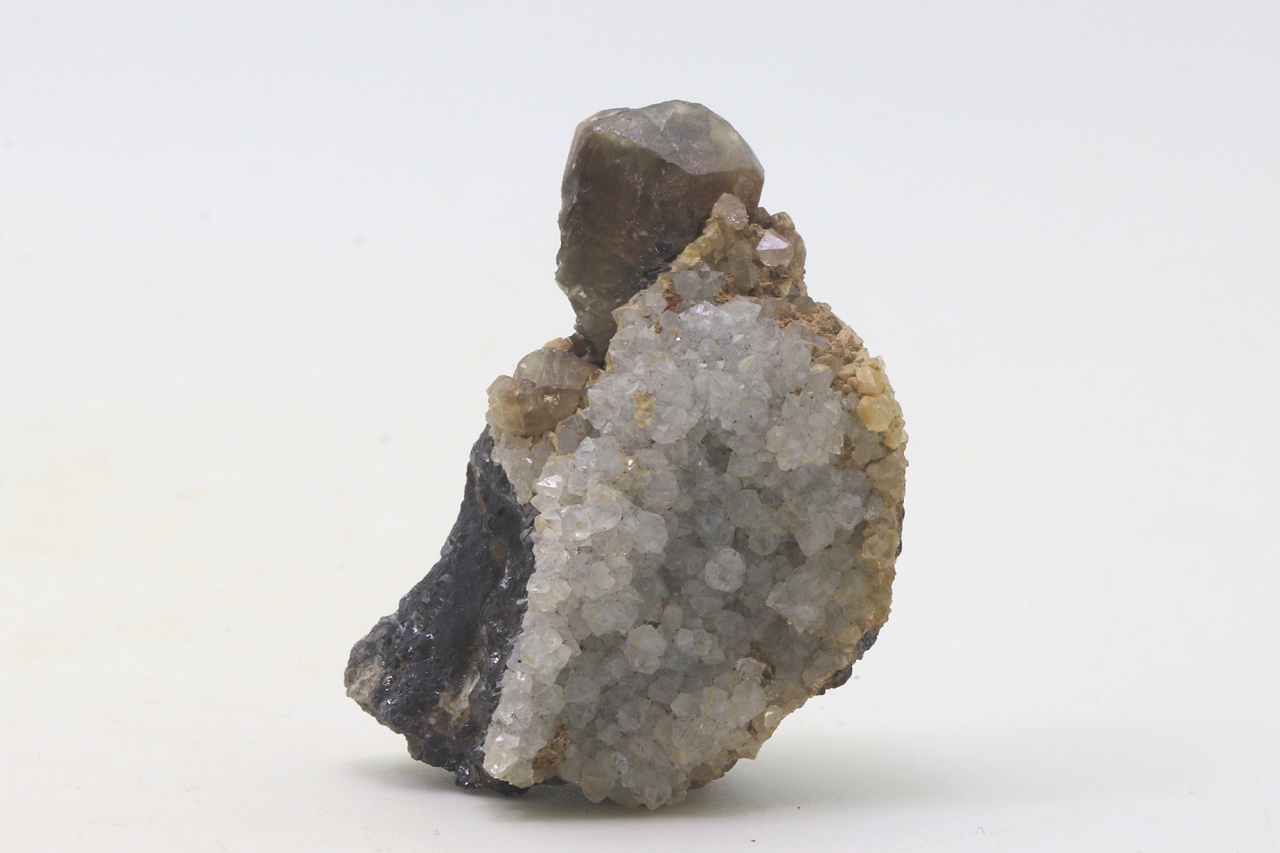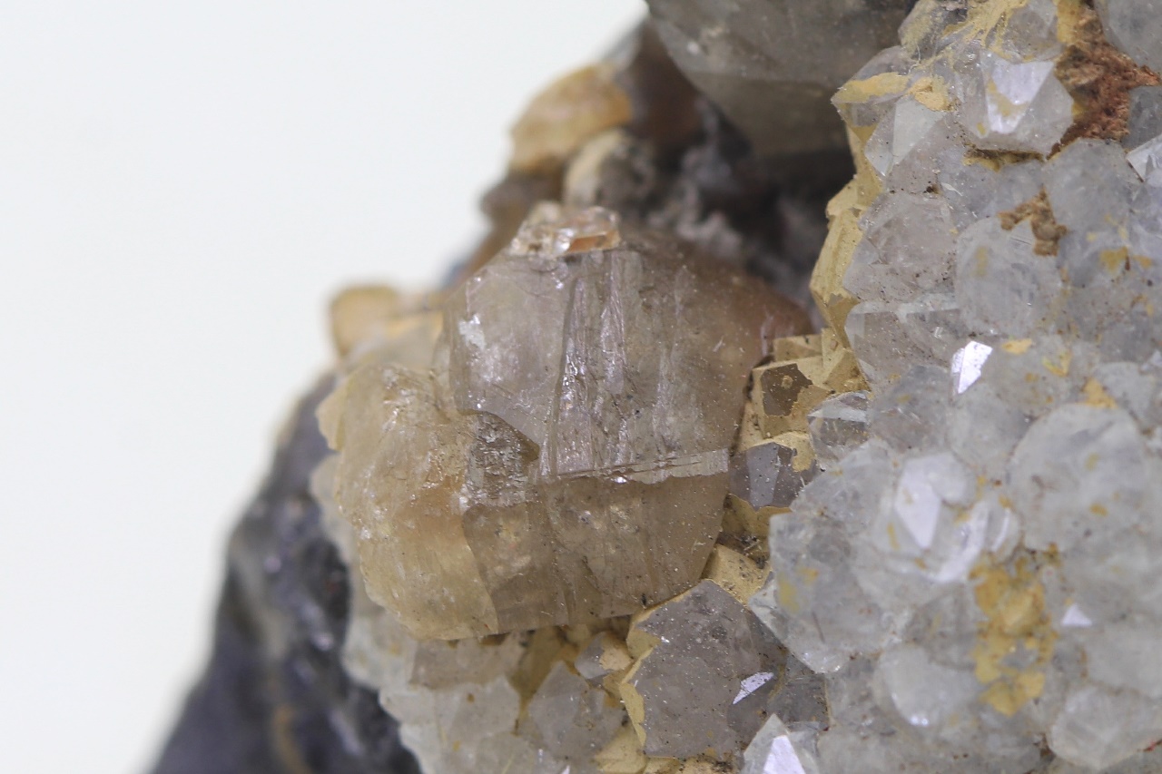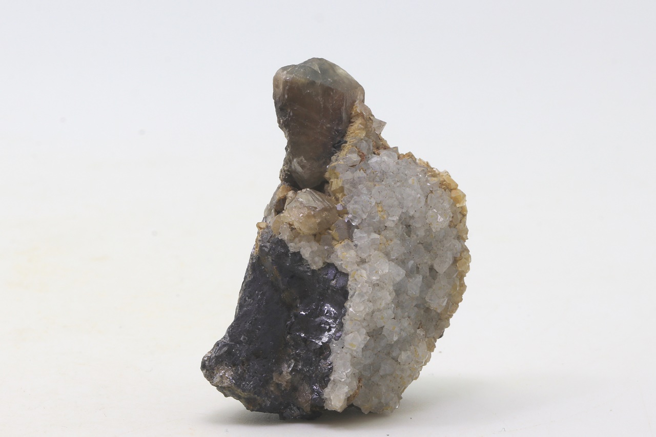 Two light brown, shiny cerussite crystals grown on galena covered with quartz. The size of the crystals is 20 and 8 mm.