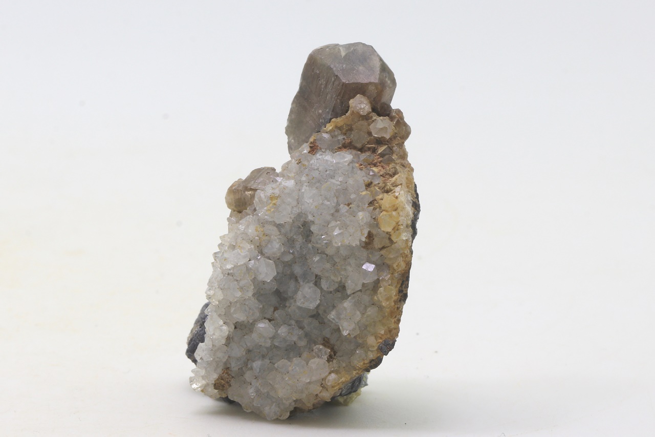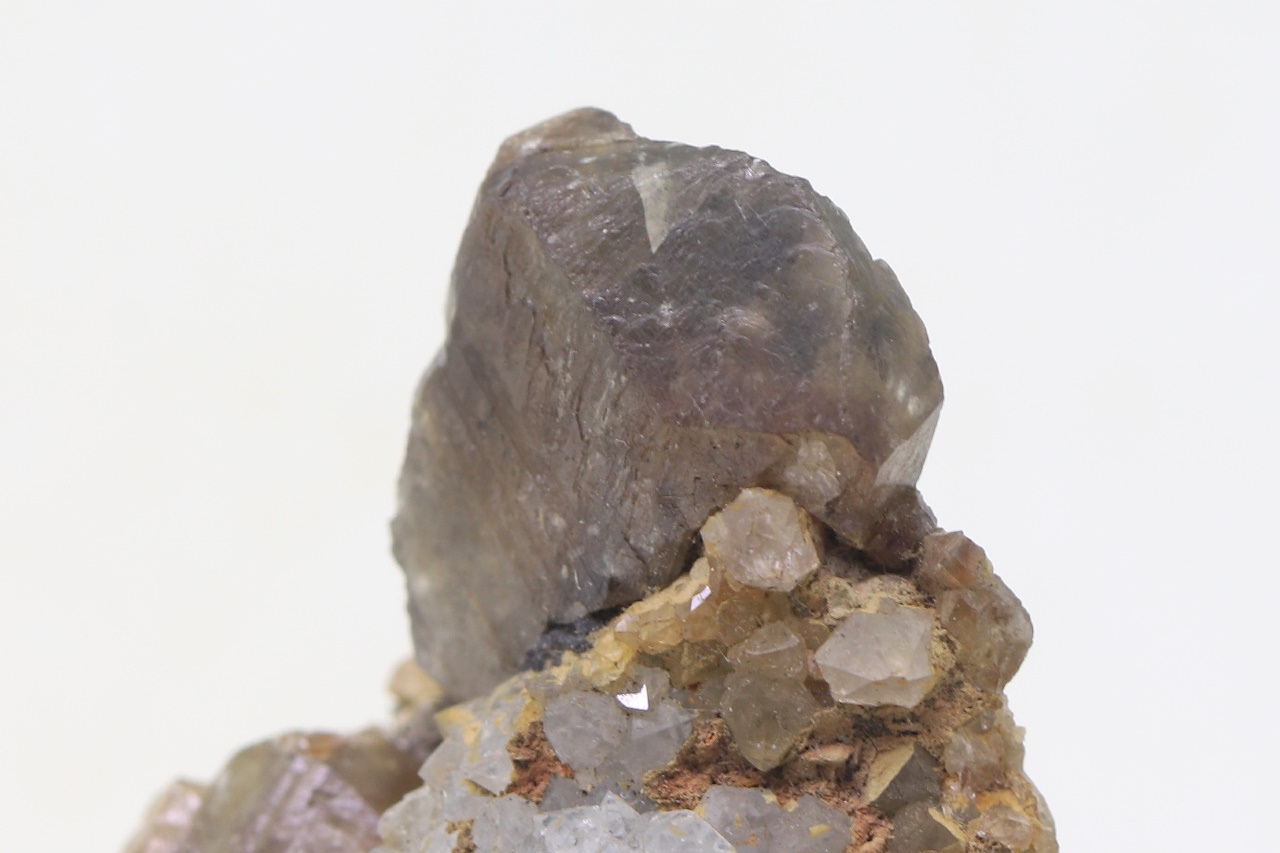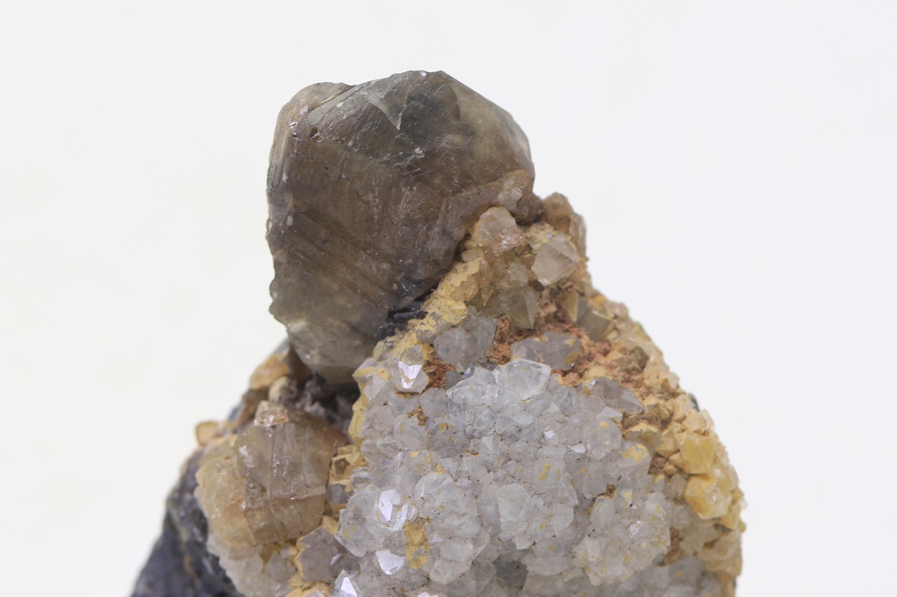 Two light brown, shiny cerussite crystals grown on galena covered with quartz. The size of the crystals is 20 and 8 mm.