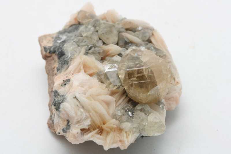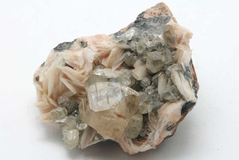 Aesthetic sample of several shiny (the largest being 18 mm) cerussite crystals from a classic Moroccan locality. A specimen of several transparent crystals growing on a small substrate with orange tabular baryte crystals.