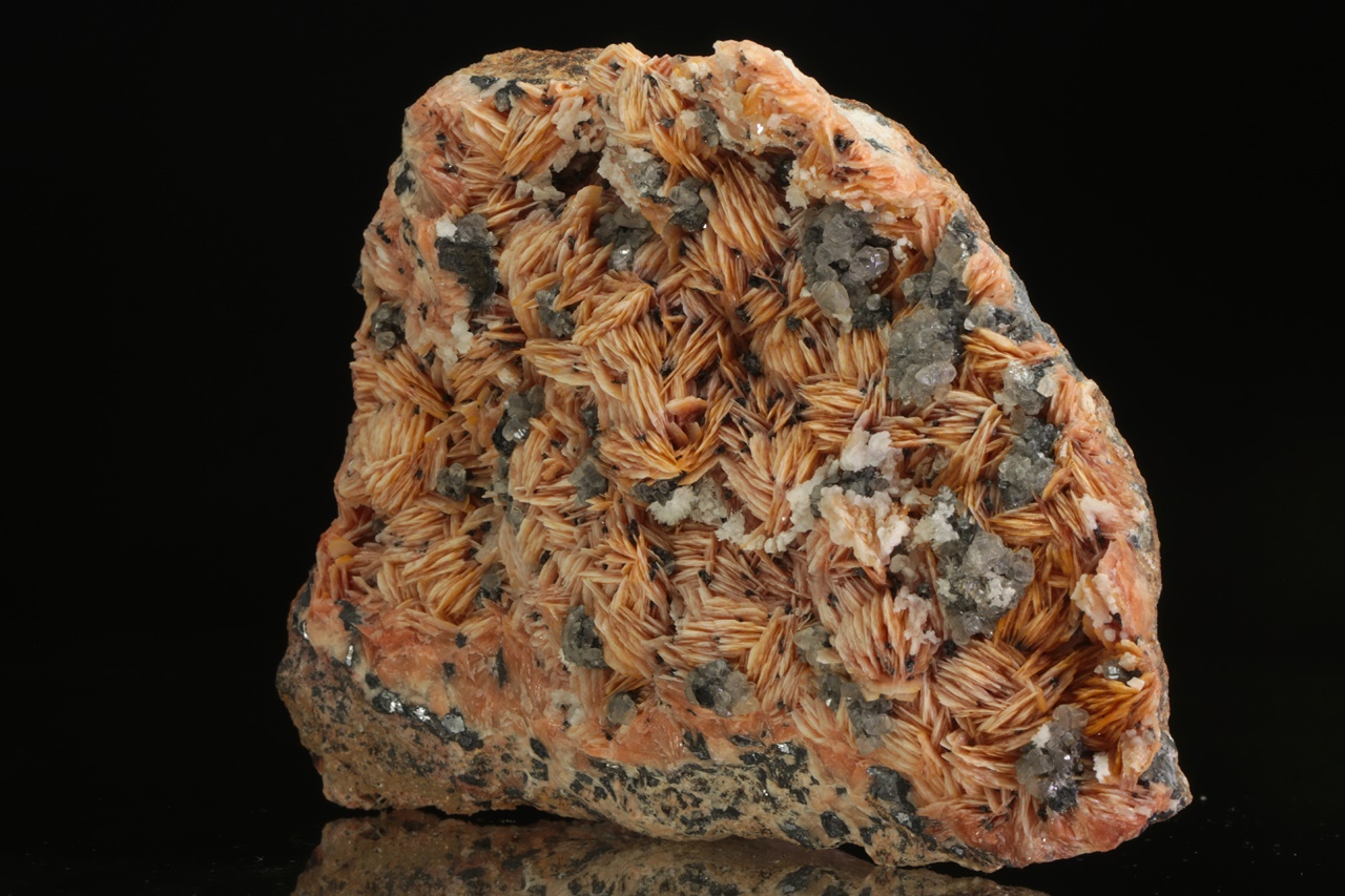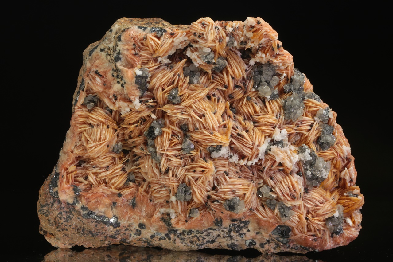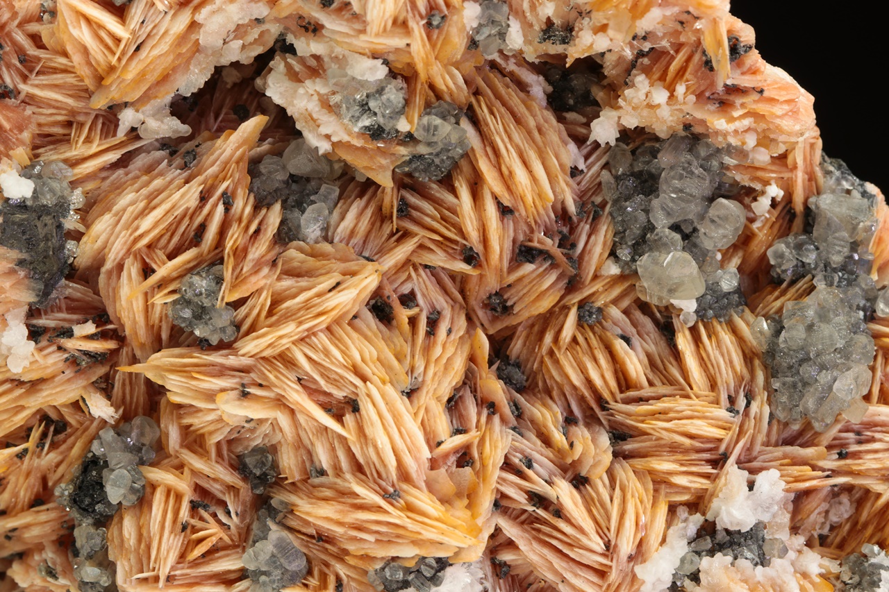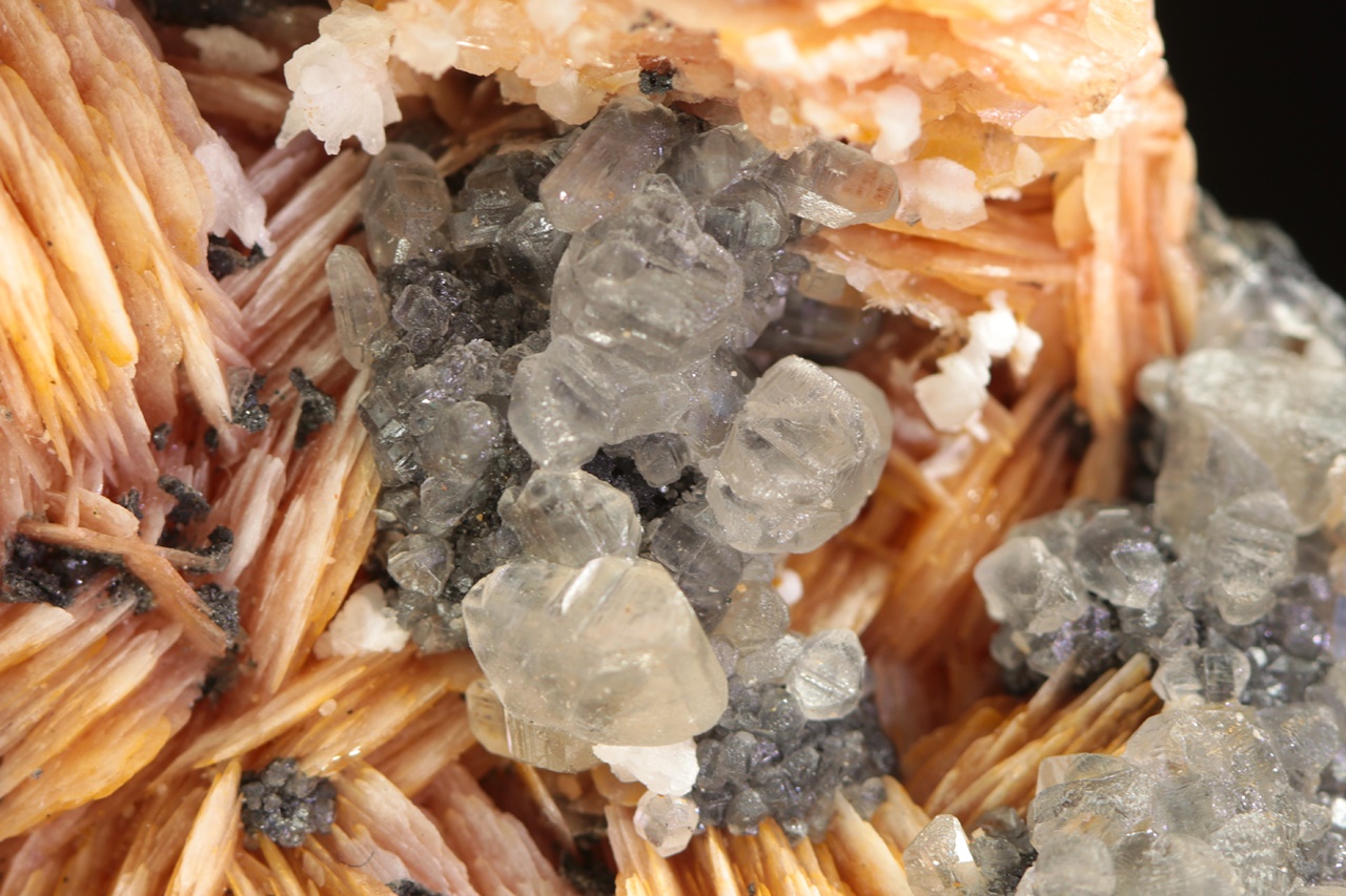 Clear, translucent cerussite crystals grown on a druse of tabular baryte crystals with minor black galena.