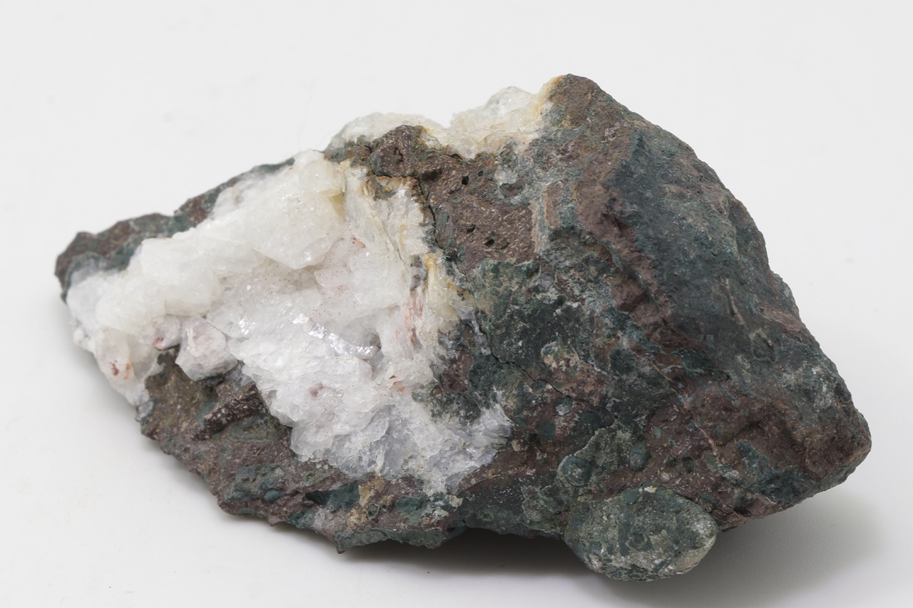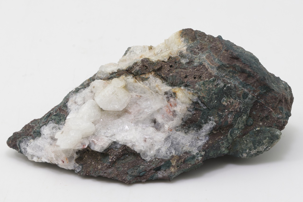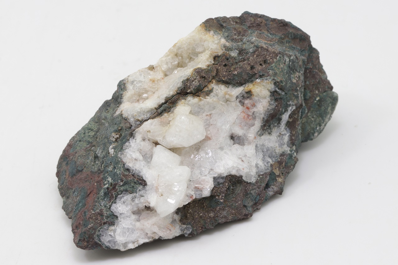 Shiny, white chabazite crystals up to 10 mm in size grown in the cavity of melaphyre.