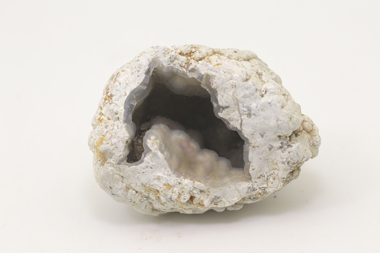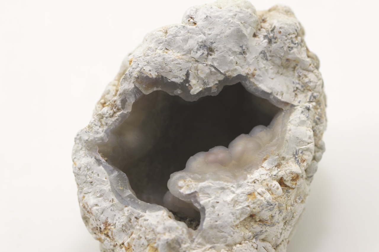 Chalcedony forms in a cavity with dimensions of 4.3 x 3.2 cm, transparent kidney-shaped aggregates of a grayish-brown color. A nice specimen of cavity chalcedony, originating from the Brezina locality, Slovakia, which is also famous for finds of beautiful agates.