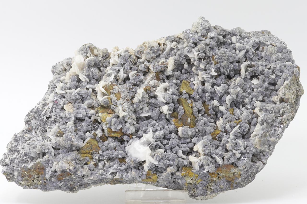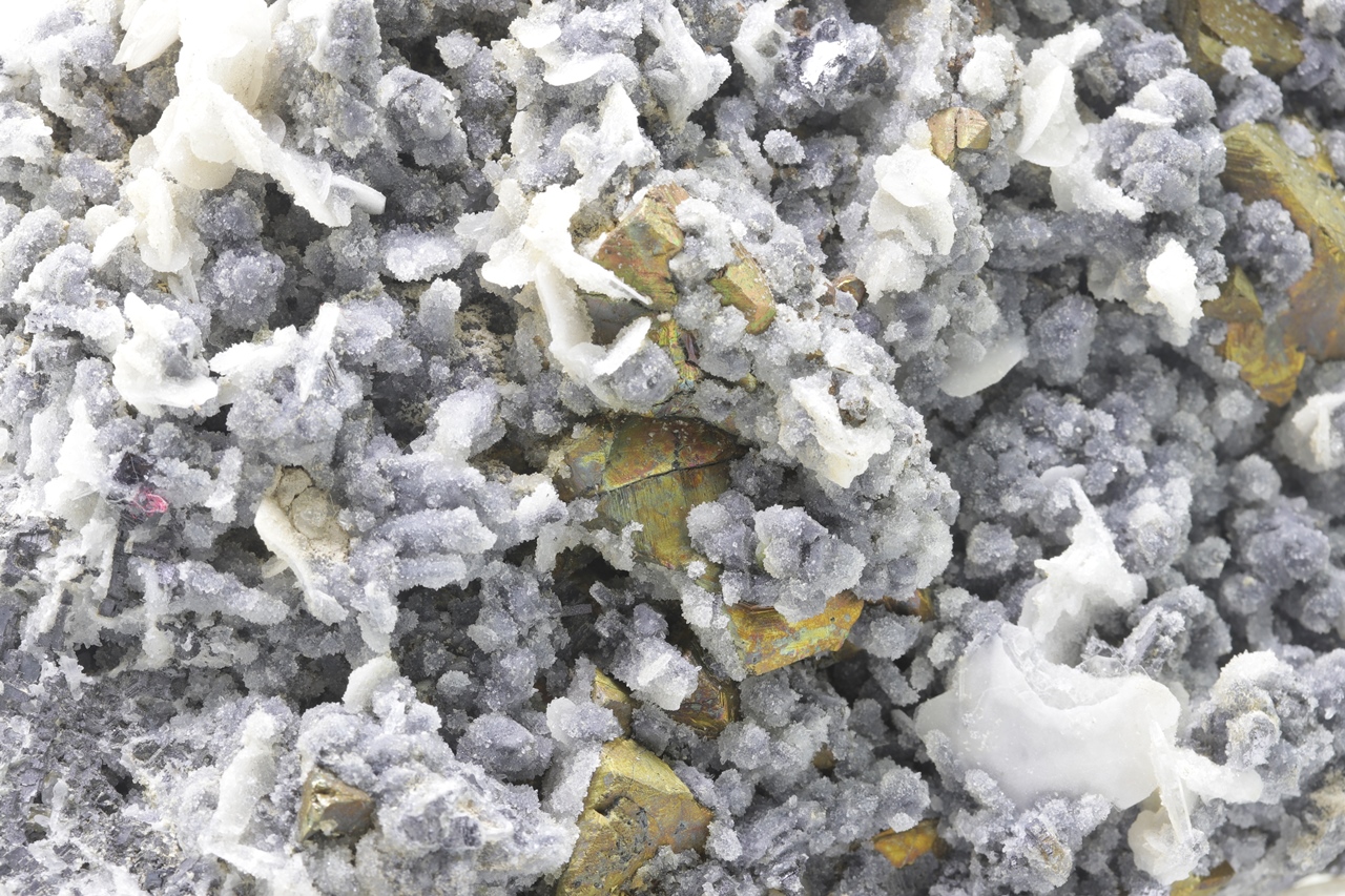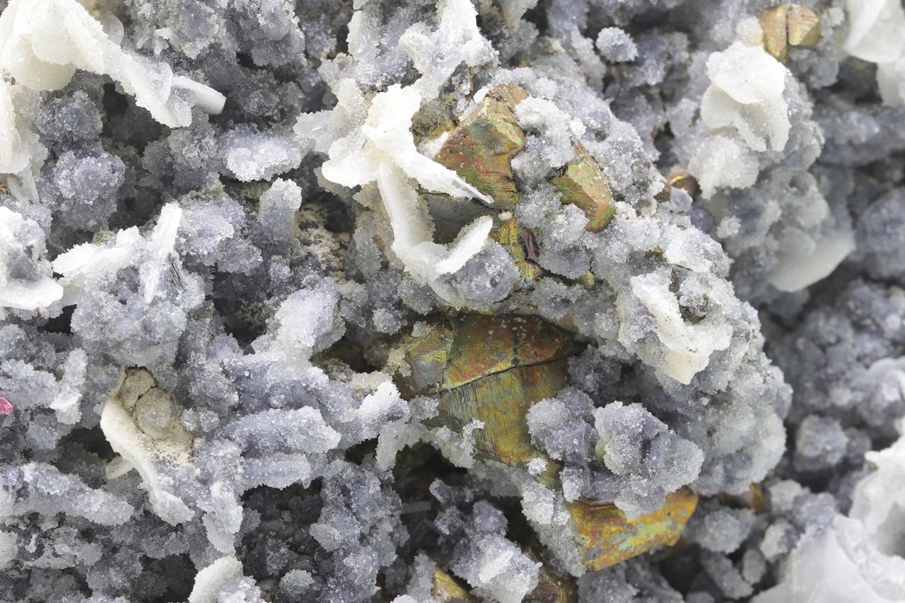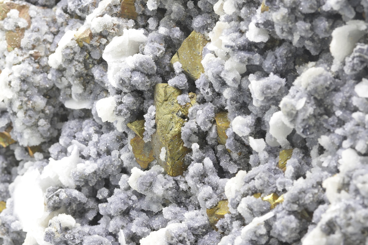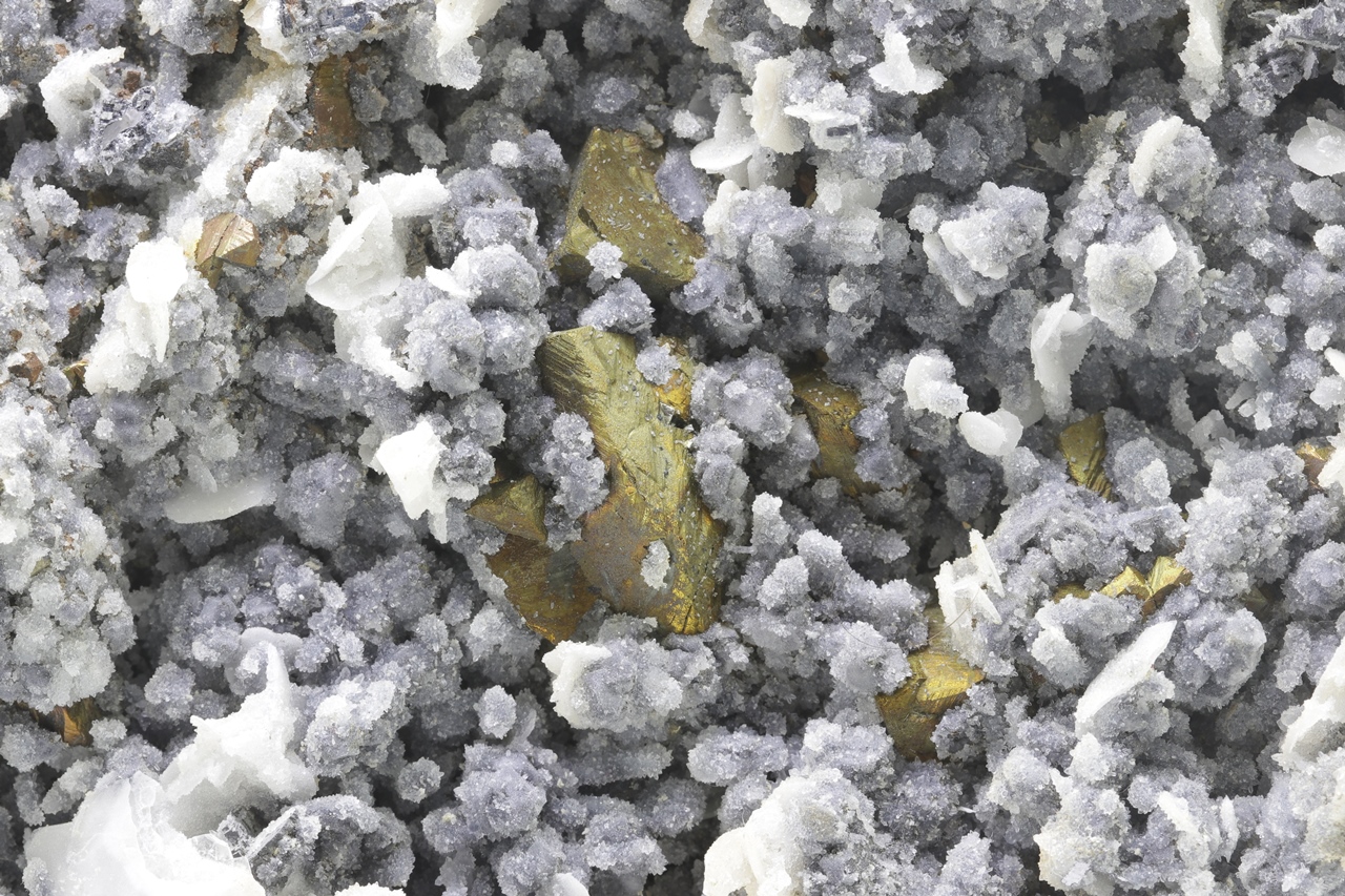 A druse of golden-colored chalcopyrite crystals overgrown with small gray quartz and plates of white barite.
