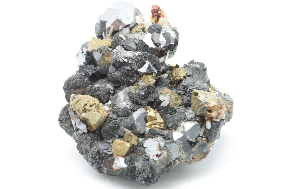 Chalcopyrite from the mines in Russian Dalnegorsk. A specimen of glossy crystals of Chalcopyrite on Quartz and Galena.