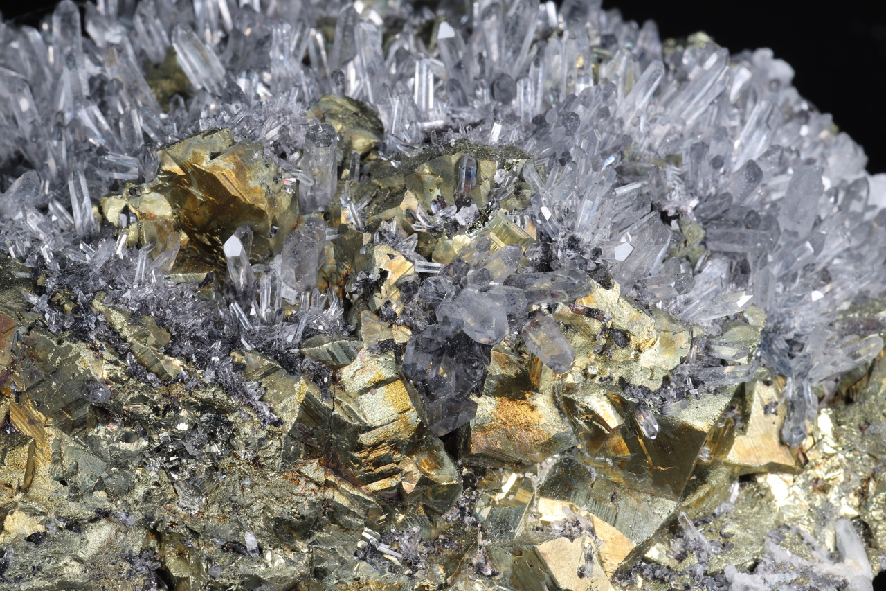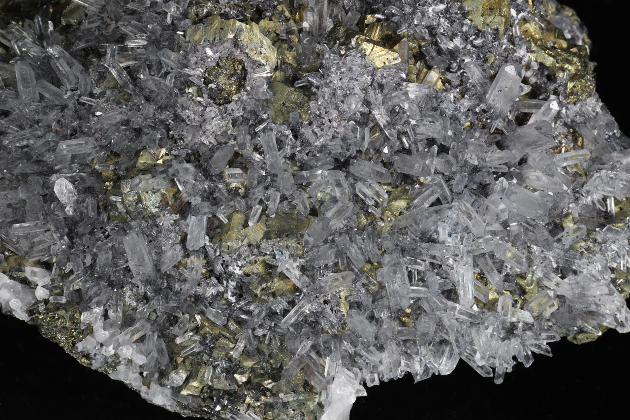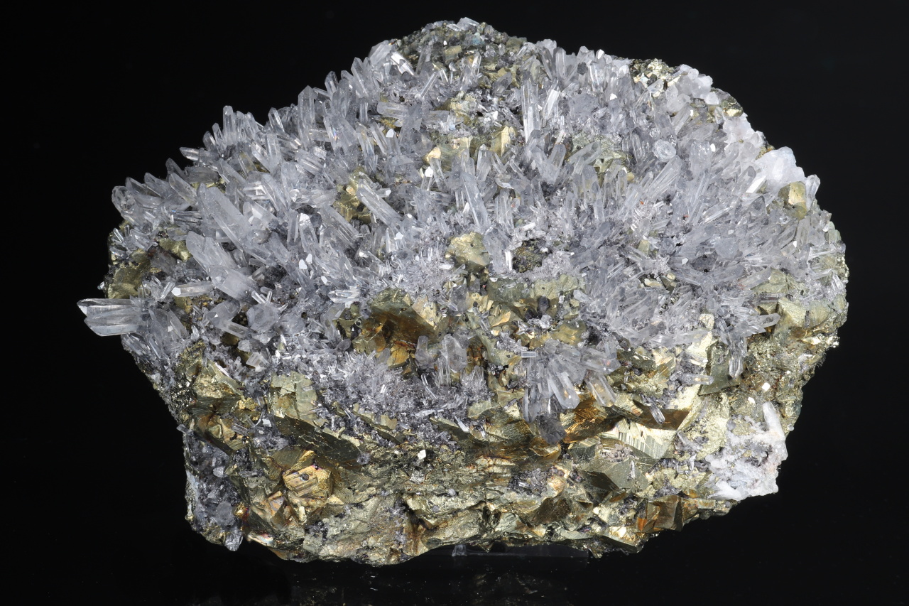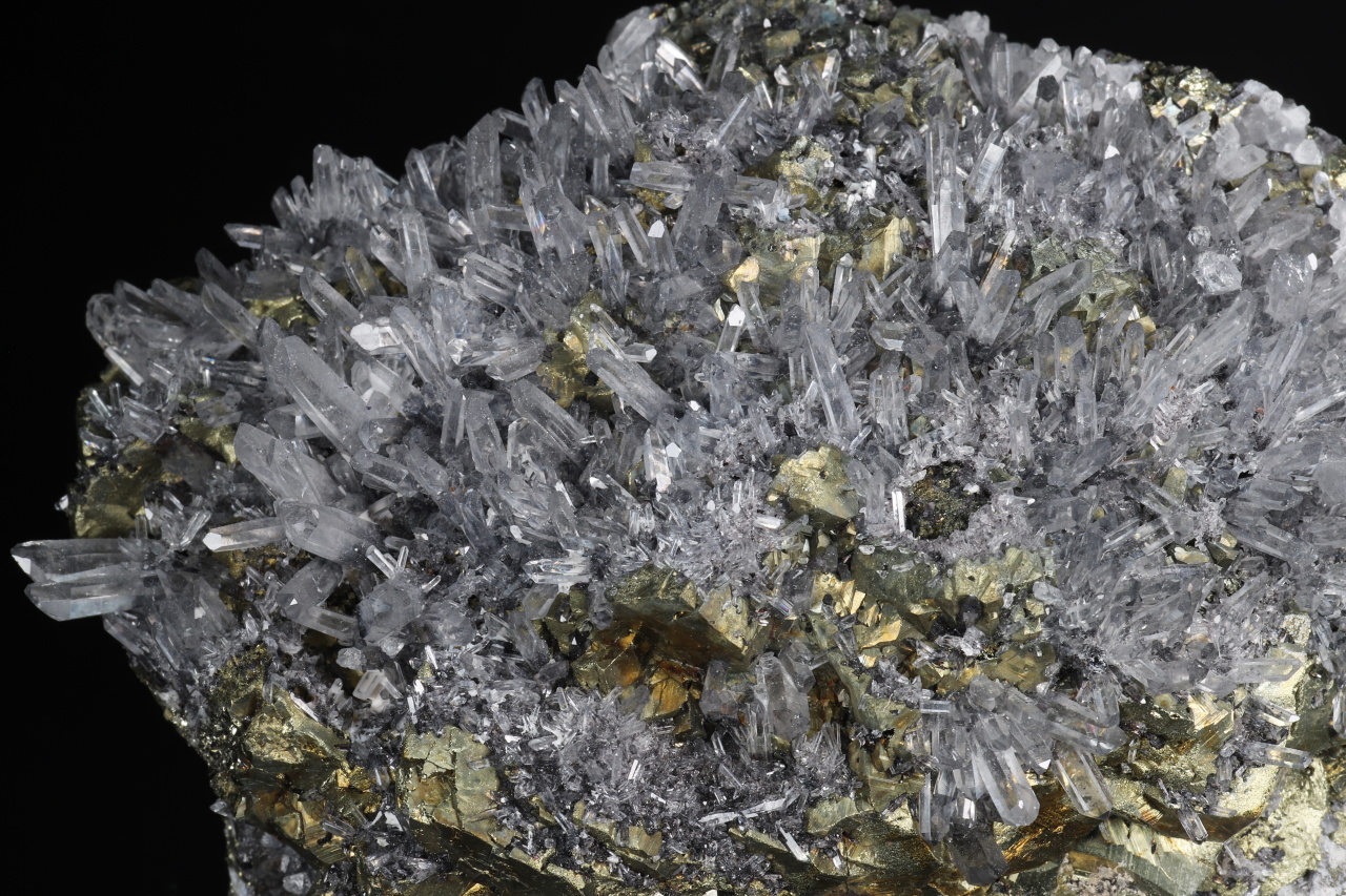 A very aesthetic druse of up to 2 cm large brass-shiny crystals of chalcopyrite with thinly columnar crystals of rock crystal. An effective specimen with an ideal format size of 12 x 8.5 cm.