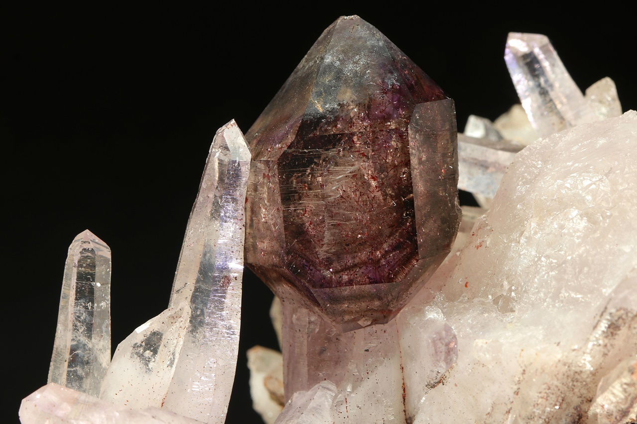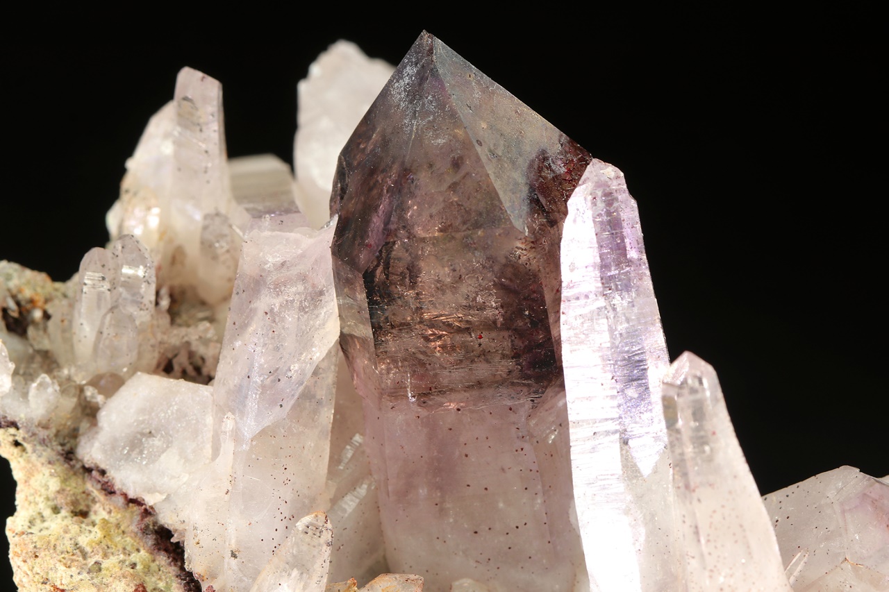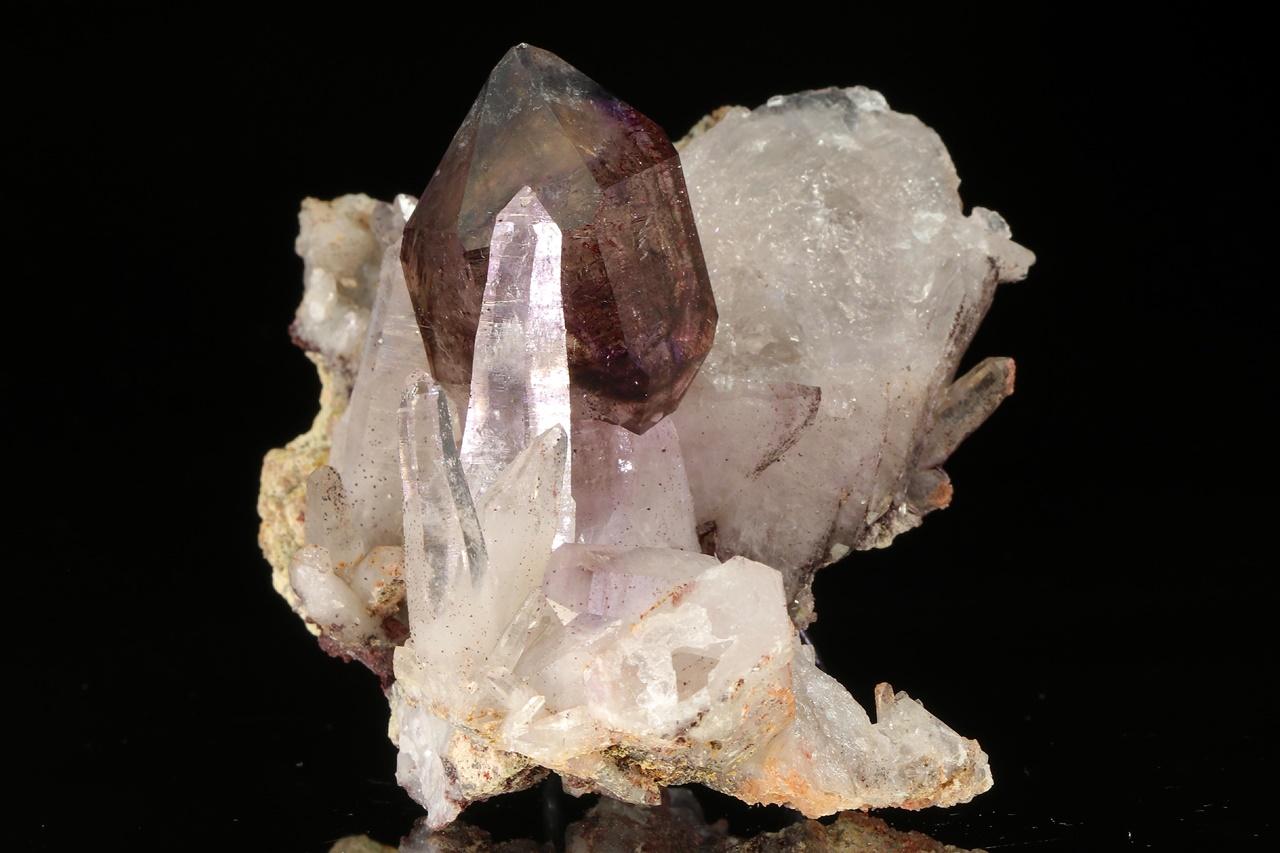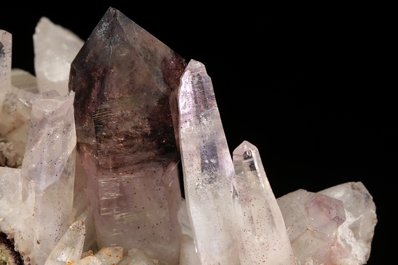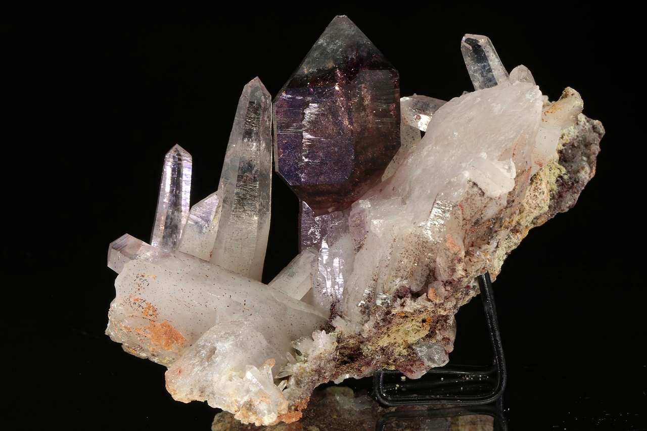 Druse of quartz crystals with a central, largest crystal capped by a dark amethyst pigeon loft size of 3 cm, the total length of the crystal is 5 cm.