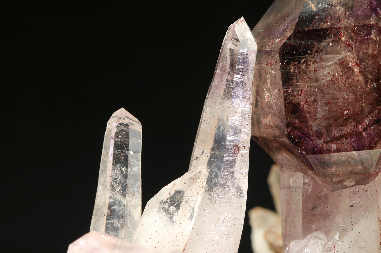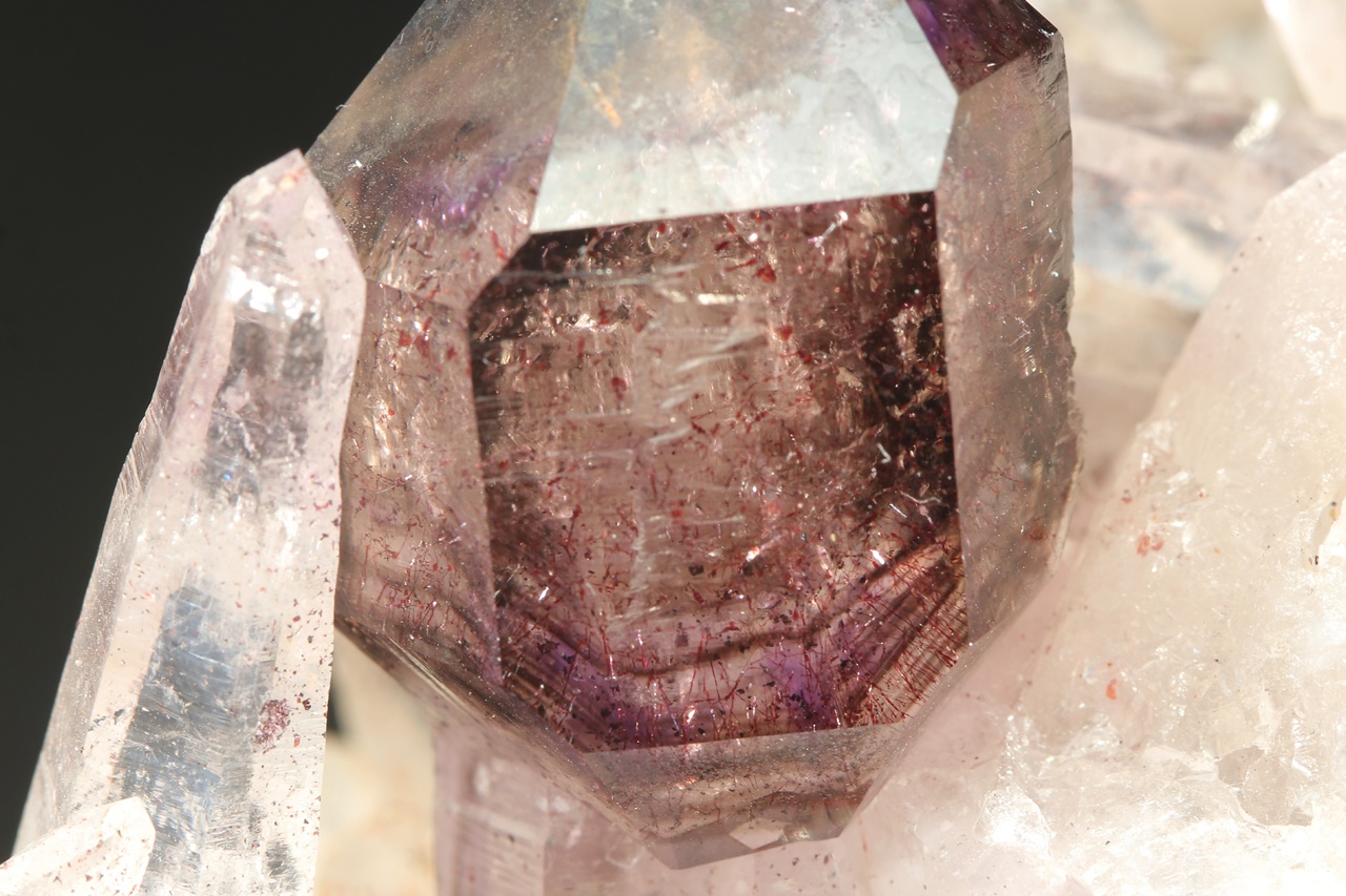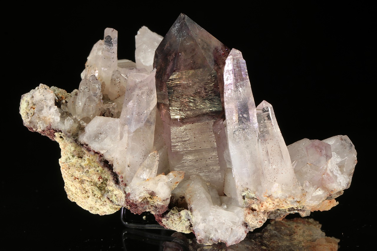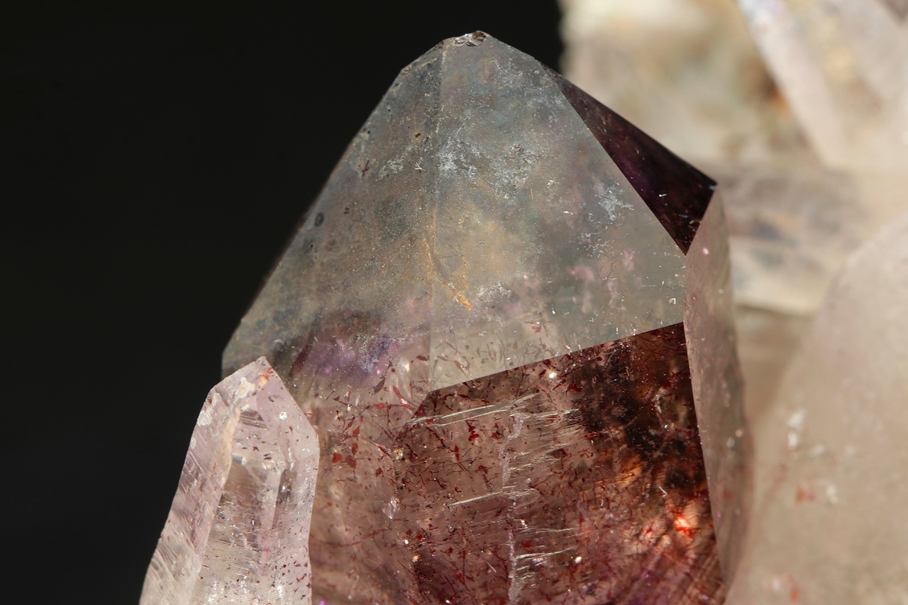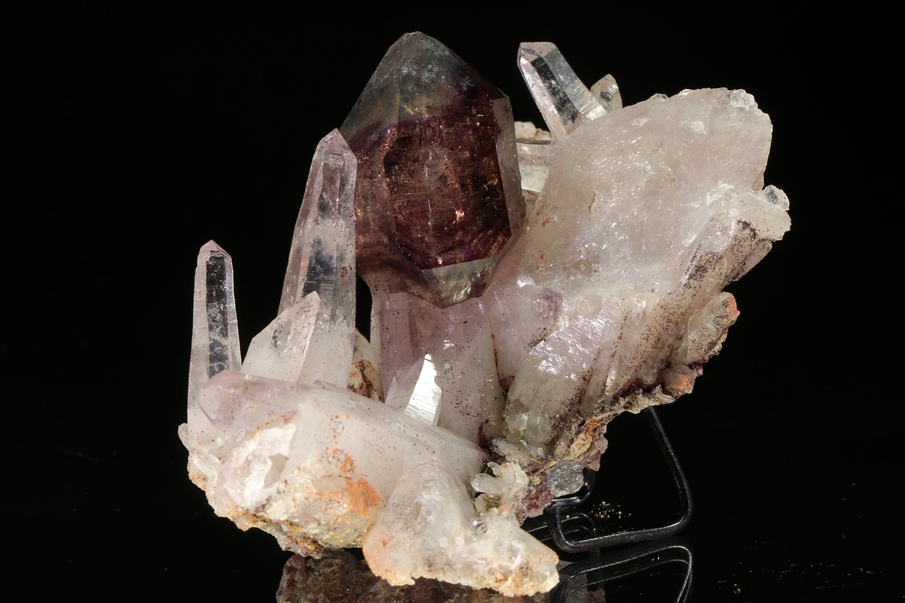 Druse of quartz crystals with a central, largest crystal capped by a dark amethyst pigeon loft size of 3 cm, the total length of the crystal is 5 cm.