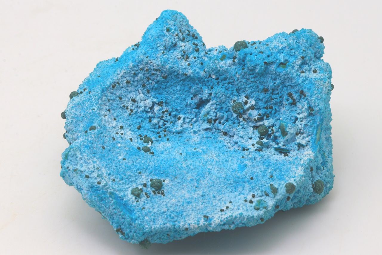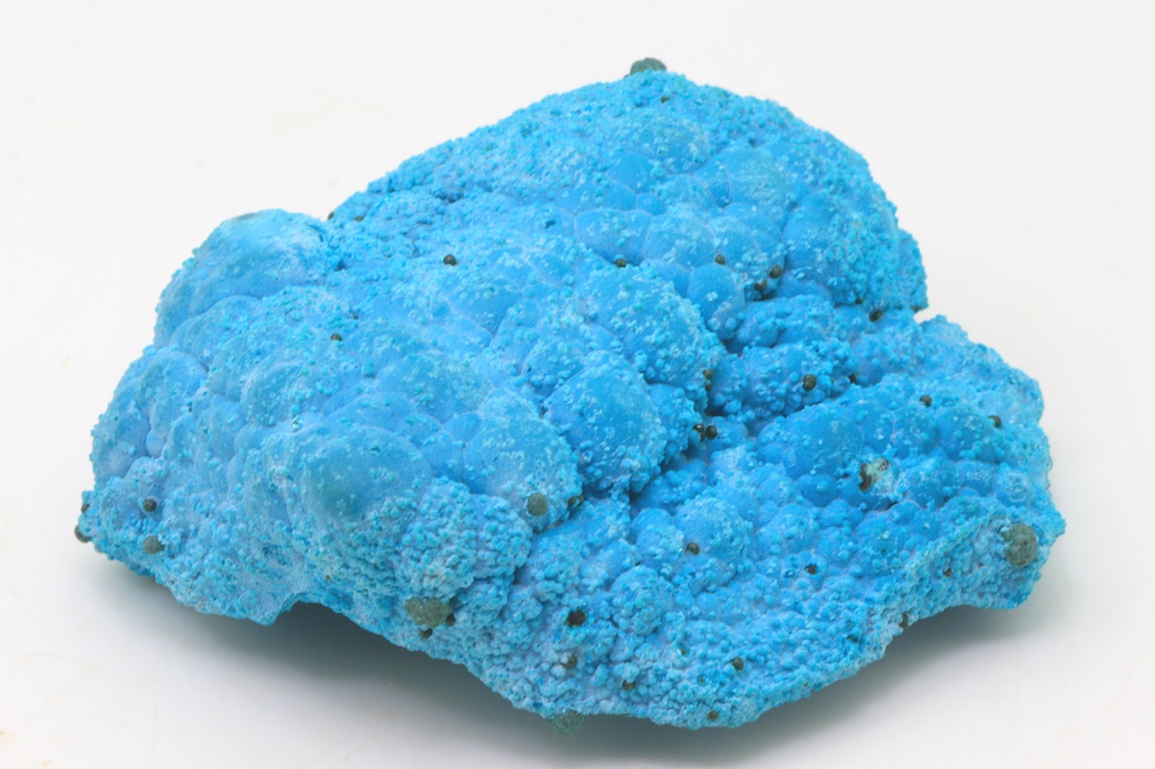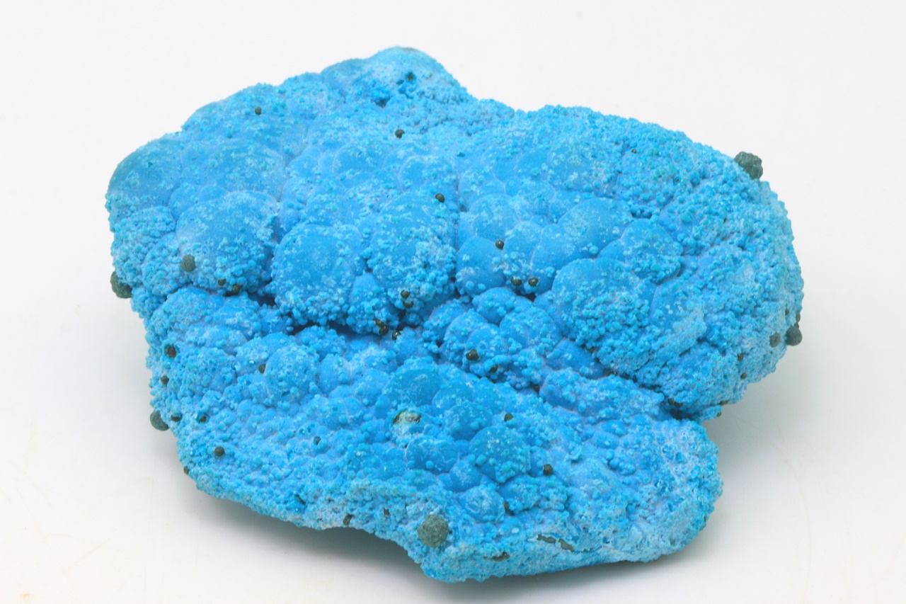 Magnificently blue chrysocolla of world quality forming reniform aggregates covered with approximately 1 mm large spherical aggregates of the same mineral and up to 4 mm large balls of malachite. The sample is stabilized, therefore it does not lose water over time and hence its color.