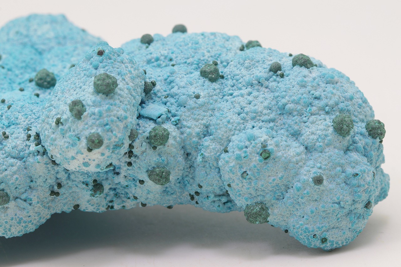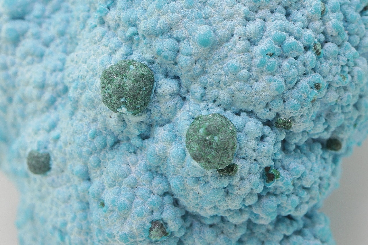 Beautiful blue chrysocolla forming kidney-shaped aggregates covered with approximately 1 mm large spherical aggregates of the same mineral and up to 4 mm large balls of malachite.