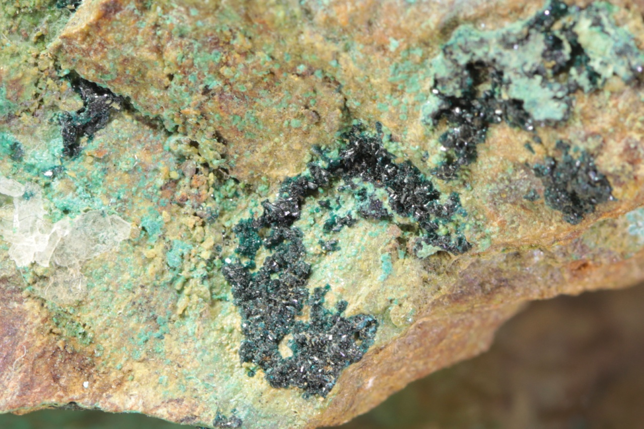 Tiny crystals of dark blue Clinoclase with green Tyrolite.