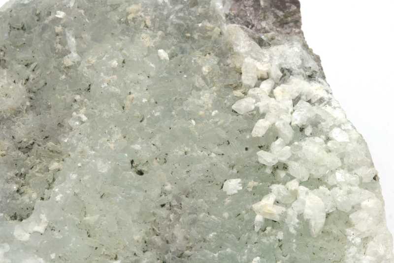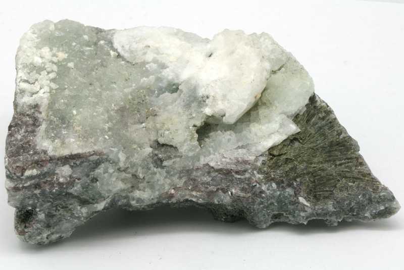 A classic example of Alpine paragenesis from the Libodřice quarry. A sample of pale green prehnite with overgrown grass-green bladed aggregates of clinozoisite and white crystals of analcime and apophyllite.
