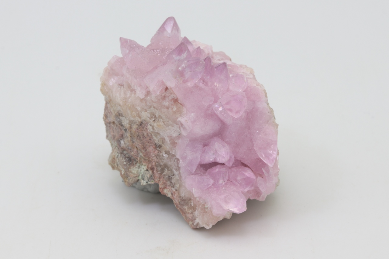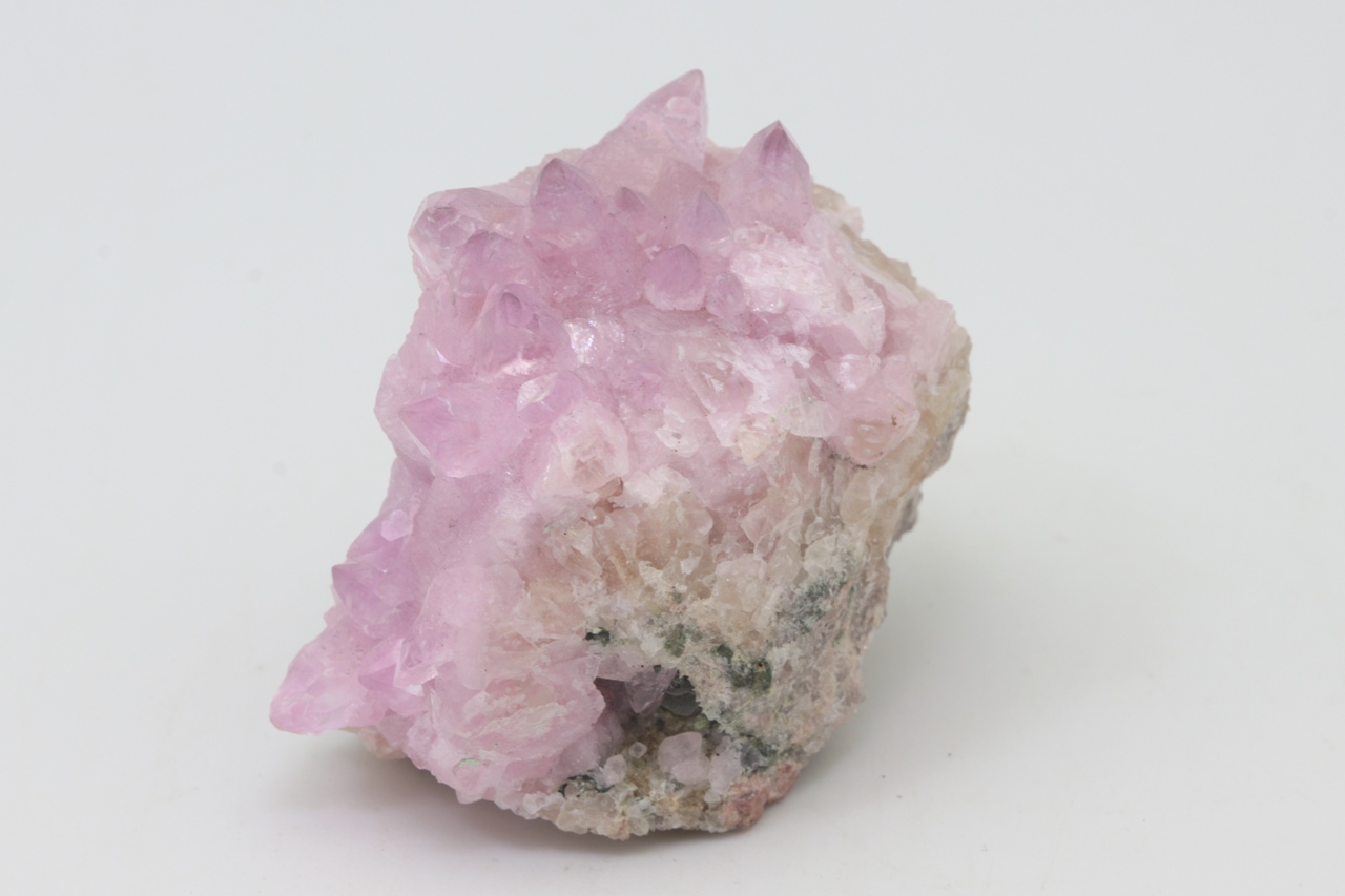 Cobalto-calcite on the sample forms tapered pale pink, vitreous luster, translucent elongated and nicely shaped scalenohedra that reach a size of up to 1 cm and sit on the underlying rock. The sample is very rich in this mineral and comes from the Katanga locality, DR Congo.