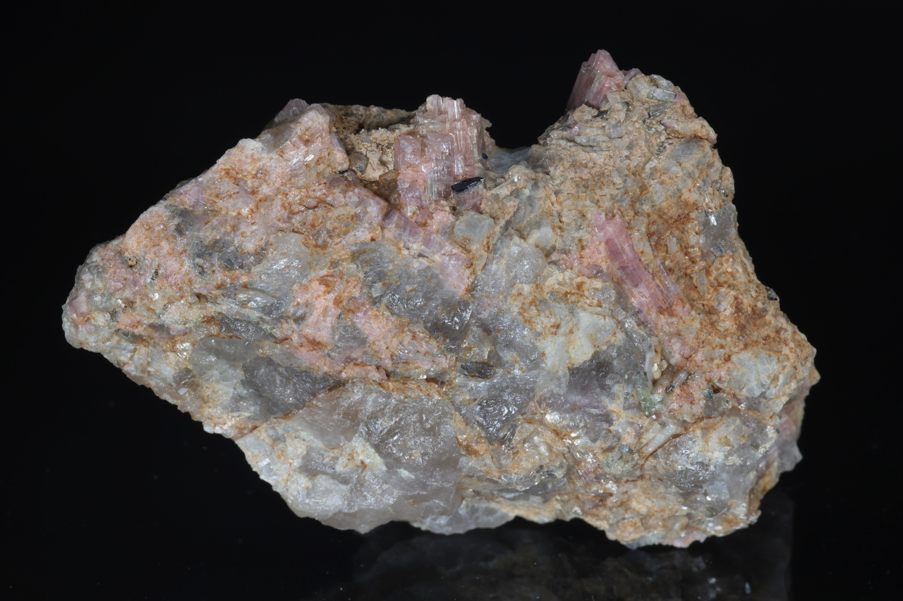 Sample of lithium pegmatite with columnar crystals of pink tourmaline – elbaite and a black, approximately 2.5 mm large crystal of columbite.