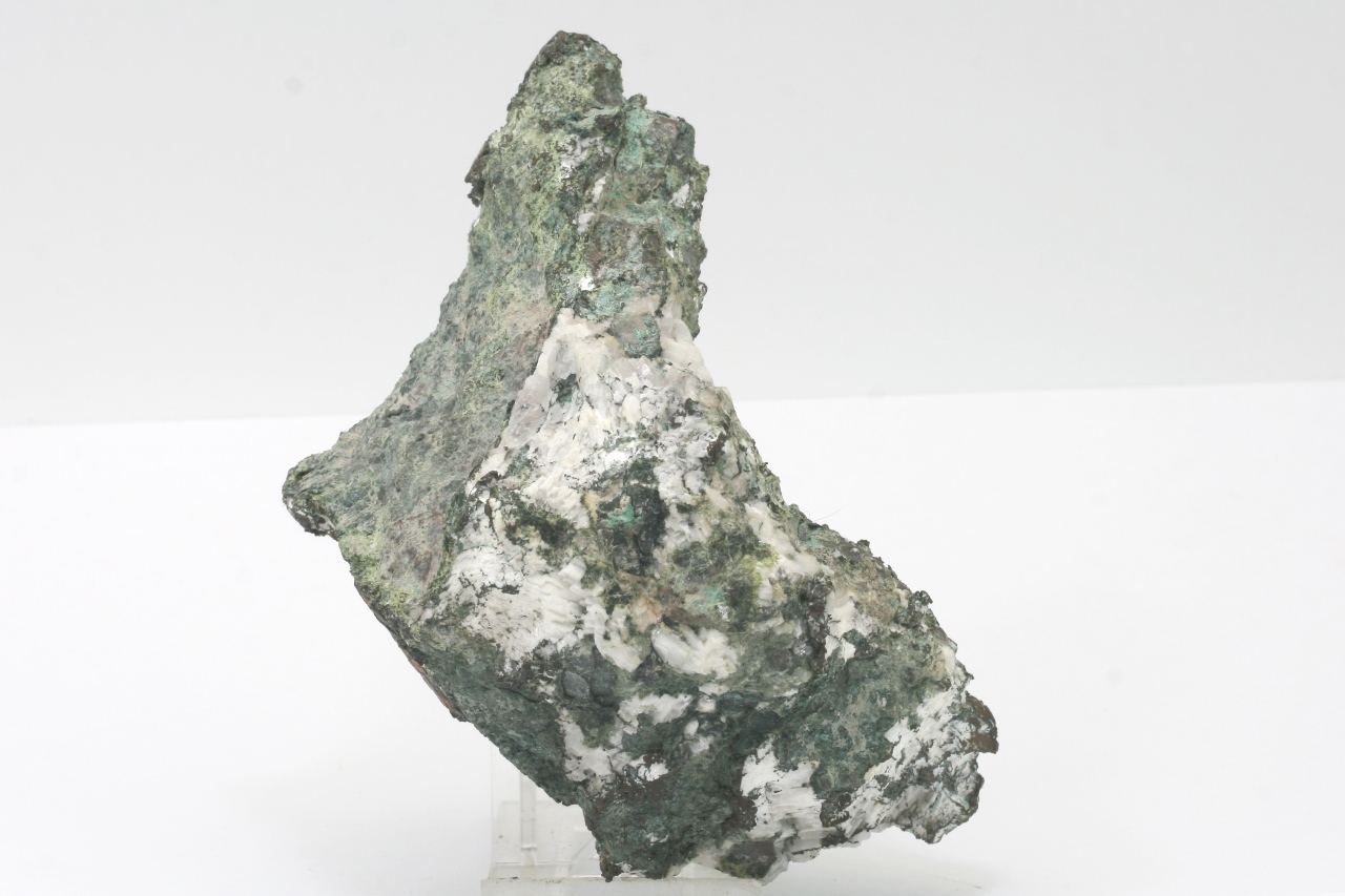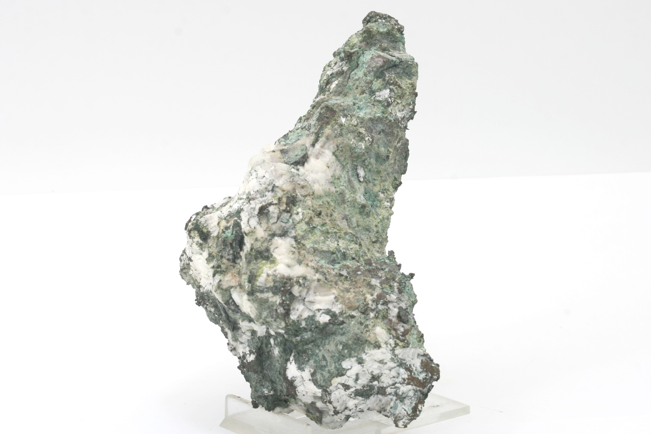 Natural unmodified native copper embedded in calcite with a surface coated with secondary minerals. The copper’s shape resembles a seal.