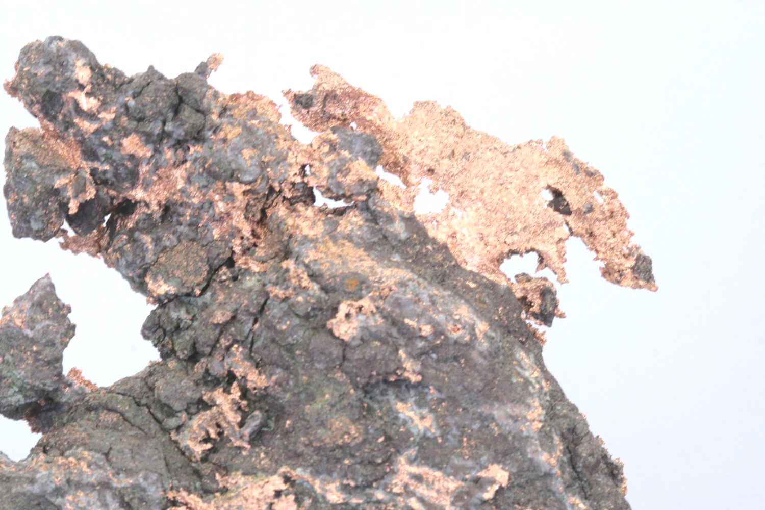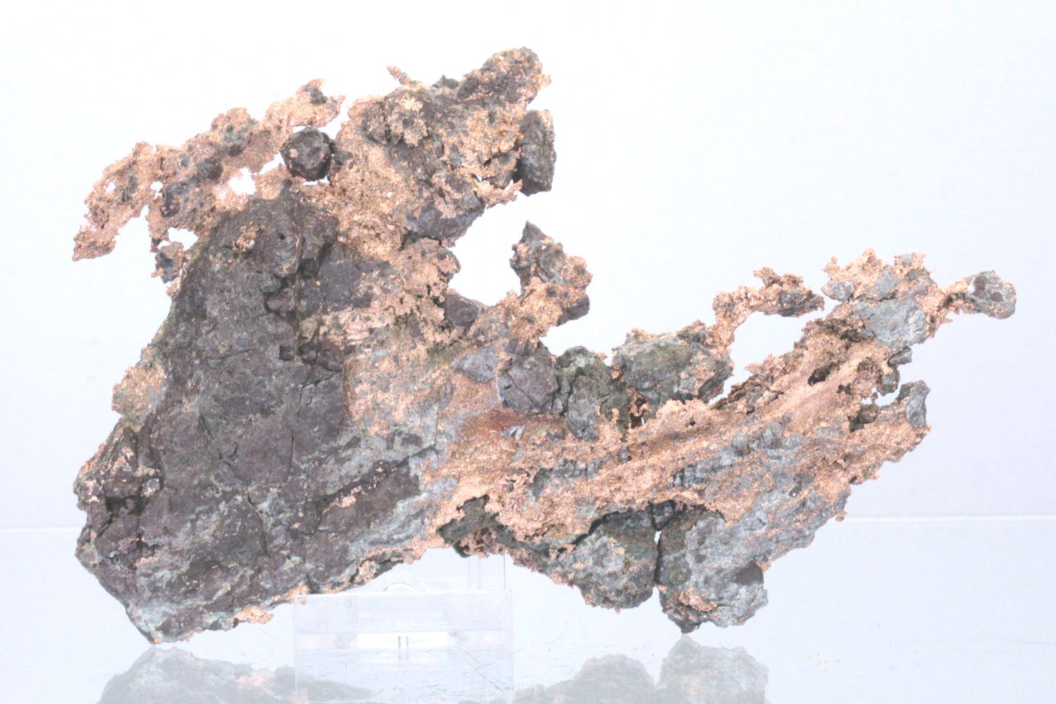 A magnificent specimen of a large aggregate of reddish copper partially covered with green and brown copper oxides.