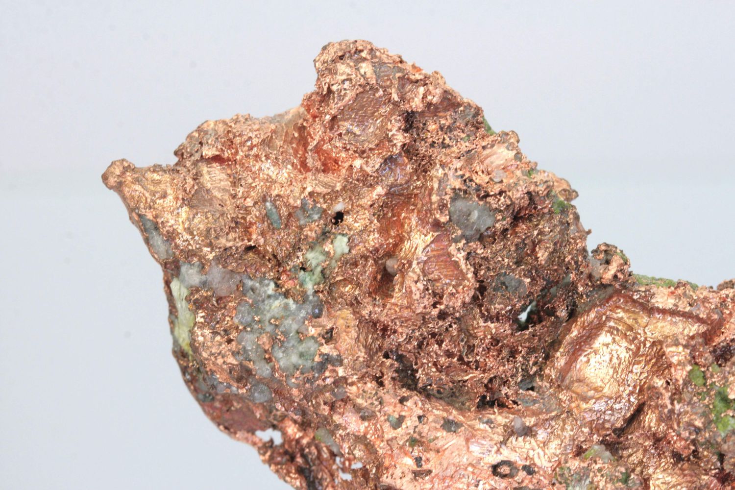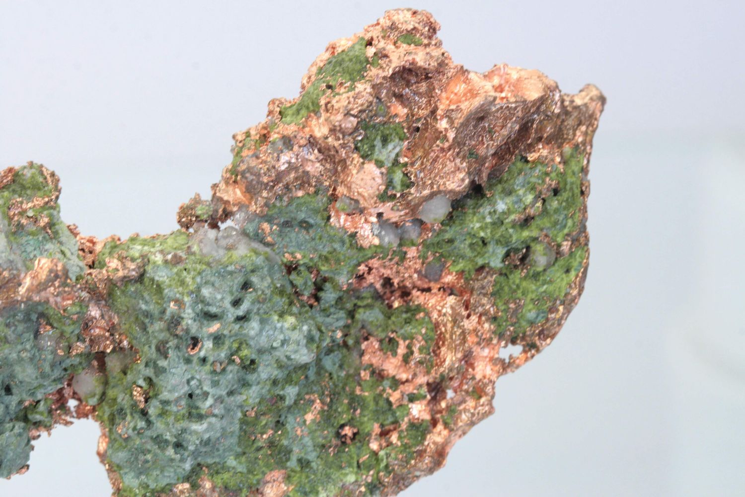 Beautiful specimen of a large aggregate of reddish copper partially covered with green copper oxides.
