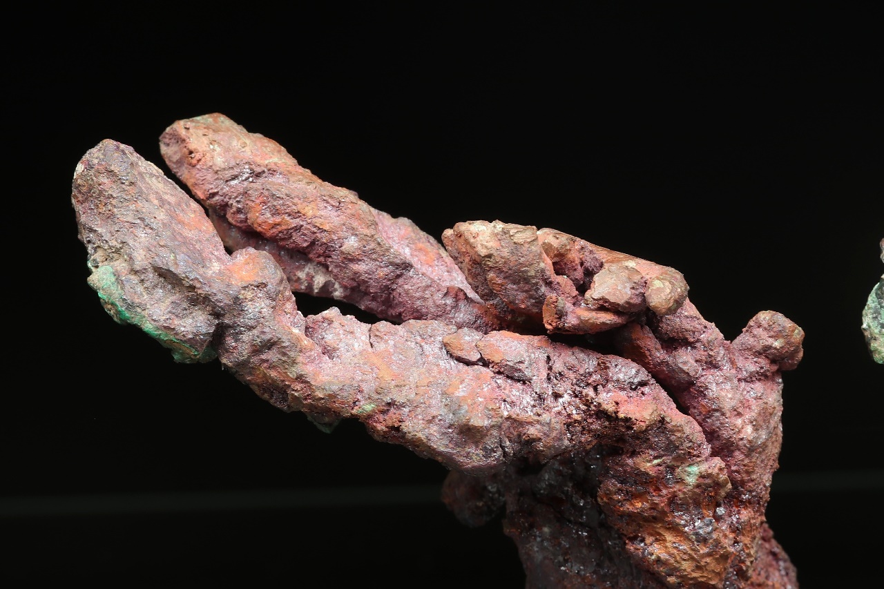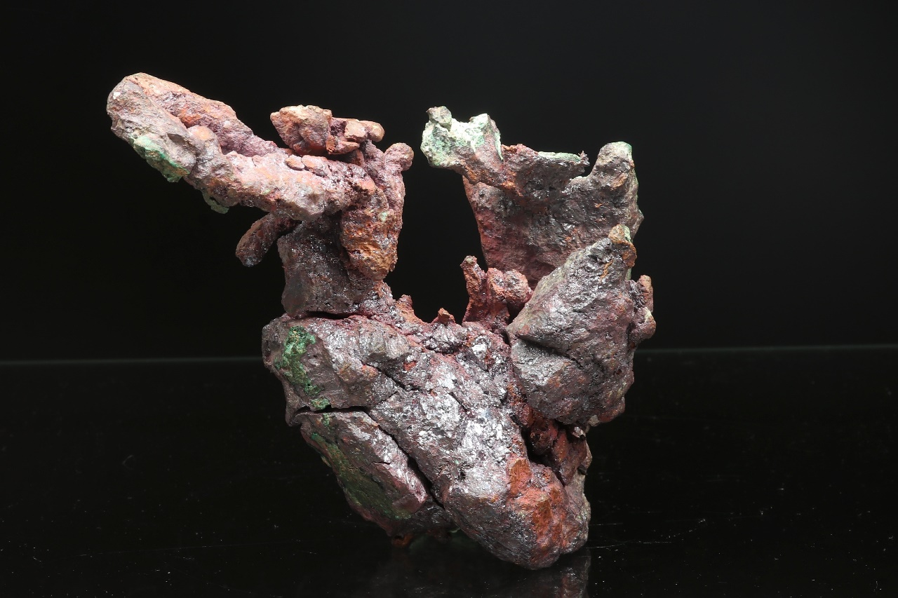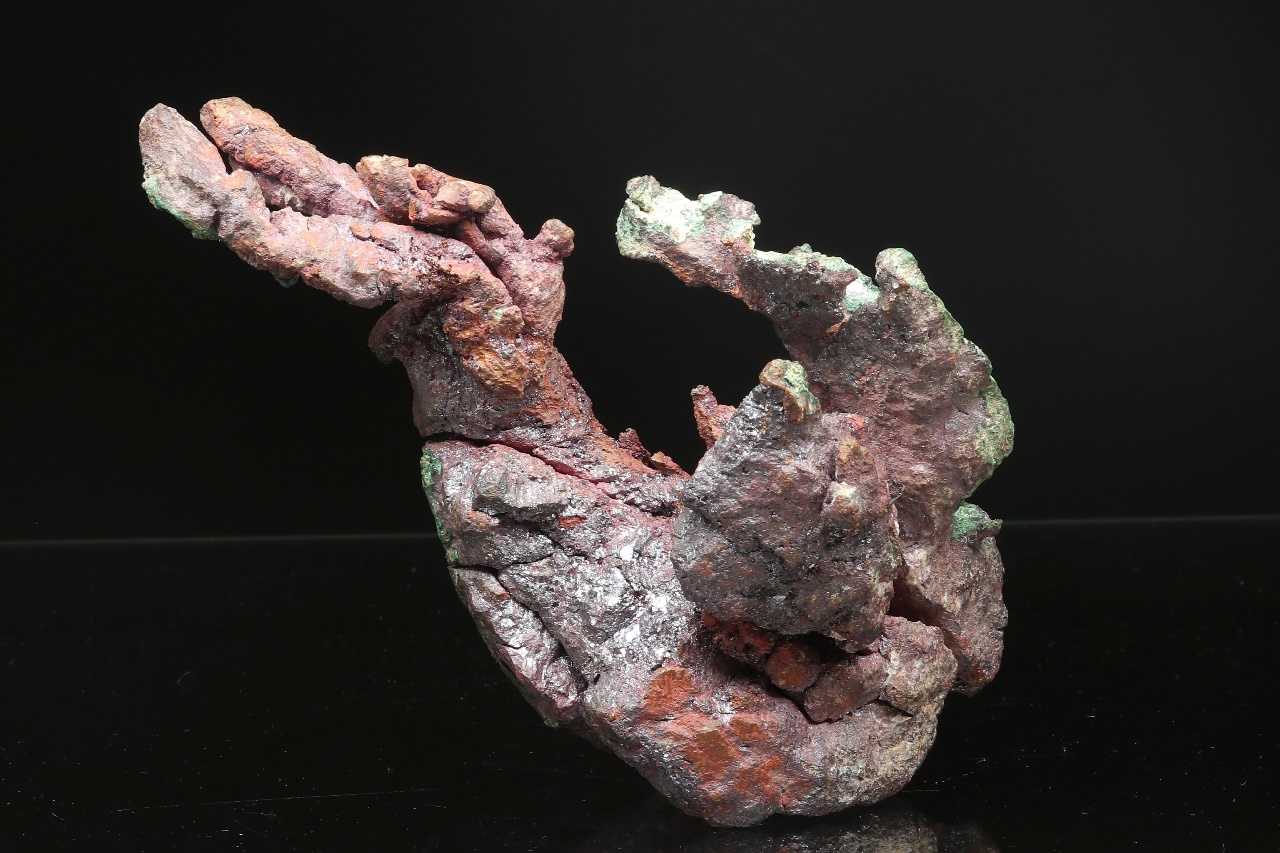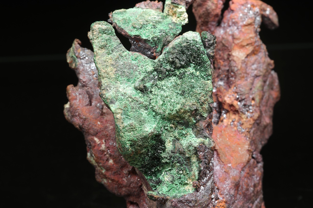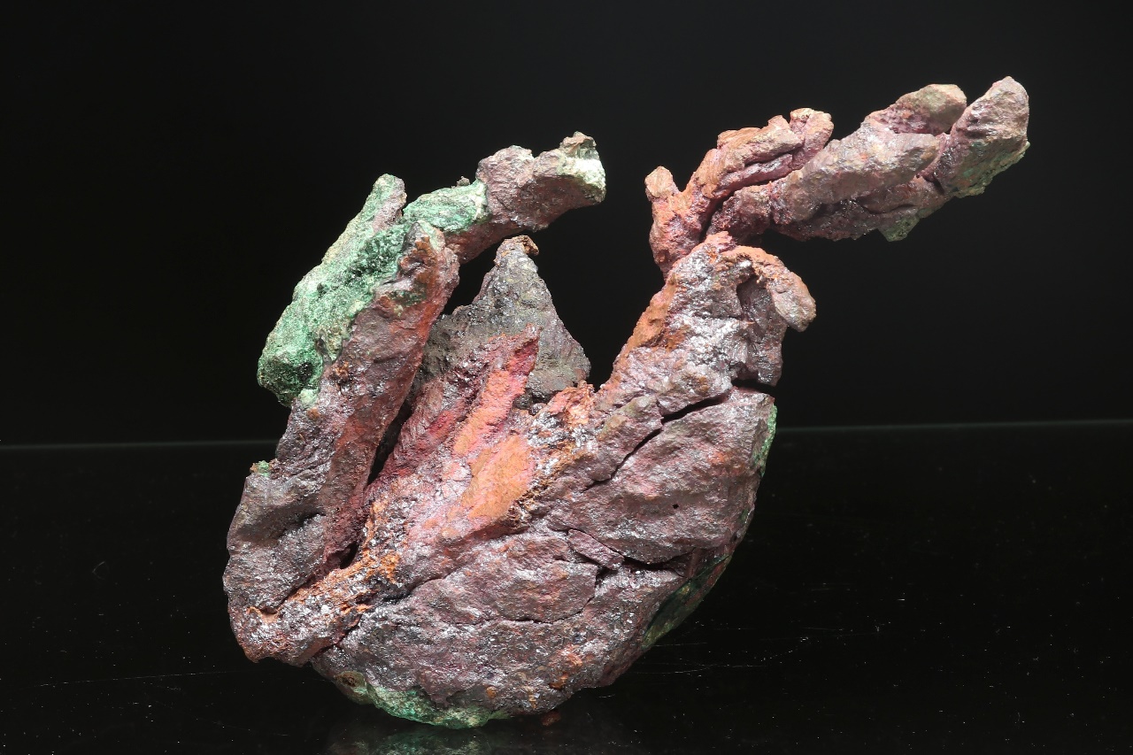 A very aesthetic sample of natural copper in the shape of a flame. The copper is locally overgrown with black shiny Cuprite and green Malachite.