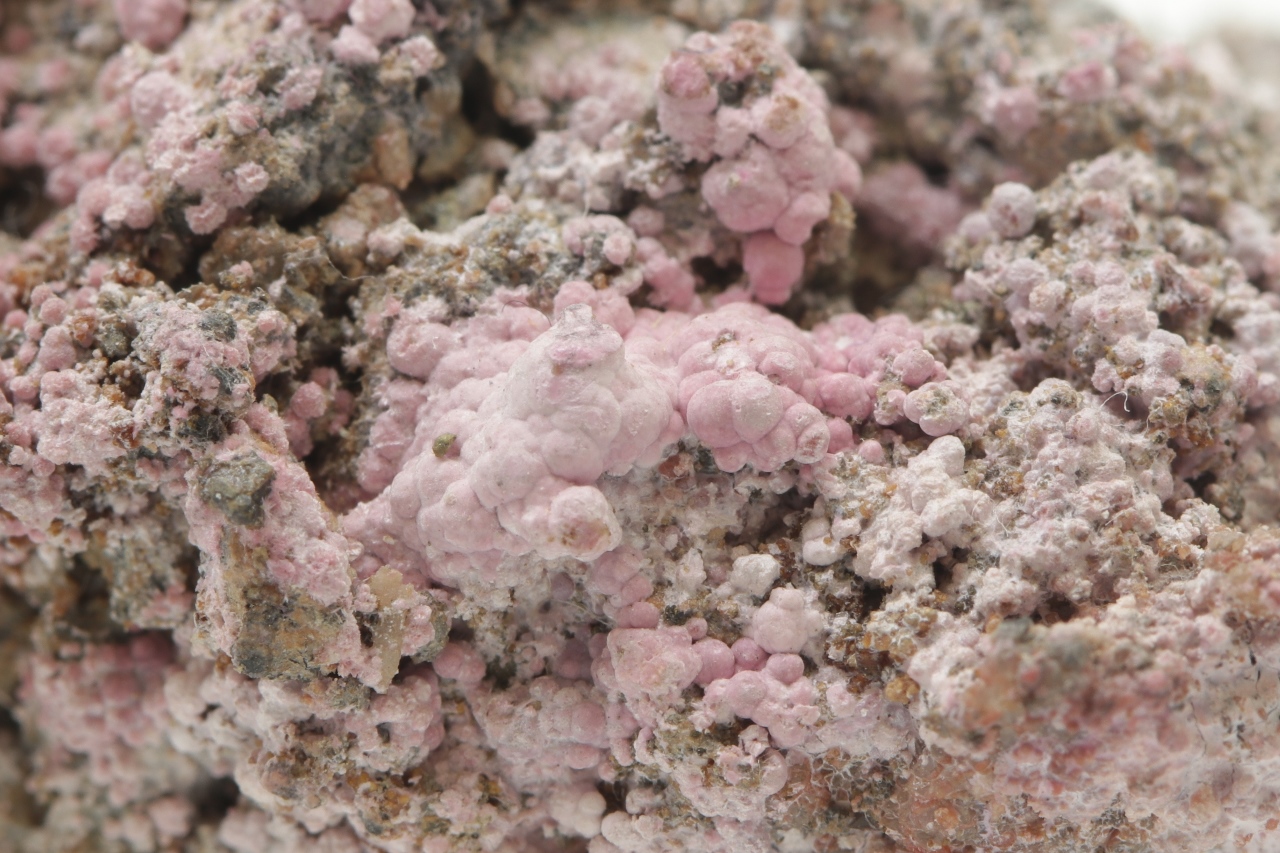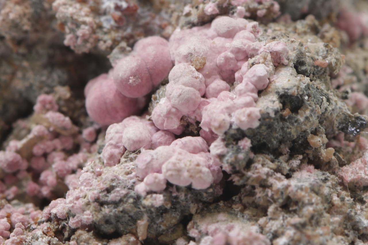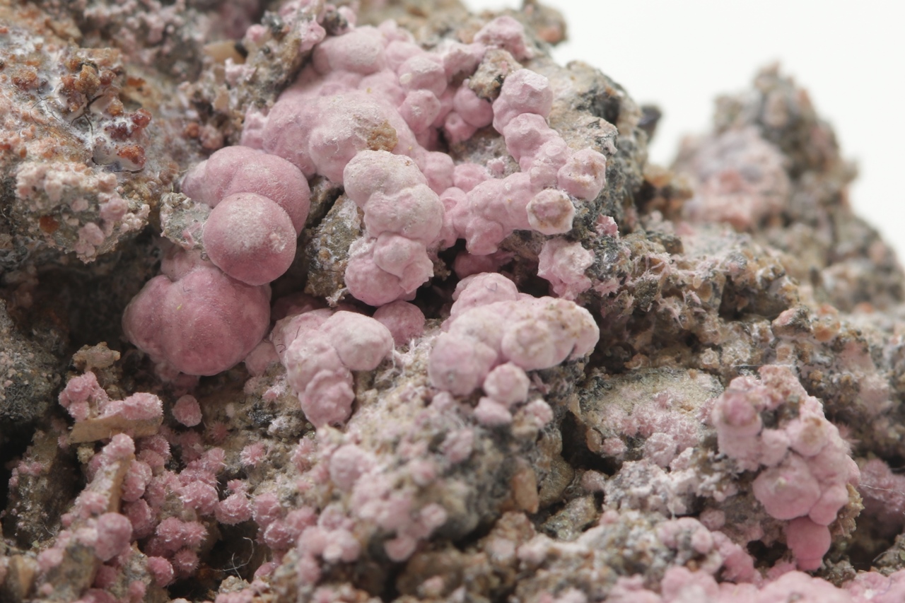 Spherical aggregates of pink zinc arsenate. The specimen comes from the 12th level of the Svornost mine, Geschieber vein .