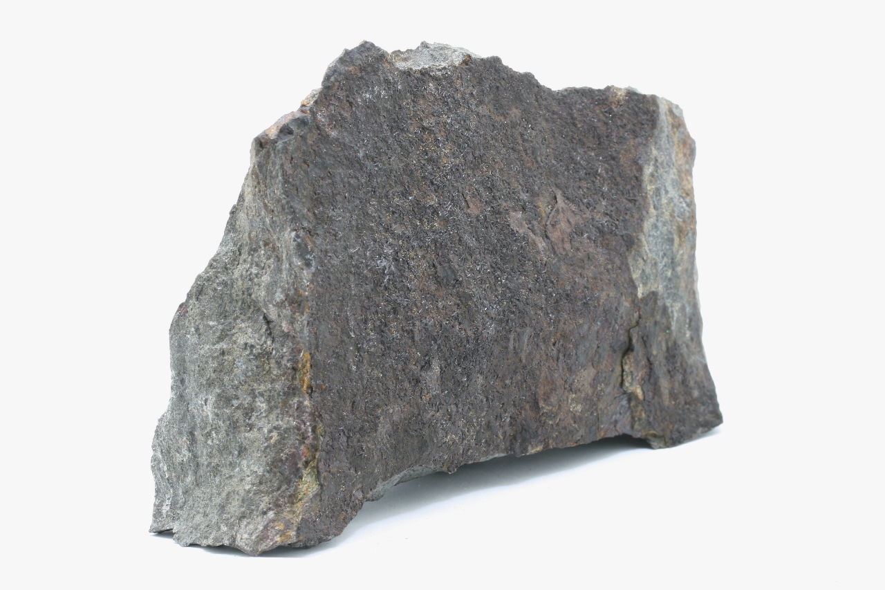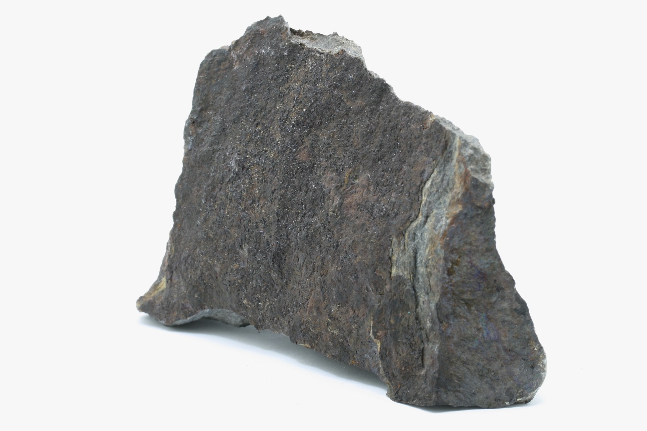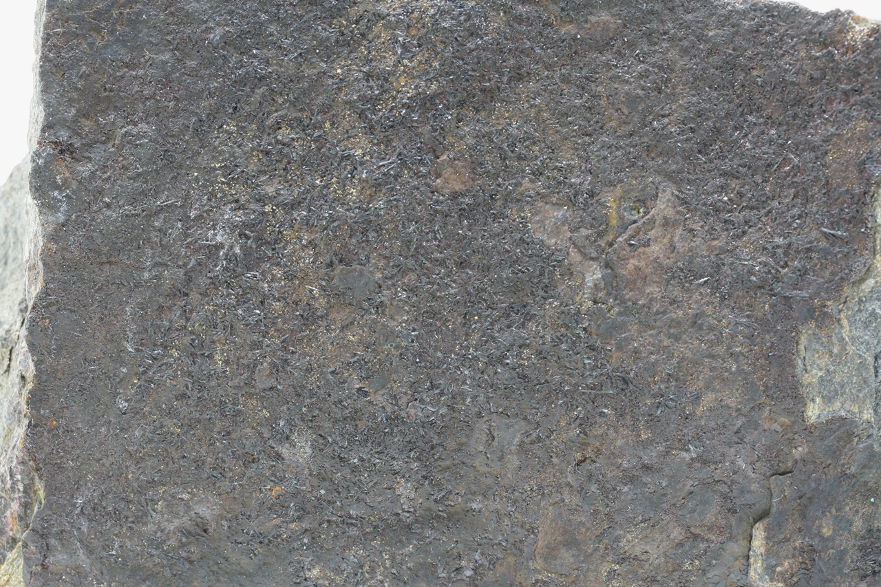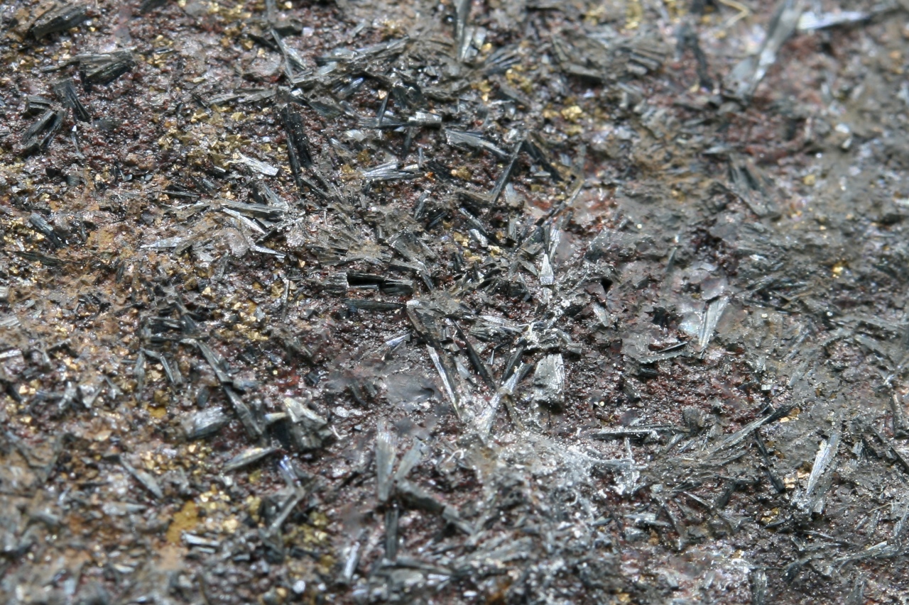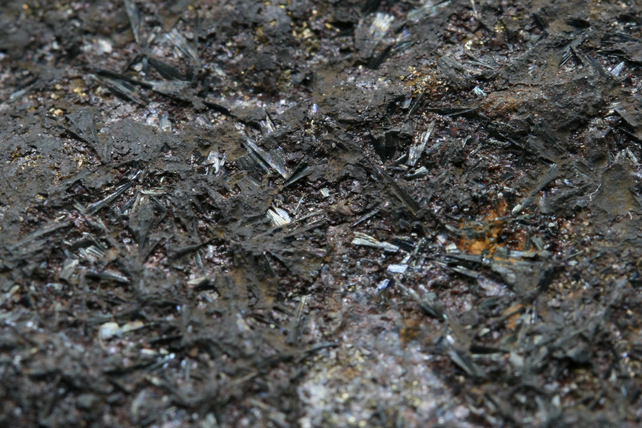 Tiny black columnar iron silicate grown on an open fissure. The largest crystals are approximately 2 mm.