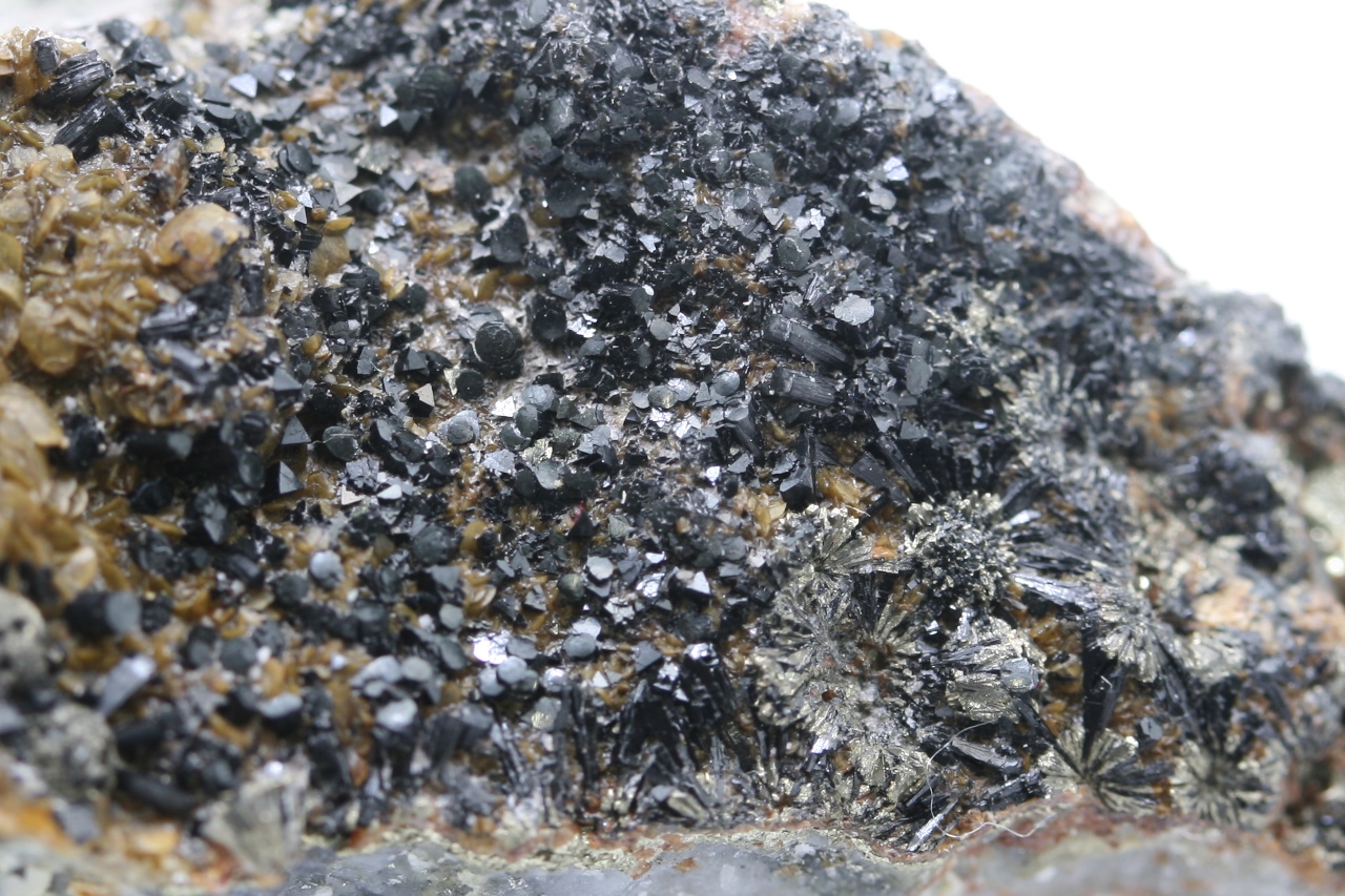 Black columnar crystals of a rare iron silicate. The largest crystals are 4 mm in size .