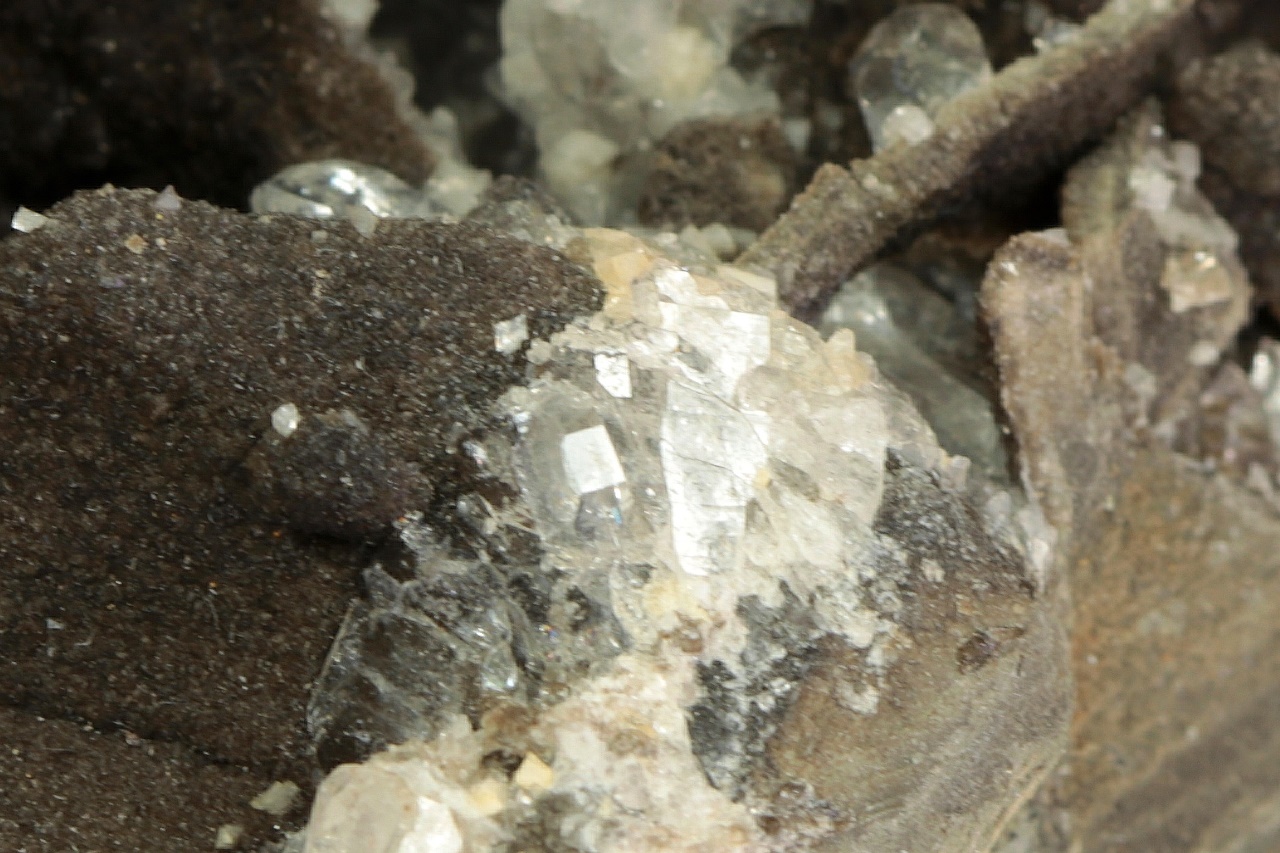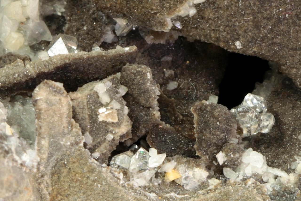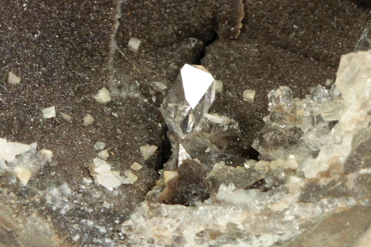 Very clean and shiny quartz crystals unusually included in a pelosiderite concretion. Similarly very clean and shiny crystals are sometimes collectively referred to, along with their place of origin, as so-called diamonds (e.g., Herkimer, Maramureș). The size of the largest crystal is 5 mm.