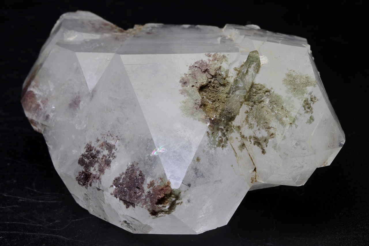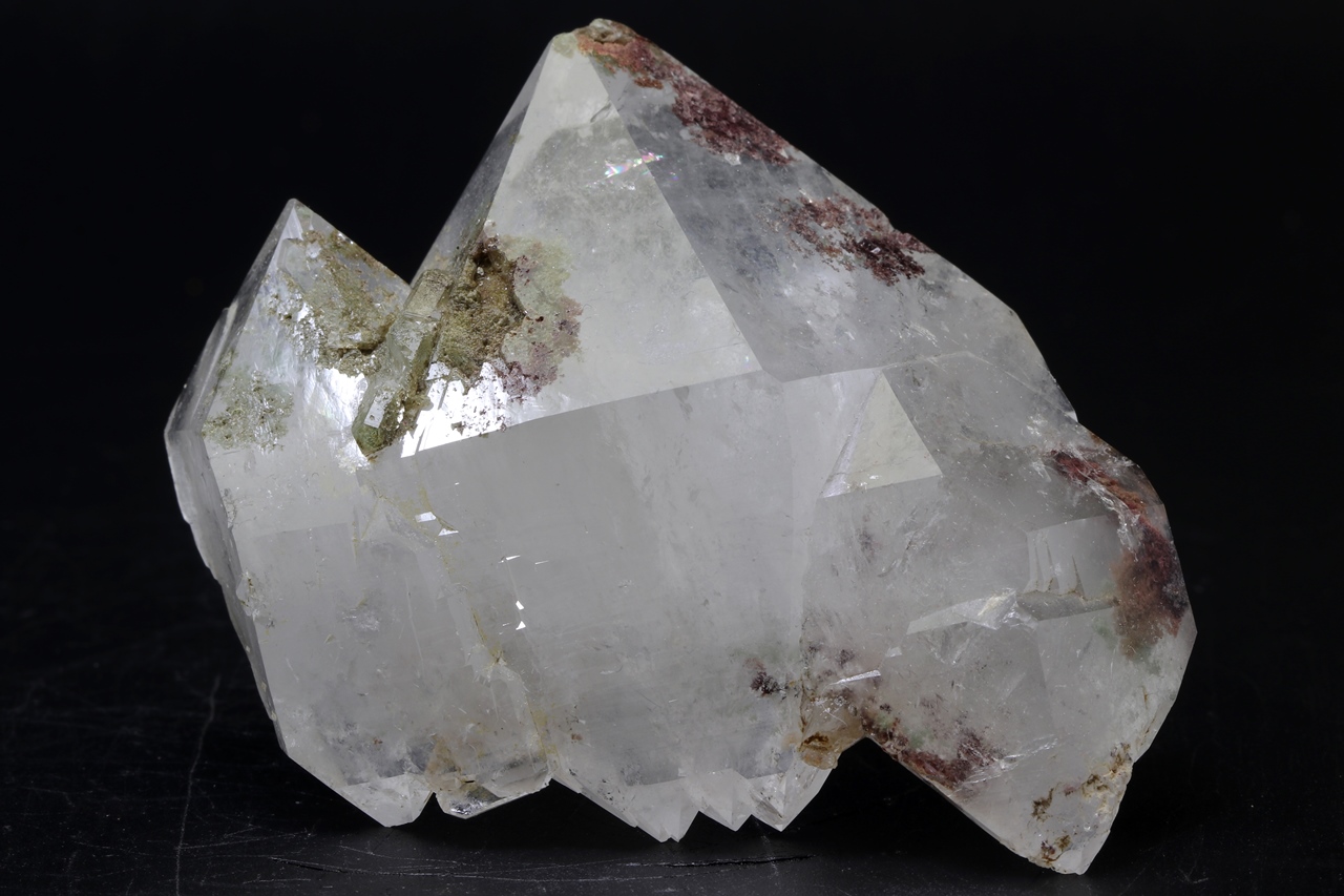 Growth of several crystals of quartz with embedded green Chlorite and red Hematite. The specimen is a “floater”, terminated on all sides by shiny surfaces.