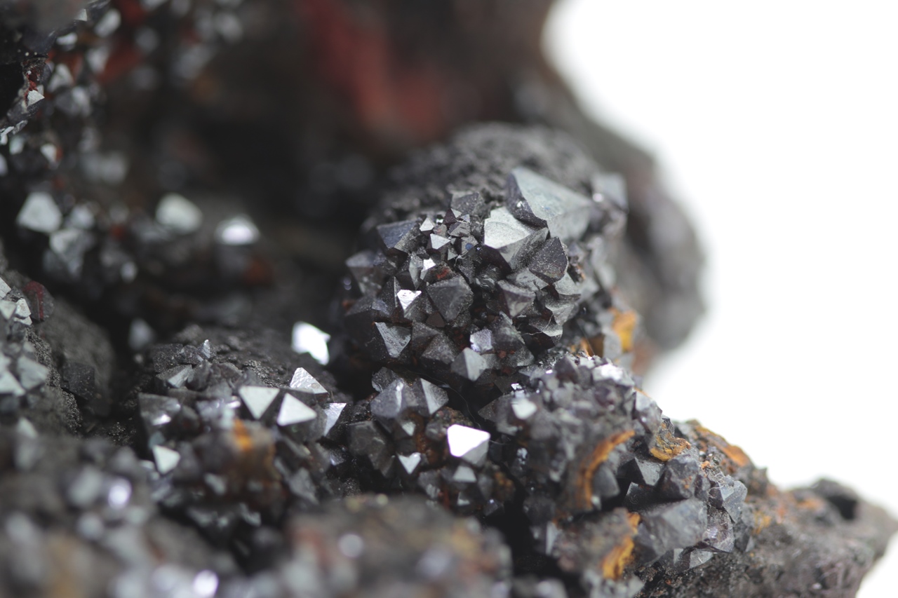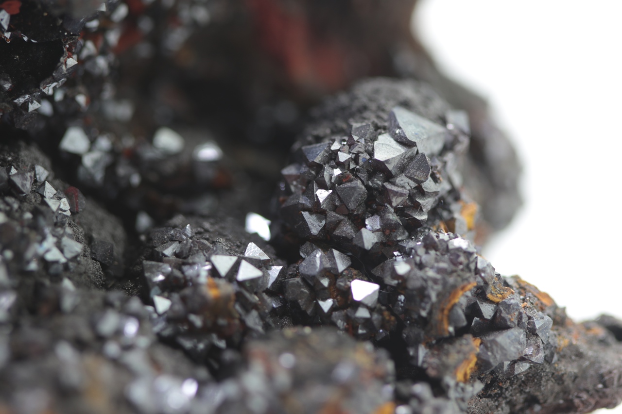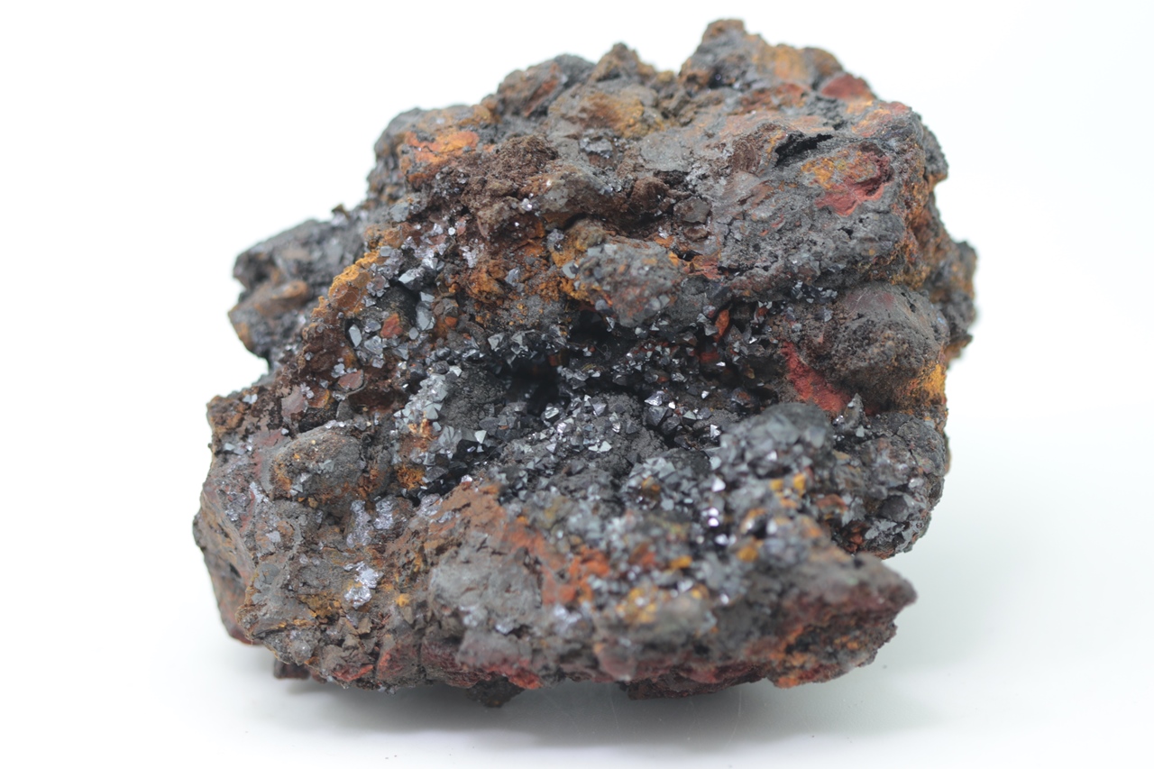 Cuprite on the sample forms, especially in the present open fissures, small, steel gray, metallic lustrous dipyramidal crystals, which reach sizes up to 4 mm and sit on a strongly limonitized substrate rock. This specimen is a nice example of this copper oxide. The specimen comes from the Chinese mine Chenmenshan.