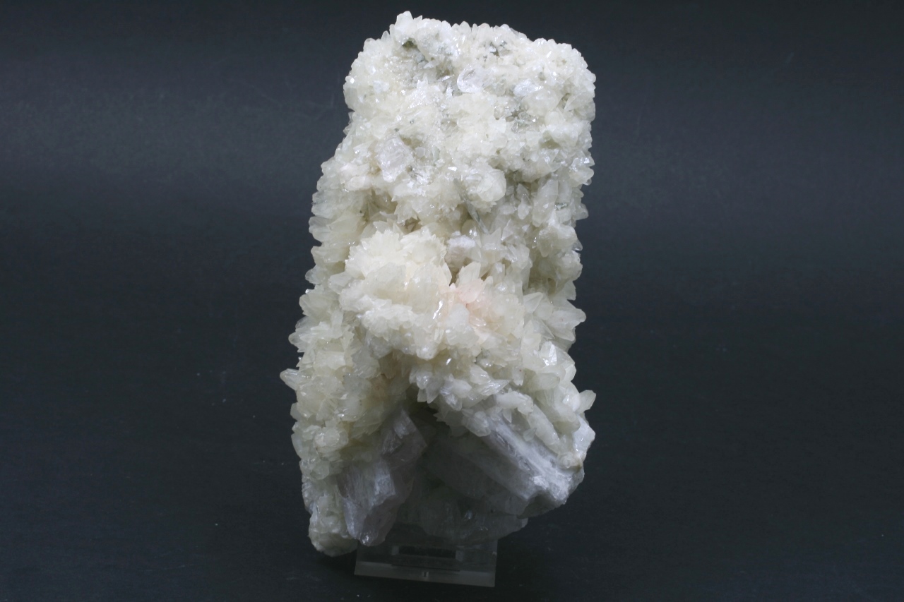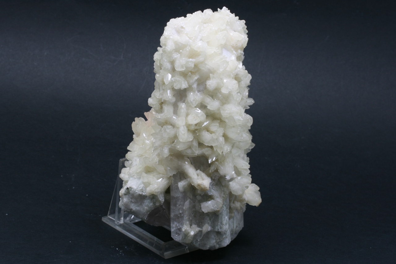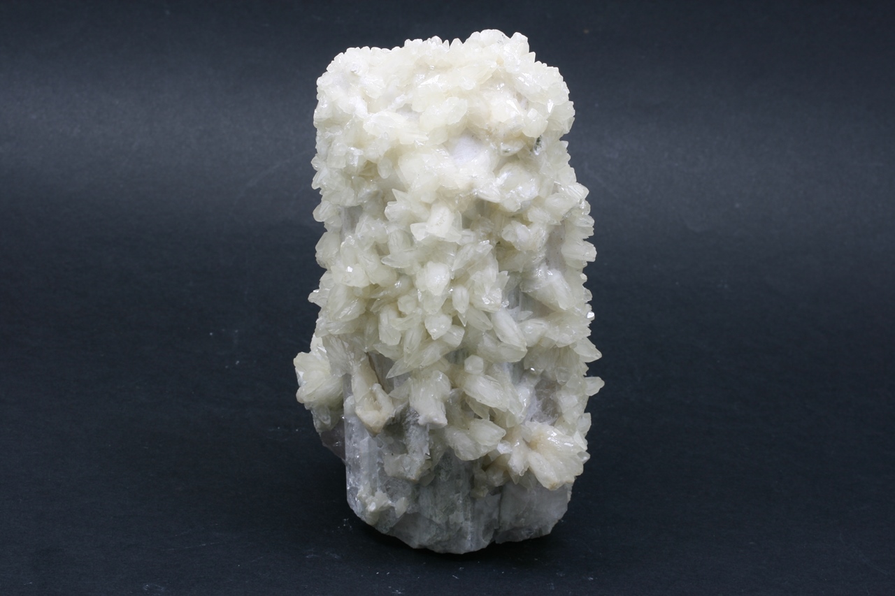 Twinning of two Danburite crystals (the larger one is 15 cm, the smaller one is 9 cm) covered with white Calcite crystals.