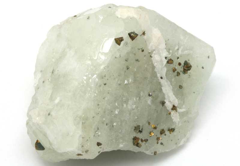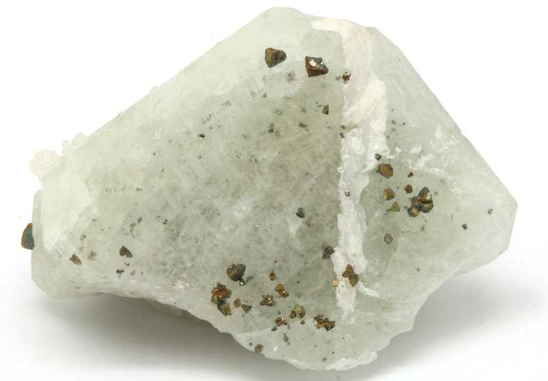 A very nice specimen of the not-so-common borosilicate datolite overgrown with crystals of chalcopyrite from Mexico. A loose crystal of light green datolite with crystals of chalcopyrite attached to it.